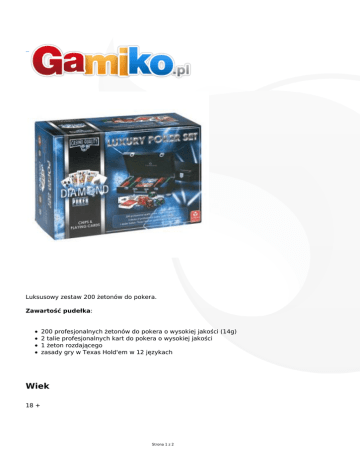 Luksusowy zestaw 200 żetonów do pokera. Zawartość pudełka: 200 profesjonalnych żetonów do pokera o wysokiej jakości (14g) 2 talie profesjonalnych kart do pokera o wysokiej jakości 1 żeton rozdającego zasady gry w Texas Hold'em w 12 językach Wiek 18 + Strona 1 z 2 Liczba graczy 1-8 Instrukcja polska Wydanie międzynarodowe Producent Cartamundi Strona 2 z 2