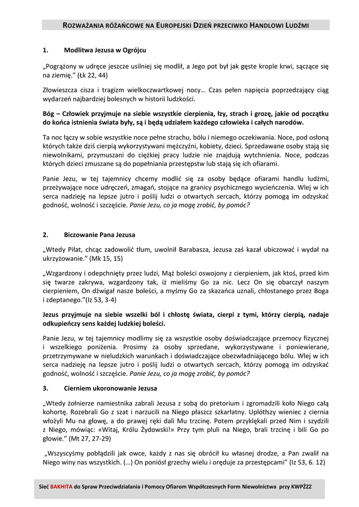 ROZWAŻANIA RÓŻAŃCOWE NA EUROPEJSKI DZIEŃ PRZECIWKO HANDLOWI LUDŹMI 1. Modlitwa Jezusa w Ogrójcu „Pogrążony w udręce jeszcze usilniej się modlił, a Jego pot był jak gęste krople krwi, sączące się na ziemię.” (Łk 22, 44) Złowieszcza cisza i tragizm wielkoczwartkowej nocy… Czas pełen napięcia poprzedzający ciąg wydarzeń najbardziej bolesnych w historii ludzkości. Bóg – Człowiek przyjmuje na siebie wszystkie cierpienia, łzy, strach i grozę, jakie od początku do końca istnienia świata były, są i będą udziałem każdego człowieka i całych narodów. Ta noc łączy w sobie wszystkie noce pełne strachu, bólu i niemego oczekiwania. Noce, pod osłoną których także dziś cierpią wykorzystywani mężczyźni, kobiety, dzieci. Sprzedawane osoby stają się niewolnikami, przymuszani do ciężkiej pracy ludzie nie znajdują wytchnienia. Noce, podczas których dzieci zmuszane są do popełniania przestępstw lub stają się ich ofiarami. Panie Jezu, w tej tajemnicy chcemy modlić się za osoby będące ofiarami handlu ludźmi, przeżywające noce udręczeń, zmagań, stojące na granicy psychicznego wycieńczenia. Wlej w ich serca nadzieję na lepsze jutro i poślij ludzi o otwartych sercach, którzy pomogą im odzyskać godność, wolność i szczęście. Panie Jezu, co ja mogę zrobić, by pomóc? 2. Biczowanie Pana Jezusa „Wtedy Piłat, chcąc zadowolić tłum, uwolnił Barabasza, Jezusa zaś kazał ubiczować i wydał na ukrzyżowanie.” (Mk 15, 15) „Wzgardzony i odepchnięty przez ludzi, Mąż boleści oswojony z cierpieniem, jak ktoś, przed kim się twarze zakrywa, wzgardzony tak, iż mieliśmy Go za nic. Lecz On się obarczył naszym cierpieniem, On dźwigał nasze boleści, a myśmy Go za skazańca uznali, chłostanego przez Boga i zdeptanego.”(Iz 53, 3-4) Jezus przyjmuje na siebie wszelki ból i chłostę świata, cierpi z tymi, którzy cierpią, nadaje odkupieńczy sens każdej ludzkiej boleści. Panie Jezu, w tej tajemnicy modlimy się za wszystkie osoby doświadczające przemocy fizycznej i wszelkiego poniżenia. Prosimy za osoby sprzedane, wykorzystywane i poniewierane, przetrzymywane w nieludzkich warunkach i doświadczające obezwładniającego bólu. Wlej w ich serca nadzieję na lepsze jutro i poślij ludzi o otwartych sercach, którzy pomogą im odzyskać godność, wolność i szczęście. Panie Jezu, co ja mogę zrobić, by pomóc? 3. Cierniem ukoronowanie Jezusa „Wtedy żołnierze namiestnika zabrali Jezusa z sobą do pretorium i zgromadzili koło Niego całą kohortę. Rozebrali Go z szat i narzucili na Niego płaszcz szkarłatny. Uplótłszy wieniec z ciernia włożyli Mu na głowę, a do prawej ręki dali Mu trzcinę. Potem przyklękali przed Nim i szydzili z Niego, mówiąc: «Witaj, Królu Żydowski!» Przy tym pluli na Niego, brali trzcinę i bili Go po głowie.” (Mt 27, 27-29) „Wszyscyśmy pobłądzili jak owce, każdy z nas się obrócił ku własnej drodze, a Pan zwalił na Niego winy nas wszystkich. (…) On poniósł grzechy wielu i oręduje za przestępcami” (Iz 53, 6. 12) Sieć BAKHITA do Spraw Przeciwdziałania i Pomocy Ofiarom Współczesnych Form Niewolnictwa przy KWPŻZZ ROZWAŻANIA RÓŻAŃCOWE NA EUROPEJSKI DZIEŃ PRZECIWKO HANDLOWI LUDŹMI Jezus przyjmuje na siebie wszelki grzech świata. Sam będąc bez grzechu zbawia grzesznika, daje nadzieję nawrócenia, pokuty i życia wiecznego. Panie Jezu, w tej tajemnicy modlimy się za wszystkich sprawców przemocy, handlu ludźmi i wszelkiego wykorzystania. Udziel im łaski nawrócenia i wskaż możliwości wynagrodzenia dobrem za popełnione zło. Niech spotkają w swoim życiu Ciebie, napełnij ich serca żalem i skruchą. Spraw, by ufając Twojemu miłosierdziu nie popadli w rozpacz lecz otworzyli serca na miłość. Panie Jezu, co ja mogę zrobić, by pomóc? 4. Droga krzyżowa Jezusa „Jak baranek na rzeź prowadzony, jak owca niema wobec strzygących ją, tak On nie otworzył ust swoich… Zacny mój Sługa usprawiedliwi wielu, ich nieprawości On sam dźwigać będzie.” (Iz 53, 7. 11) Droga krzyżowa… Wydaje się, jakby się nigdy nie miała skończyć… Ból, trud, pragnienie…, to wszystko jednak przeminie, zamieni się w radość zmartwychwstania. Teraz nie widać jeszcze nadziei… W tajemnicy drogi krzyżowej Jezus przyjmuje na siebie cały trud i znój świata. W swojej drodze skupia wszystkie drogi cierpienia. Panie Jezu, w tej tajemnicy modlimy się za ludzi zmuszanych do pracy w niewolniczych warunkach. Ty widzisz i rozumiesz każdy dzień ich nadludzkiego trudu, każdy wysiłek woli, by uczynić kolejny krok. Widzisz jak są pogardzani, znieważani, poniżani… Wlej w ich serca nadzieję na lepsze jutro i poślij ludzi o otwartych sercach, którzy pomogą im odzyskać godność, wolność i szczęście. Panie Jezu, co ja mogę zrobić, by pomóc? 5. Śmierć Jezusa na krzyżu „Wtedy Jezus zawołał donośnym głosem: Ojcze, w Twoje ręce powierzam ducha mojego. Po tych słowach wyzionął ducha.” (Łk 23,46) „Po udręce i sądzie został usunięty; a kto się przejmuje Jego losem? Tak! Zgładzono Go z krainy żyjących; za grzechy mego ludu został zbity na śmierć.” (Iz 53, 8) Jezus przyjął także śmierć. Nie tylko przyjął, ale uczynił z niej bramę do życia wiecznego w niebie. Czeka tam na wszystkie swoje dzieci. Czeka na utrudzonych, cierpiących, na sprzedanych i krzywdzonych. Zło nie jest ostatnim słowem. Ostatnim słowem jest Miłość. To ona zwycięża. Krzyż i śmierć Jezusa nie były przegraną, lecz stały się ostatecznym pokonaniem zła, śmierci i zwycięstwem miłości. Panie Jezu, w Twoje ręce powierzamy ludzi sprzedawanych, krzywdzonych, poniżanych, głodnych, wykorzystywanych, którzy umierają w nieludzkich warunkach. Niech na progu wieczności spotkają Ciebie i już na zawsze cieszą się szczęściem i wolnością dzieci Bożych. Panie Jezu, co ja mogę zrobić, by pomóc? Tekst rozwa