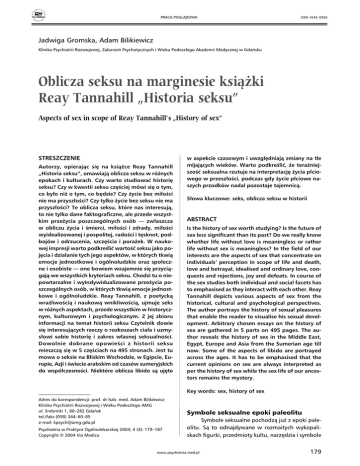 PRACA POGLĄDOWA ISSN 1643–0956 Jadwiga Gromska, Adam Bilikiewicz Klinika Psychiatrii Rozwojowej, Zaburzeń Psychotycznych i Wieku Podeszłego Akademii Medycznej w Gdańsku Oblicza seksu na marginesie książki Reay Tannahill „Historia seksu” Aspects of sex in scope of Reay Tannahill’s „History of sex” STRESZCZENIE Autorzy, opierając się na książce Reay Tannahill „Historia seksu”, omawiają oblicza seksu w różnych epokach i kulturach. Czy warto studiować historię seksu? Czy w kwestii seksu częściej mówi się o tym, co było niż o tym, co będzie? Czy życie bez miłości nie ma przyszłości? Czy tylko życie bez seksu nie ma przyszłości? Te oblicza seksu, które nas interesują, to nie tylko dane faktograficzne, ale przede wszystkim przeżycia poszczególnych osób — zwłaszcza w obliczu życia i śmierci, miłości i zdrady, miłości wyidealizowanej i pospolitej, radości i tęsknot, podbojów i odrzucenia, szczęścia i porażek. W naukowej impresji warto podkreślić wartość seksu jako pojęcia i działanie tych jego aspektów, w których tkwią emocje jednostkowe i ogólnoludzkie oraz społeczne i osobiste — one bowiem wzajemnie się przyciągają we wszystkich kryteriach seksu. Chodzi tu o niepowtarzalne i wyindywidualizowane przeżycia poszczególnych osób, w których tkwią emocje jednostkowe i ogólnoludzkie. Reay Tannahill, z poetycką wrażliwością i naukową wnikliwością, ujmuje seks w różnych aspektach, przede wszystkim w historycznym, kulturowym i psychologicznym. Z jej zbioru informacji na temat historii seksu Czytelnik dowie się interesujących rzeczy o rozkoszach ciała i uzmysłowi sobie historię i zakres własnej seksualności. Dowolnie dobrane opowieści z historii seksu mieszczą się w 5 częściach na 495 stronach. Jest tu mowa o seksie na Bliskim Wschodzie, w Egipcie, Europie, Azji i świecie arabskim od czasów sumeryjskich do współczesności. Niektóre oblicza libido są ujęte w aspekcie czasowym i uwzględniają zmiany na tle mijających wieków. Warto podkreślić, że teraźniejszość seksualna rzutuje na interpretację życia płciowego w przeszłości, podczas gdy życie płciowe naszych przodków nadal pozostaje tajemnicą. Słowa kluczowe: seks, oblicza seksu w historii ABSTRACT Is the history of sex worth studying? Is the future of sex less significant than its past? Do we really know whether life without love is meaningless or rather life without sex is meaningless? In the field of our interests are the aspects of sex that concentrate on individuals’ perception in scope of life and death, love and betrayal, idealised and ordinary love, conquests and rejections, joy and defeats. In course of the sex studies both individual and social facets has to emphasised as they interact with each other. Reay Tannahill depicts various aspects of sex from the historical, cultural and psychological perspectives. The author portrays the history of sexual pleasures that enable the reader to visualise his sexual development. Arbitrary chosen essays on the history of sex are gathered in 5 parts on 495 pages. The author reveals the history of sex in the Middle East, Egypt, Europe and Asia from the Sumerian age till now. Some of the aspects of libido are portrayed across the ages. It has to be emphasised that the current opinions on sex are always interpreted as per the history of sex while the sex life of our ancestors remains the mystery. Key words: sex, history of sex Adres do korespondencji: prof. dr hab. med. Adam Bilikiewicz Klinika Psychiatrii Rozwojowej i Wieku Podeszłego AMG ul. Srebrniki 1, 80–282 Gdańsk tel./faks (058) 344–60–85 e-mail: [email protected] Psychiatria w Praktyce Ogólnolekarskiej 2004; 4 (4): 179–187 Copyright © 2004 Via Medica Symbole seksualne epoki paleolitu Symbole seksualne pochodzą już z epoki paleolitu. Są to odnajdywane w rozmaitych wykopaliskach figurki, przedmioty kultu, narzędzia i symbole www.psychiatria.med.pl 179 Psychiatria w Praktyce Ogólnolekarskiej 2004, tom 4, nr 4 płodności. Ich seksualny charakter nie budzi najmniejszych wątpliwości, zwłaszcza charakterystyczne figurki Wenus. W dziełach sztuki paleolitu mężczyzn przedstawia się głównie za pomocą symboli fallicznych, kobiety jako Wenus (partnerka seksualna). Figurki Wenus to magiczna inwokacja płodności. Nie można więc wykluczyć, że Wenus spełniała dokładnie taką samą rolę jak współczesna „panienka” na rozkładówce Playboya. Twarz musiała pozostać nierozpoznawalna, aby dzieło nie sprowadziło na nią nieszczęścia. Dwanaście tysięcy lat temu mężczyźni i kobiety pozostawali w całkowitej zależności od środowiska. Dopiero w neolicie ludzie zaczęli się osiedlać na stałe. Ten, kto dotarł na miejsce obfitości, pozostawał tam; dzięki temu powstały pierwsze ludzkie osady. Zaczęła się praca i obowiązki, powodując konieczność wszechstronnego myślenia, a zwłaszcza wnioskowania. Przez setki lat kobieta miała zbyt dużo zajęć i pracy, by zajmować się filozofowaniem, natomiast mężczyzna uganiał się za zwierzyną, miał więc czas na konstruktywne myślenie. Człowiek uwierzył w siebie. Mężczyzna doznał objawienia, ponieważ objawieniem była jego własna rola w prokreacji. znanych nam cywilizacji, faworyzowały mężczyzn pod każdym względem. Kobiety przywiązano do domu, zamknięto w rodzinie. Obecność w historii dam, takich jak królowa Egiptu — Hatszepsut, Meryetnit, Eje, lub biblijnych wyjątków — Jezabel czy Tamar tylko potwierdza tę regułę. Pewną niezależność i pieniądze mogły mieć tylko kobiety poświęcające się służbie bogom, inne pozostawały uległymi służebnicami, mając niewielkie możliwości w zakresie działalności publicznej, a duże możliwości niemal wyłącznie w pracy fizycznej. Ogólnie mówiąc, status tak zwanych wolnych Egipcjanek, Żydówek czy mieszkanek Babilonii był tylko odrobinę lepszy niż nie