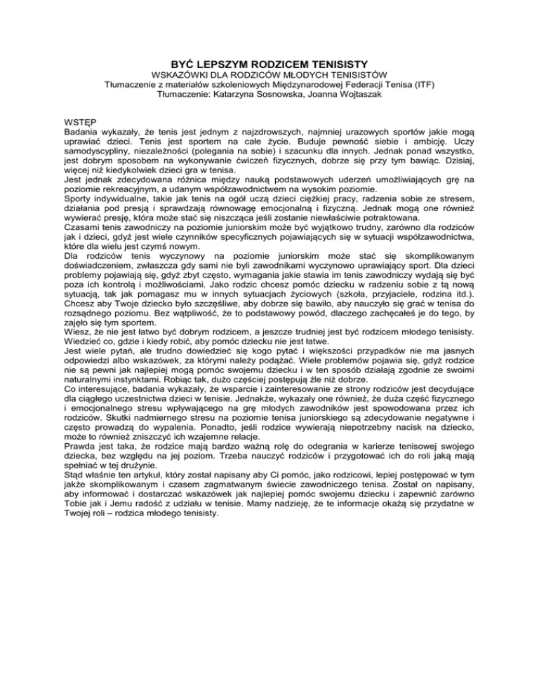 BYĆ LEPSZYM RODZICEM TENISISTY WSKAZÓWKI DLA RODZICÓW MŁODYCH TENISISTÓW Tłumaczenie z materiałów szkoleniowych Międzynarodowej Federacji Tenisa (ITF) Tłumaczenie: Katarzyna Sosnowska, Joanna Wojtaszak WSTĘP Badania wykazały, że tenis jest jednym z najzdrowszych, najmniej urazowych sportów jakie mogą uprawiać dzieci. Tenis jest sportem na całe życie. Buduje pewność siebie i ambicję. Uczy samodyscypliny, niezależności (polegania na sobie) i szacunku dla innych. Jednak ponad wszystko, jest dobrym sposobem na wykonywanie ćwiczeń fizycznych, dobrze się przy tym bawiąc. Dzisiaj, więcej niż kiedykolwiek dzieci gra w tenisa. Jest jednak zdecydowana różnica między nauką podstawowych uderzeń umożliwiających grę na poziomie rekreacyjnym, a udanym współzawodnictwem na wysokim poziomie. Sporty indywidualne, takie jak tenis na ogół uczą dzieci ciężkiej pracy, radzenia sobie ze stresem, działania pod presją i sprawdzają równowagę emocjonalną i fizyczną. Jednak mogą one również wywierać presję, która może stać się niszcząca jeśli zostanie niewłaściwie potraktowana. Czasami tenis zawodniczy na poziomie juniorskim może być wyjątkowo trudny, zarówno dla rodziców jak i dzieci, gdyż jest wiele czynników specyficznych pojawiających się w sytuacji współzawodnictwa, które dla wielu jest czymś nowym. Dla rodziców tenis wyczynowy na poziomie juniorskim może stać się skomplikowanym doświadczeniem, zwłaszcza gdy sami nie byli zawodnikami wyczynowo uprawiający sport. Dla dzieci problemy pojawiają się, gdyż zbyt często, wymagania jakie stawia im tenis zawodniczy wydają się być poza ich kontrolą i możliwościami. Jako rodzic chcesz pomóc dziecku w radzeniu sobie z tą nową sytuacją, tak jak pomagasz mu w innych sytuacjach życiowych (szkoła, przyjaciele, rodzina itd.). Chcesz aby Twoje dziecko było szczęśliwe, aby dobrze się bawiło, aby nauczyło się grać w tenisa do rozsądnego poziomu. Bez wątpliwość, że to podstawowy powód, dlaczego zachęcałeś je do tego, by zajęło się tym sportem. Wiesz, że nie jest łatwo być dobrym rodzicem, a jeszcze trudniej jest być rodzicem młodego tenisisty. Wiedzieć co, gdzie i kiedy robić, aby pomóc dziecku nie jest łatwe. Jest wiele pytań, ale trudno dowiedzieć się kogo pytać i większości przypadków nie ma jasnych odpowiedzi albo wskazówek, za którymi należy podążać. Wiele problemów pojawia się, gdyż rodzice nie są pewni jak najlepiej mogą pomóc swojemu dziecku i w ten sposób działają zgodnie ze swoimi naturalnymi instynktami. Robiąc tak, dużo częściej postępują źle niż dobrze. Co interesujące, badania wykazały, że wsparcie i zainteresowanie ze strony rodziców jest decydujące dla ciągłego uczestnictwa dzieci w tenisie. Jednakże, wykazały one również, że duża część fizycznego i emocjonalnego stresu wpływającego na grę młodych zawodników jest spowodowana przez ich rodziców. Skutki nadmiernego stresu na poziomie tenisa juniorskiego są zdecydowanie negatywne i często prowadzą do wypalenia. Ponadto, jeśli rodzice wywierają niepotrzebny nacisk na dziecko, może to również zniszczyć ich wzajemne relacje. Prawda jest taka, że rodzice mają bardzo ważną rolę do odegrania w karierze tenisowej swojego dziecka, bez względu na jej poziom. Trzeba nauczyć rodziców i przygotować ich do roli jaką mają spełniać w tej drużynie. Stąd właśnie ten artykuł, który został napisany aby Ci pomóc, jako rodzicowi, lepiej postępować w tym jakże skomplikowanym i czasem zagmatwanym świecie zawodniczego tenisa. Został on napisany, aby informować i dostarczać wskazówek jak najlepiej pomóc swojemu dziecku i zapewnić zarówno Tobie jak i Jemu radość z udziału w tenisie. Mamy nadzieję, że te informacje okażą się przydatne w Twojej roli – rodzica młodego tenisisty. OGÓLNA STRUKTURA DŁUGOTERMINOWEGO ROZWOJU TENISISTY Jest kilka aspektów, które zawodnicy powinni rozwijać jeśli chcą osiągnąć niezależność i sukcesu w tenisie na poziomie zawodniczym. W poniższej tabeli przedstawiono główną charakterystykę poszczególnych poziomów rozwoju zawodnika. Informacje zawarte w tabeli dają rodzicom możliwość zapoznania się z prawdopodobnymi zobowiązaniami i sytuacjami z jakimi zetknie się ich dziecko uprawiające tenis. wiek 6-8 9-10 11-12 13-15 16-18 i pow. Stosunek tenisa do innych zajęć (%) 30:70 50:50 55:45 65:35 70:30 Kondycja fizyczna, rozwój ogólny, koordynacyjny i ruchowy · udział w wielu różnych sportach · staraj się rozwijać ogólną koordynację · około 2,5 godz./tyg. · udział w sportach piłkowych, np. koszykówka, piłka nożna · rozwój pracy nóg i umiejętności poruszania się · około 4,5 godz./tyg. · Rozwój szybkości reakcji, gibkości, trening siły · Udział w sportach uzupełniających · Około 5 godz./tyg. · rozwój wytrzymałości szybkościowej, siły · udział w sportach uzupełniających · około 8 godz./tyg. · pełen rozwój wytrzymałości tlenowej, trening siły · około 8 godz./tyg. Trening rozwoju technicznotaktycznego · współpraca z partnerem · utrzymanie piłki w grze · około 1,5 godz./tyg. Współzawodnictwo i trening sytuacji meczowych · współzawodnictwo w drużynach minitenisowych · rozwój surowych · około 15 singli i 30 form wszystkich debli rocznie uderzeń · turnieje grupowe · wprowadzenie wszystkich faz taktycznych gry · około 4,5 godz./tyg. · rozwój atakującego stylu gry i strategii · doskonalenie uderzeń i techniki · około 6 godz./tyg. · rozwój siły serwisu i uderzeń po koźle · rozwój własnego lecz akceptowalnego stylu gry · około 12 godz./tyg. · pełen rozwój indywidualnego stylu · dalszy rozwój uderzeń po koźle · około 15-20 godz./tyg. Rola/udział trenera · duży ilość różnorodnych zabaw, gier dowolnych i kreatywności · wymagana dobra umiejętność demonstrowania · 50 si