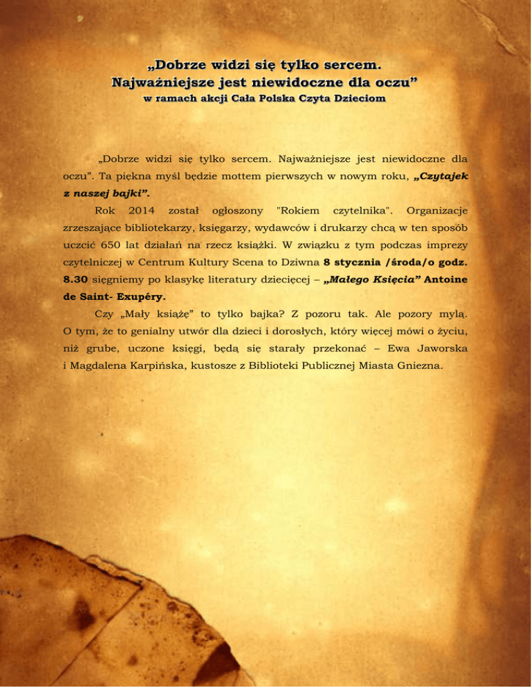 „„D Doobbrrzzee w wiid dzzii ssiięę ttyyllk koo sseerrcceem m.. N Naajjw waażżn niieejjsszzee jjeesstt n niieew wiid doocczzn nee d dllaa oocczzu u”” w w rraam maacch h aakkccjjii C Caałłaa PPoollsskkaa C Czzyyttaa D Dzziieecciioom m „Dobrze widzi się tylko sercem. Najważniejsze jest niewidoczne dla oczu”. Ta piękna myśl będzie mottem pierwszych w nowym roku, „Czytajek z naszej bajki”. Rok 2014 został ogłoszony "Rokiem czytelnika". Organizacje zrzeszające bibliotekarzy, księgarzy, wydawców i drukarzy chcą w ten sposób uczcić 650 lat działań na rzecz książki. W związku z tym podczas imprezy czytelniczej w Centrum Kultury Scena to Dziwna 8 stycznia /środa/o godz. 8.30 sięgniemy po klasykę literatury dziecięcej – „Małego Księcia” Antoine de Saint- Exupéry. Czy „Mały książę” to tylko bajka? Z pozoru tak. Ale pozory mylą. O tym, że to genialny utwór dla dzieci i dorosłych, który więcej mówi o życiu, niż grube, uczone księgi, będą się starały przekonać – Ewa Jaworska i Magdalena Karpińska, kustosze z Biblioteki Publicznej Miasta Gniezna.