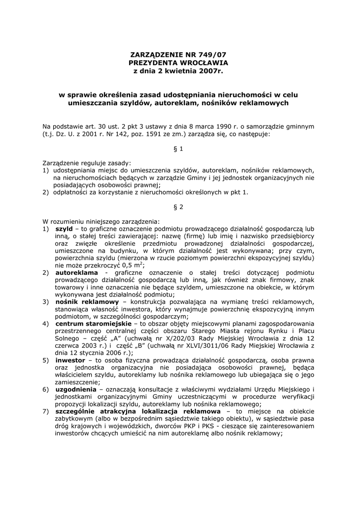 ZARZĄDZENIE NR 749/07 PREZYDENTA WROCŁAWIA z