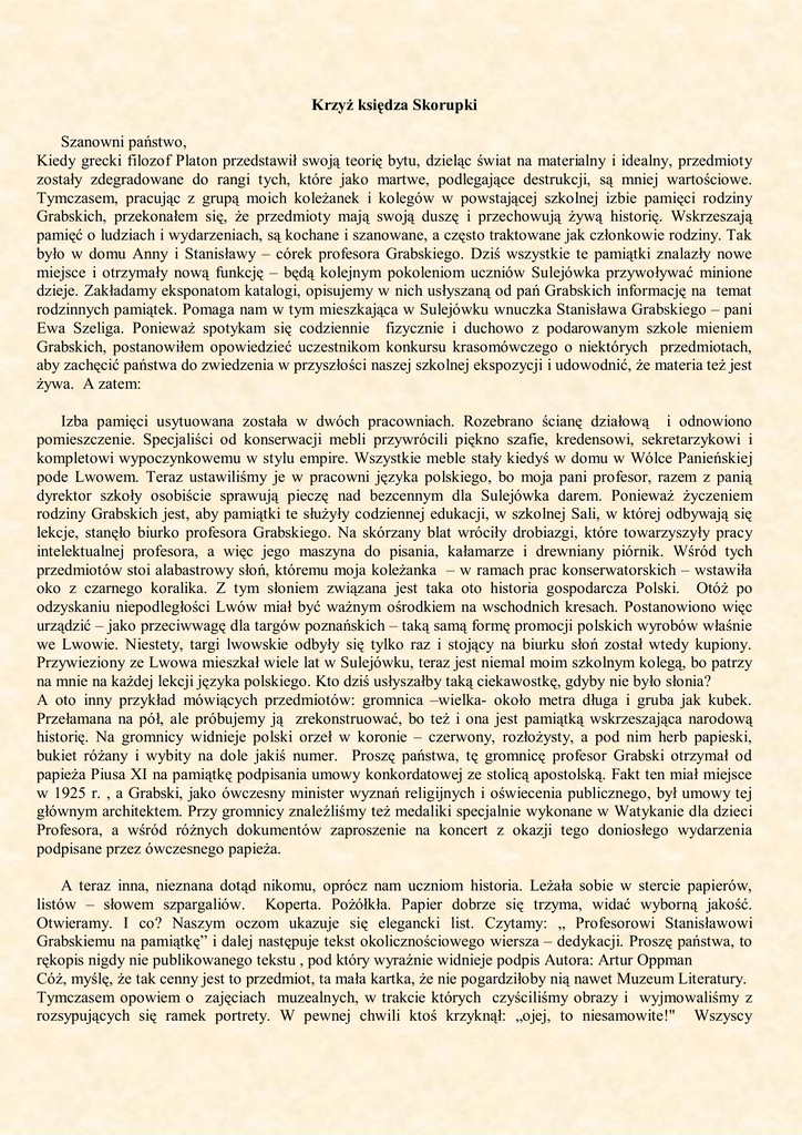 Krzyż księdza Skorupki Szanowni państwo, Kiedy grecki filozof Platon przedstawił swoją teorię bytu, dzieląc świat na materialny i idealny, przedmioty zostały zdegradowane do rangi tych, które jako martwe, podlegające destrukcji, są mniej wartościowe. Tymczasem, pracując z grupą moich koleżanek i kolegów w powstającej szkolnej izbie pamięci rodziny Grabskich, przekonałem się, że przedmioty mają swoją duszę i przechowują żywą historię. Wskrzeszają pamięć o ludziach i wydarzeniach, są kochane i szanowane, a często traktowane jak członkowie rodziny. Tak było w domu Anny i Stanisławy – córek profesora Grabskiego. Dziś wszystkie te pamiątki znalazły nowe miejsce i otrzymały nową funkcję – będą kolejnym pokoleniom uczniów Sulejówka przywoływać minione dzieje. Zakładamy eksponatom katalogi, opisujemy w nich usłyszaną od pań Grabskich informację na temat rodzinnych pamiątek. Pomaga nam w tym mieszkająca w Sulejówku wnuczka Stanisława Grabskiego – pani Ewa Szeliga. Ponieważ spotykam się codziennie fizycznie i duchowo z podarowanym szkole mieniem Grabskich, postanowiłem opowiedzieć uczestnikom konkursu krasomówczego o niektórych przedmiotach, aby zachęcić państwa do zwiedzenia w przyszłości naszej szkolnej ekspozycji i udowodnić, że materia też jest żywa. A zatem: Izba pamięci usytuowana została w dwóch pracowniach. Rozebrano ścianę działową i odnowiono pomieszczenie. Specjaliści od konserwacji mebli przywrócili piękno szafie, kredensowi, sekretarzykowi i kompletowi wypoczynkowemu w stylu empire. Wszystkie meble stały kiedyś w domu w Wólce Panieńskiej pode Lwowem. Teraz ustawiliśmy je w pracowni języka polskiego, bo moja pani profesor, razem z panią dyrektor szkoły osobiście sprawują pieczę nad bezcennym dla Sulejówka darem. Ponieważ życzeniem rodziny Grabskich jest, aby pamiątki te służyły codziennej edukacji, w szkolnej Sali, w której odbywają się lekcje, stanęło biurko profesora Grabskiego. Na skórzany blat wróciły drobiazgi, które towarzyszyły pracy intelektualnej profesora, a więc jego maszyna do pisania, kałamarze i drewniany piórnik. Wśród tych przedmiotów stoi alabastrowy słoń, któremu moja koleżanka – w ramach prac konserwatorskich – wstawiła oko z czarnego koralika. Z tym słoniem związana jest taka oto historia gospodarcza Polski. Otóż po odzyskaniu niepodległości Lwów miał być ważnym ośrodkiem na wschodnich kresach. Postanowiono więc urządzić – jako przeciwwagę dla targów poznańskich – taką samą formę promocji polskich wyrobów właśnie we Lwowie. Niestety, targi lwowskie odbyły się tylko raz i stojący na biurku słoń został wtedy kupiony. Przywieziony ze Lwowa mieszkał wiele lat w Sulejówku, teraz jest niemal moim szkolnym kolegą, bo patrzy na mnie na każdej lekcji języka polskiego. Kto dziś usłyszałby taką ciekawostkę, gdyby nie było słonia? A oto inny przykład mówiących przedmiotów: gromnica –wielka- około metra długa i gruba jak kubek. Przełamana na pół, ale próbujemy ją zrekonstruować, bo też i ona jest pamiątką wskrzeszająca narodową historię. Na gromnicy widnieje polski orzeł w koronie – czerwony, rozłożysty, a pod nim herb papieski, bukiet różany i wybity na dole jakiś numer. Proszę państwa, tę gromnicę profesor Grabski otrzymał od papieża Piusa XI na pamiątkę podpisania umowy konkordatowej ze stolicą apostolską. Fakt ten miał miejsce w 1925 r. , a Grabski, jako ówczesny minister wyznań religijnych i oświecenia publicznego, był umowy tej głównym architektem. Przy gromnicy znaleźliśmy też medaliki specjalnie wykonane w Watykanie dla dzieci Profesora, a wśród różnych dokumentów zaproszenie na koncert z okazji tego doniosłego wydarzenia podpisane przez ówczesnego papieża. A teraz inna, nieznana dotąd nikomu, oprócz nam uczniom historia. Leżała sobie w stercie papierów, listów – słowem szpargaliów. Koperta. Pożółkła. Papier dobrze się trzyma, widać wyborną jakość. Otwieramy. I co? Naszym oczom ukazuje się elegancki list. Czytamy: „ Profesorowi Stanisławowi Grabskiemu na pamiątkę” i dalej następuje tekst okolicznościowego wiersza – dedykacji. Proszę państwa, to rękopis nigdy nie publikowanego tekstu , pod który wyraźnie widnieje podpis Autora: Artur Oppman Cóż, myślę, że tak cenny jest to przedmiot, ta mała kartka, że nie pogardziłoby nią nawet Muzeum Literatury. Tymczasem opowiem o zajęciach muzealnych, w trakcie których czyściliśmy obrazy i wyjmowaliśmy z rozsypujących się ramek portrety. W pewnej chwili ktoś krzyknął: „ojej, to niesamowite!" Wszyscy skierowaliśmy wzrok w stronę osoby „rozbierającej” obrazek. Naszym oczom ukazało się zdjęcie z pierwszego posiedzenia rządu Wincentego Witosa. Premier w środku, obok niego, wśród ministrów Stanisław Grabski. Zdjęcie bezpiecznie przeżyło wszystkie dziejowe zawieruchy jako passe - partout kresowego pejzażu. Dziś, oprawione w nowe, własne ramki będzie służyć jako nauczyciel historii. Kolejne nasze odkrycie związane jest z malutkim metalowym samolocikiem, takim, co to w klapie marynarki noszą mężczyźni. Pani Anna mówiła, że należał do jej brata Zbigniewa, który był instruktorem lotnictwa. Prowadził tak znaną szkołę pilotażu, że Marszałek Piłsudski właśnie jemu powierzył kształcenie swojej córki Jadwigi na pilota. Kiedy Zbigniew dowiedział się, że przyjedzie do jego placówki panna Jagoda, postawił na baczność wszystkich swych uczniów, przygotował na stacji, gdzie nowa uczennica miała wysiąść prawdziwie piękne powitanie: kwiaty, orkiestra, przemówienie… Pociąg nadjechał, gościa nie przywiózł. Z nosem na kwintę spuszczonym wracają wszyscy do bazy, a tam skromniutka Jagoda staje na baczność i posłusznie melduje swoje przybycie. Okazało się, że nie chciała robić zamieszania i wysia