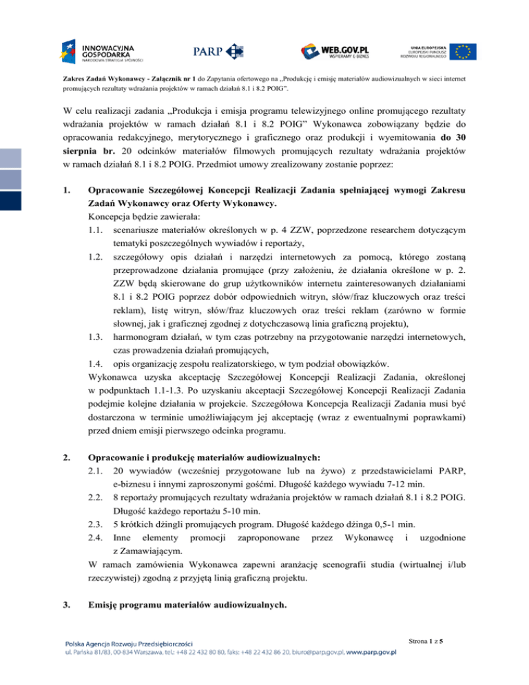 Zakres Zadań Wykonawcy - Załącznik nr 1 do Zapytania ofertowego na „Produkcję i emisję materiałów audiowizualnych w sieci internet promujących rezultaty wdrażania projektów w ramach działań 8.1 i 8.2 POIG”. W celu realizacji zadania „Produkcja i emisja programu telewizyjnego online promującego rezultaty wdrażania projektów w ramach działań 8.1 i 8.2 POIG” Wykonawca zobowiązany będzie do opracowania redakcyjnego, merytorycznego i graficznego oraz produkcji i wyemitowania do 30 sierpnia br. 20 odcinków materiałów filmowych promujących rezultaty wdrażania projektów w ramach działań 8.1 i 8.2 POIG. Przedmiot umowy zrealizowany zostanie poprzez: 1. Opracowanie Szczegółowej Koncepcji Realizacji Zadania spełniającej wymogi Zakresu Zadań Wykonawcy oraz Oferty Wykonawcy. Koncepcja będzie zawierała: 1.1. scenariusze materiałów określonych w p. 4 ZZW, poprzedzone researchem dotyczącym tematyki poszczególnych wywiadów i reportaży, 1.2. szczegółowy opis działań i narzędzi internetowych za pomocą, którego zostaną przeprowadzone działania promujące (przy założeniu, że działania określone w p. 2. ZZW będą skierowane do grup użytkowników internetu zainteresowanych działaniami 8.1 i 8.2 POIG poprzez dobór odpowiednich witryn, słów/fraz kluczowych oraz treści reklam), listę witryn, słów/fraz kluczowych oraz treści reklam (zarówno w formie słownej, jak i graficznej zgodnej z dotychczasową linia graficzną projektu), 1.3. harmonogram działań, w tym czas potrzebny na przygotowanie narzędzi internetowych, czas prowadzenia działań promujących, 1.4. opis organizację zespołu realizatorskiego, w tym podział obowiązków. Wykonawca uzyska akceptację Szczegółowej Koncepcji Realizacji Zadania, określonej w podpunktach 1.1-1.3. Po uzyskaniu akceptacji Szczegółowej Koncepcji Realizacji Zadania podejmie kolejne działania w projekcie. Szczegółowa Koncepcja Realizacji Zadania musi być dostarczona w terminie umożliwiającym jej akceptację (wraz z ewentualnymi poprawkami) przed dniem emisji pierwszego odcinka programu. 2. Opracowanie i produkcję materiałów audiowizualnych: 2.1. 20 wywiadów (wcześniej przygotowane lub na żywo) z przedstawicielami PARP, e-biznesu i innymi zaproszonymi gośćmi. Długość każdego wywiadu 7-12 min. 2.2. 8 reportaży promujących rezultaty wdrażania projektów w ramach działań 8.1 i 8.2 POIG. Długość każdego reportażu 5-10 min. 2.3. 5 krótkich dżingli promujących program. Długość każdego dżinga 0,5-1 min. 2.4. Inne elementy promocji zaproponowane przez Wykonawcę i uzgodnione z Zamawiającym. W ramach zamówienia Wykonawca zapewni aranżację scenografii studia (wirtualnej i/lub rzeczywistej) zgodną z przyjętą linią graficzną projektu. 3. Emisję programu materiałów audiowizualnych. Strona 1 z 5 Wyemitowanie materiałów w terminie od dnia podpisania umowy do dnia 30 sierpnia 2013 r. w 20 blokach tematycznych (16 bloków 7-13 minutowych i 4 bloki minimum godzinne) w tym zapewnienie transmisji on-line (wg minimalnych wymagań określonych w p. 5) na żywo i/lub z odtworzenia na portalach: (1) www.web.gov.pl, (2) wskazanych w Ofercie, (3) innych, jeśli zostaną zapewnione w toku dalszych prac (zgodnie przez Wykonawcę lub Zamawiającego). 4. Przeprowadzenie transmisji on-line: Wykonawca zobowiązany będzie do: 4.1. Przeprowadzenia transmisji streamingowych w internecie, każdorazowo przy założeniu zapewnienia możliwości jednoczesnego korzystania z transmisji dla minimum 1000 użytkowników, dla portalu www.web.gov.pl oraz parametrów umożliwiających niezakłócone korzystanie z transmisji na portalu/portalach przedstawionych w ofercie przez zakładaną w ofercie liczbę osób. 4.2. Zapewnienia jakości dźwięku i obrazu: 4.2.1. Format 16:9, 4.2.2. Wielkość okna wideo to minimum 640x360 pikseli, 4.2.3. Bitrate obrazu, co najmniej 400 kb/s, 4.2.4. Dźwięk stereo, bitrate, co najmniej 96 kb/s, 4.2.5. Odtwarzacz musi zapewniać możliwość regulacji poziomu dźwięku, 4.2.6. Odtwarzacz musi zapewniać możliwość odtwarzania pełnoekranowego, 4.3. Oznaczenia emitowanych materiałów kodem Google Analitics dostarczonym przez Zamawiającego, tak, aby możliwa była weryfikacja wskaźnika określonego w p. 5. ZZW. 4.4. Oznaczenia emitowanych materiałów logotypem Zamawiającego (w czasie trwania całej transmisji). 4.5. Zapewnienia widzom możliwości brania aktywnego udziału w dyskusji poprzez zadawanie prelegentom pytań, w oknie wyświetlanym obok ekranu wideo. Wykonawca zapewni moderatorowi lub prelegentowi możliwość wglądu w pytania widzów w czasie rzeczywistym. 4.6. Montażu urządzeń i okablowania do transmisji danych, 4.7. Skontaktowania się, najpóźniej 3 dni robocze od dnia podpisania umowy, ze wskazanym pracownikiem Zamawiającego odpowiedzialnym za prowadzenie portalu web.gov.pl w celu dostarczenia kodu html odtwarzacza do osadzenia w artykule na stronie www, za pomocą, którego przeprowadzane będą transmisje internetowe. Wizualizacja odtwarzacza winna być spójna z przyjętą linią graficzną projektu. W tym samym dniu Zamawiający otrzyma od Wykonawcy plik w formacie PNG o rozmiarach 1920x1080px, który będzie wyświetlany przez odtwarzacz poza czasem transmisji. Najpóźniej 2 dni przed każdą transmisją osoby odpowiedzialne za transmisję ze strony Wykonawcy i Zamawiającego przeprowadzą testy poprawności zaimplementowania odtwarzacza i prawidłowości wyświetlania strumienia transmisji. Strona 2 z 5 4.8. 4.9. Przesłania Zamawiającemu na wskazany przez niego adres e-mail raportu statystyk dotyczącego użytkowników transmisji każdego z materiałów w ciągu 48h od zakończenia każdej emisji. Raport aktywności internautów biorących udział w wydarzeniu będzie zawierał następujące dane: 4.8.1. Liczba użytkowników oglądających wydarzenie w całości (w tym osobno ilość unikalnych użytkowników), 4.8.2. Liczba