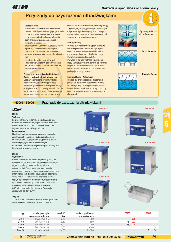 ß Narzędzia specjalne i ochrona pracy Przyrządy do czyszczenia ultradźwiękami Zastosowanie: - czyszczenie ultradźwiękowe jest obecnie najnowocześniejszą technologią czyszczenia - tą metodą uzyskuje się najwyższe wyniki czyszczenia, w trudno dostępnych miejscach, przy najwyższej oszczędności materiału czyszczonego - odpowiednie do usuwania tłuszczów, olejów, topników, materiałów ściernych i polerskich, pozostałości po farbach, warstw tlenku itp. - stosowany w przemyśle, rzemiośle, laboratoriach - przydatny do materiałów żelaznych i nieżelaznych, tworzyw sztucznych, szkła itp. (elementy mechaniczne, elektroniczne, optyczne i medyczne) Pojęcia z czyszczenia ultradźwiękami: Systemy wibracji ultradźwiękowych Specjalnie stworzone systemy wibracji ultradźwiękowych zamieniają energię elektryczną w mechaniczne drgania. Te są przesyłane przez dno wanny ze stali szlachetnej do płynu czyszczącego. Przy tym wytwarzają się najmniejsze pęcherzyki próżniowe 69005 - 69006 w obszarze mikrometrycznym, które implodują z wysoką szybkością (kawitacja). Powstające dzięki temu wysokoenergetyczne przepływy usuwają efektywnie zabrudzenia powierzchni wniesionych w kąpiel czyszczącą. Systemy wibracji ultradźwiękowych Funkcja Sweep Funkcja Sweep służy do ciągłego przesuwania maksymalnych ciśnień akustycznych, przez co zostaje zapewnione jednorodne rozprzestrzenianie się pola akustycznego. Poza tym unika się stojących fal. Prowadzi to do optymalnego rozdzielenia mocy kawitacyjnych i tym samym do optymalnego rozdzielenia wydajności czyszczenia w całej kąpieli czyszczącej i na produktach podlegających czyszczeniu. Funkcja Sweep Funkcja Degas Funkcja Degas i Autodegas Funkcja dla przyspieszenia odgazowania płynów po ponownym napełnieniu komory technologicznej. Dla optymalnego działania kawitacji ultradźwiękowej w cieczy czyszczącej lub w przypadku płynów wspomagających ultradźwięk. Przyrządy do czyszczenia ultradźwiękami V 69005 201 69005 Wykonanie Korpus, wanna, wkładany kosz i pokrywa ze stali szlachetnej. Wbudowane, regulowane termostatycznie ogrzewanie od 30°- 85°C i dawkownik czasu. Wyposażenie w ultradźwięki 35 kHz. Zastosowanie Idealne do odtłuszczania, czyszczenia ze środków docierających, polerskich i bębnujących, olejów do wytłaczania i tłuszczów do ciągnienia, a także wysokowydajnych smarów chłodzących. Dzięki falom ultradźwiękowym następuje oszczędzające i gruntowne oczyszczanie. 69006 101 6 69005 202 69006 Wykonanie Wanna wibracyjna ze specjalnej stali odpornej na kawitację. Duża moc dzięki dodatkowym systemom drgań. 2 poziomy czyszczenia, wysoka moc grzewcza dla krótszych czasów nagrzewania, ogrzewanie odporne na pracę przy niedostatecznym smarowaniu. Praktyczna obsługa dzięki zdejmowanemu kablowi instalacyjnemu zasilacza. Szybki odpływ ze spawanym orurowaniem, moduł chroniący przed kroplami wody. Dawkownik czasu ultradźwięków, dający się regulować w zakresie 0-15 min. oraz ruch nieprzerwany. Regulacja ogrzewania od 30°-80°C. 69006 104 69005 203 Uwaga: Akcesoria na zamówienie. Koncentraty czyszczące ultradźwiękowo zobacz nr kat.69010 - 69014. typ S 30 H S 100 H S 300 H X-tra 30 X-tra 150 wymiar przyrządu wys. x szer. x głęb. mm 265 x 175 x 215 394 x 275 x 372 606 x 405 x 400 360 x 205 x 250 425 x 315 x 350 częściowo z zapasów . ( )- magazynowych. objętość litry 2,75 9,50 28,00 3,00 14,00 wielka częstotliwość maks. stała moc 300 600 1200 2 x 240 2 x 600 Zamówienia Hotline - Fax: 032 205 37 63 69005 … 69006 … 201 F ( ) 202 F ( ) 203 ( ) 101 F ( ) 104 www.hhw.pl 69.1 • Koncentraty czyszczące • Środki do mycia 69010 - 69014 Koncentraty czyszczące ultradźwiękowo V Wykonanie Środki czyszczące Elma Tec Clean są wysokowydajnymi koncentratami, opracowanymi specjalnie do wysokowydajnych aparatów ultradźwiękowych. Oprócz zadania rozwiązywania specjalnych problemów związanych z czyszczeniem przemysłowym należy pamiętać o ochronie wystawionych na silne obciążenie wanien wibracyjnych przyrządów ultradźwiękowych. Ultradźwiękowe wanny wibracyjne poddane są działaniu częstotliwości od 25 do 130 kHz. Ultradźwięk wytwarza przy tym małe pęcherzyki kawitacyjne, które w połączeniu z właściwym środkiem czyszczącym uwalniają zabrudzenie. Wanny wibracyjne ze specjalnej stali szlachetnej narażone są przy tym na silne naprężenia zginające. Środki czyszczące, które nie uwzględniają tego aspektu, zawierają niekiedyjony, które przyspieszają usuwanie materiału lub korozję. Silne korodenty bardzo skracające trwałość to np. jony halogenkowe. Chlorki i fluorki w kwaśnym środowisku są pod tym względem najbardziej agresywne. Elma Tec Clean wydłuża trwałość przyrządów ultradźwiękowych. Uwaga: Przyrządy Elma do czyszczczenia ultradźwiękami zobacz nr kat.69005 - 69006. zawartość l 2,5 10,0 – 6 69040 69010 Elma Tec Clean A1 Zastosowanie Jako środek czyszczący do elektroniki i optyki precyzyjnej. Specjalnie do czyszczenia płytek drukowanych i podzespołów elektromechanicznych. Czyszczenie części z resztek cieczy, odcisków palców lub kurzu. Dawkowanie 3-10 %. 69012 Elma Tec Clean A3 Zastosowanie Idealny do czyszczenia metali i obróbki mechanicznej. Do stali szlachetnej, stali, żelaza, żeliwa szarego, tytanu i metali szlachetnych po toczeniu, frezowaniu, docieraniu, polerowaniu, bębnowaniu, ciągnieniu i tłoczeniu. Łatwo usuwa pasty polerskie, oleje, tłuszcze, wióry itp. także z otworów i trudno dostępnych miejsc. Dawkowanie 3-6 %. na powierzchni kąpieli, potem mogą być one spłukane w przyrządzie ultradźwiękowym z listwą przelewową. Dawkowanie 1-5 %. 69014 Elma Tec Clean A5 Zastosowanie Silny środek czyszczący do żelaza i metalu lekkiego. Środek czyszczący w proszku do usuwania silniejszych zabrudzeń takich jak zżywiczenia, zanieczyszczenia nagarem, resztki smoły ja