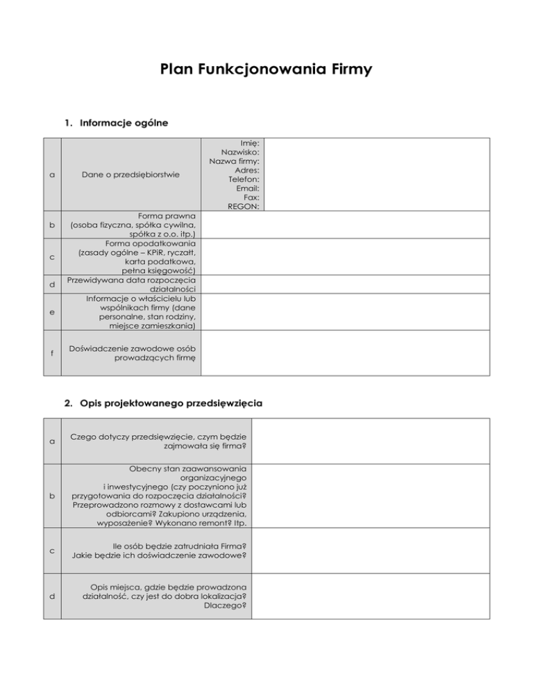 PLAN FUNKCJONOWANIA FIRMY