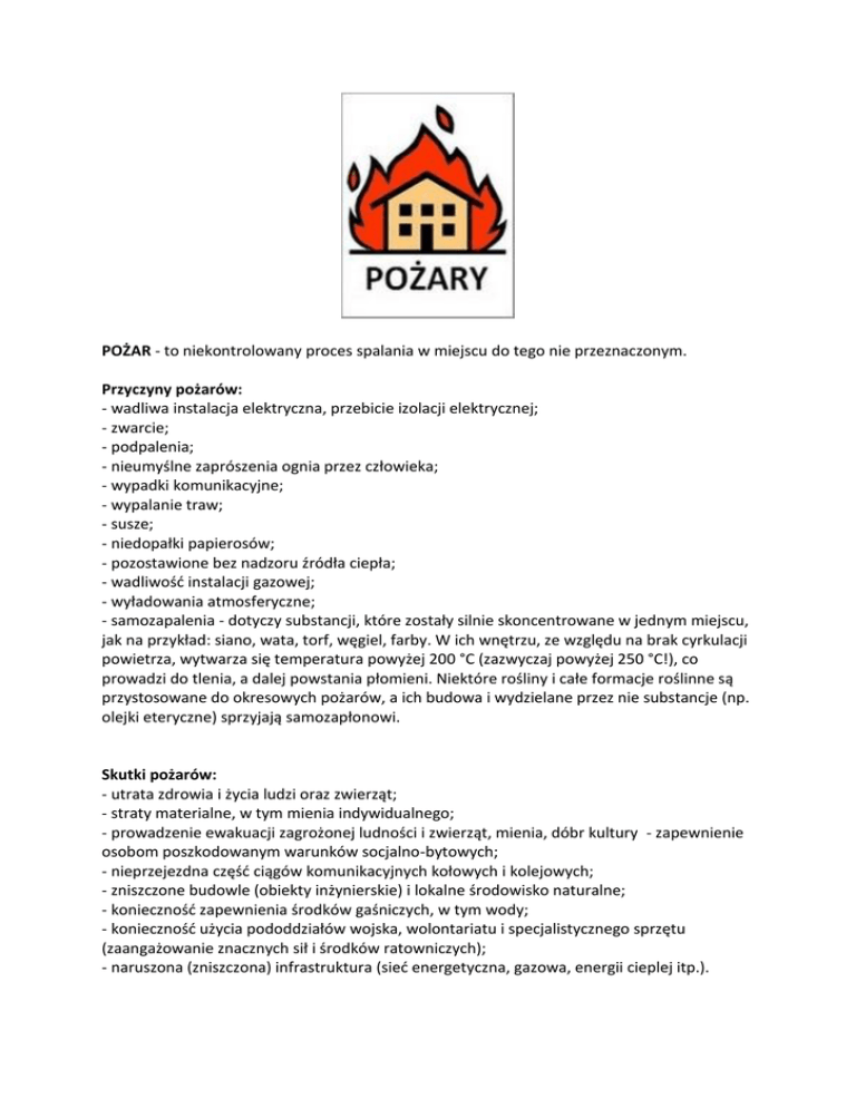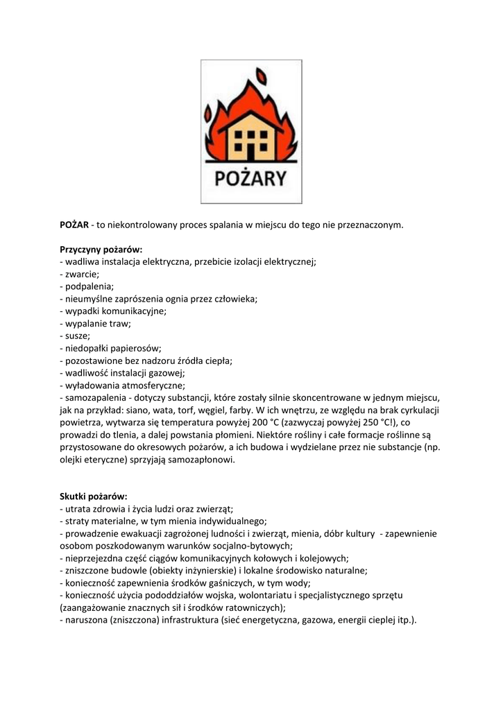 POŻAR - to niekontrolowany proces spalania w miejscu do tego nie przeznaczonym. Przyczyny pożarów: - wadliwa instalacja elektryczna, przebicie izolacji elektrycznej; - zwarcie; - podpalenia; - nieumyślne zaprószenia ognia przez człowieka; - wypadki komunikacyjne; - wypalanie traw; - susze; - niedopałki papierosów; - pozostawione bez nadzoru źródła ciepła; - wadliwość instalacji gazowej; - wyładowania atmosferyczne; - samozapalenia - dotyczy substancji, które zostały silnie skoncentrowane w jednym miejscu, jak na przykład: siano, wata, torf, węgiel, farby. W ich wnętrzu, ze względu na brak cyrkulacji powietrza, wytwarza się temperatura powyżej 200 °C (zazwyczaj powyżej 250 °C!), co prowadzi do tlenia, a dalej powstania płomieni. Niektóre rośliny i całe formacje roślinne są przystosowane do okresowych pożarów, a ich budowa i wydzielane przez nie substancje (np. olejki eteryczne) sprzyjają samozapłonowi. Skutki pożarów: - utrata zdrowia i życia ludzi oraz zwierząt; - straty materialne, w tym mienia indywidualnego; - prowadzenie ewakuacji zagrożonej ludności i zwierząt, mienia, dóbr kultury - zapewnienie osobom poszkodowanym warunków socjalno-bytowych; - nieprzejezdna część ciągów komunikacyjnych kołowych i kolejowych; - zniszczone budowle (obiekty inżynierskie) i lokalne środowisko naturalne; - konieczność zapewnienia środków gaśniczych, w tym wody; - konieczność użycia pododdziałów wojska, wolontariatu i specjalistycznego sprzętu (zaangażowanie znacznych sił i środków ratowniczych); - naruszona (zniszczona) infrastruktura (sieć energetyczna, gazowa, energii cieplej itp.). Schemat postępowania w przypadku pożaru Świadek pożaru Zbierz jak największą ilość istotnych informacji niezbędnych do rozpoczęcia działań gaśniczych, bądź ratowniczo gaśniczych przez odpowiednie służby Sprawdź co się pali, ustal dokładny adres pożaru, a jeśli nie znasz dokładnie terenu na którym się właśnie znajdujesz, zapytaj osób miejscowych Jak najszybciej powiadom STRAŻ POŻARNĄ tel. 998 lub 112 Podaj zebrane wcześniej informacje - cechy charakterystyczne pożaru (co się pali, gdzie, czy jest zagrożenie dla miejscowości) Podaj swoje dane personalne – imię i nazwisko oraz nr telefony z którego dzwonisz Jeśli jesteś osobą miejscową, poczekaj na przybycie strażaków Pomóż im rozpoznać obszar objęty pożarem oraz jego sąsiedztwo Jeśli nie znasz obszaru, nie przeszkadzaj im w prowadzeniu akcji gaśniczej AKCJA GAŚNICZA