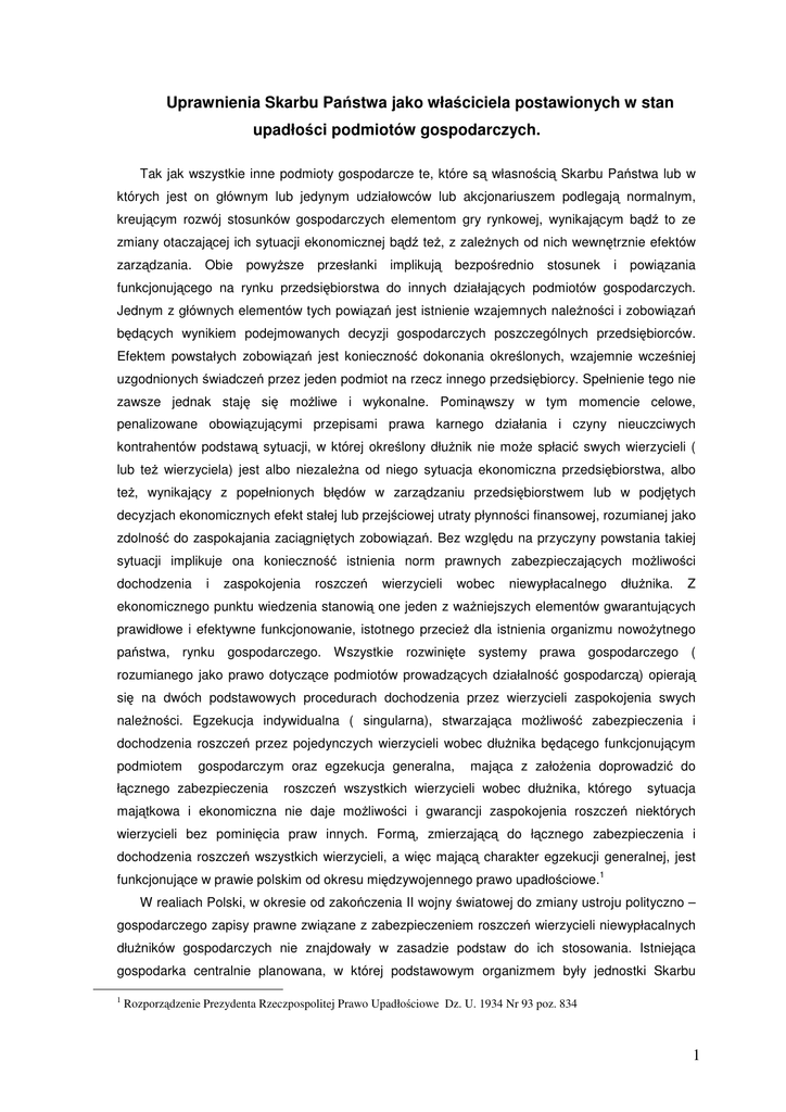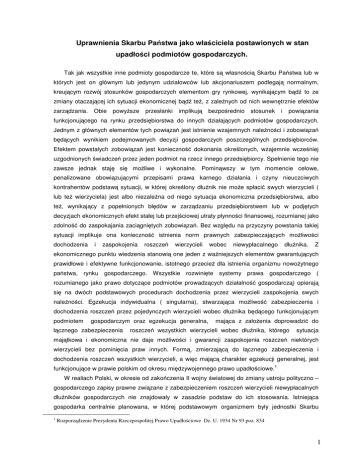 Uprawnienia Skarbu Państwa jako właściciela postawionych w stan upadłości podmiotów gospodarczych. Tak jak wszystkie inne podmioty gospodarcze te, które są własnością Skarbu Państwa lub w których jest on głównym lub jedynym udziałowców lub akcjonariuszem podlegają normalnym, kreującym rozwój stosunków gospodarczych elementom gry rynkowej, wynikającym bądź to ze zmiany otaczającej ich sytuacji ekonomicznej bądź też, z zależnych od nich wewnętrznie efektów zarządzania. Obie powyższe przesłanki implikują bezpośrednio stosunek i powiązania funkcjonującego na rynku przedsiębiorstwa do innych działających podmiotów gospodarczych. Jednym z głównych elementów tych powiązań jest istnienie wzajemnych należności i zobowiązań będących wynikiem podejmowanych decyzji gospodarczych poszczególnych przedsiębiorców. Efektem powstałych zobowiązań jest konieczność dokonania określonych, wzajemnie wcześniej uzgodnionych świadczeń przez jeden podmiot na rzecz innego przedsiębiorcy. Spełnienie tego nie zawsze jednak staję się możliwe i wykonalne. Pominąwszy w tym momencie celowe, penalizowane obowiązującymi przepisami prawa karnego działania i czyny nieuczciwych kontrahentów podstawą sytuacji, w której określony dłużnik nie może spłacić swych wierzycieli ( lub też wierzyciela) jest albo niezależna od niego sytuacja ekonomiczna przedsiębiorstwa, albo też, wynikający z popełnionych błędów w zarządzaniu przedsiębiorstwem lub w podjętych decyzjach ekonomicznych efekt stałej lub przejściowej utraty płynności finansowej, rozumianej jako zdolność do zaspokajania zaciągniętych zobowiązań. Bez względu na przyczyny powstania takiej sytuacji implikuje ona konieczność istnienia norm prawnych zabezpieczających możliwości dochodzenia i zaspokojenia roszczeń wierzycieli wobec niewypłacalnego dłużnika. Z ekonomicznego punktu wiedzenia stanowią one jeden z ważniejszych elementów gwarantujących prawidłowe i efektywne funkcjonowanie, istotnego przecież dla istnienia organizmu nowożytnego państwa, rynku gospodarczego. Wszystkie rozwinięte systemy prawa gospodarczego ( rozumianego jako prawo dotyczące podmiotów prowadzących działalność gospodarczą) opierają się na dwóch podstawowych procedurach dochodzenia przez wierzycieli zaspokojenia swych należności. Egzekucja indywidualna ( singularna), stwarzająca możliwość zabezpieczenia i dochodzenia roszczeń przez pojedynczych wierzycieli wobec dłużnika będącego funkcjonującym podmiotem gospodarczym oraz egzekucja generalna, łącznego zabezpieczenia mająca z założenia doprowadzić do roszczeń wszystkich wierzycieli wobec dłużnika, którego sytuacja majątkowa i ekonomiczna nie daje możliwości i gwarancji zaspokojenia roszczeń niektórych wierzycieli bez pominięcia praw innych. Formą, zmierzającą do łącznego zabezpieczenia i dochodzenia roszczeń wszystkich wierzycieli, a więc mającą charakter egzekucji generalnej, jest 1 funkcjonujące w prawie polskim od okresu międzywojennego prawo upadłościowe. W realiach Polski, w okresie od zakończenia II wojny światowej do zmiany ustroju polityczno – gospodarczego zapisy prawne związane z zabezpieczeniem roszczeń wierzycieli niewypłacalnych dłużników gospodarczych nie znajdowały w zasadzie podstaw do ich stosowania. Istniejąca gospodarka centralnie planowana, w której podstawowym organizmem były jednostki Skarbu 1 Rozporządzenie Prezydenta Rzeczpospolitej Prawo Upadłościowe Dz. U. 1934 Nr 93 poz. 834 1 Państwa nie wymagała zabezpieczenia praw wierzycieli. Tożsamość właściciela pojedynczych, funkcjonujących na rynku podmiotów gospodarczych wyłączała zarówno konieczność jak i sens stosowania egzekucji o charakterze generalnym. Zbędne było ogłaszanie upadłości przedsiębiorstwa, którego jedynym właścicielem był jednocześnie właściciel podmiotów będących jego wierzycielami. Wszelakie rozliczenia, w tym powstałe w wyniku istniejących pomiędzy podmiotami gospodarczymi zobowiązań oparte były o rolę Skarbu Państwa w finansowaniu ich funkcjonowania. W okresie tym obowiązywały co prawda przepisy prawne, dopuszczające teoretyczną możliwość powstawania posiadających osobowość prawną, nie będących własnością Skarbu Państwa podmiotów gospodarczych, jak również przepisy regulujące zarówno postępowanie upadłościowe jak i naprawcze dłużników, będących przedsiębiorcą zaprzestałym 2 spłacenia swych zobowiązań . Akty te nabrały jednakże szczególnego znaczenia dopiero po dokonanej w Polsce transformacji systemu gospodarczego, skutkującej min. rozwojem niezależnych od Skarbu Państwa podmiotów operujących na rynku gospodarczym. Odejście od gospodarki centralnie planowanej i zastąpienie jej systemem gospodarki rynkowej doprowadziło do konieczności określenia zasad zarówno tworzenia i funkcjonowania podmiotów gospodarczych niezwiązanych ze Skarbem Państwa, jak też trybu i zasad zabezpieczania roszczeń wierzycieli w stosunkach gospodarczych. Rolę tą, przez długi czas spełniały przepisy przedwojenne, powstałe w roku 1934 czyli Kodeks Handlowy oraz Prawo upadłościowe i Prawo o postępowaniu układowym funkcjonujące, z licznymi co prawda zmianami, aż do ich uchylenia po roku 2000. 3 Efektem dokonanych w Polsce po 1989 roku zmian ustrojowych, w tym obejmujących organizację rynku działalności gospodarczej jest min. pozostawienie na nim Skarbu Państwa jako właściciela funkcjonujących na nim podmiotów. Pominąwszy w tym momencie nie posiadające zdolności upadłościowej, choć także funkcjonujące jakkolwiek w ograniczonym częściowo zakresie 4 na rynku gospodarczym, utworzone ustawą o finansach publicznych jednostki organizacyjne 5 sektora finansów publicznych podstawowymi podmiotami istniejącymi w celu osiągania dochodów 2 Pierwsze z nich to Rozporządzenie Prezydenta Rzeczpospol