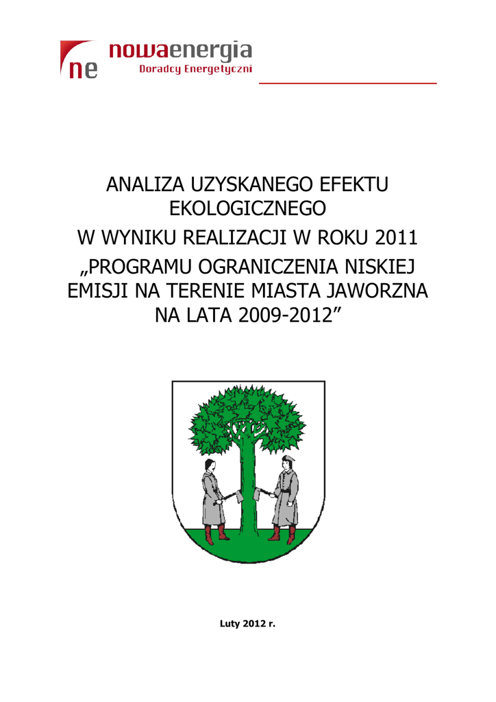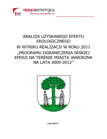 ANALIZA UZYSKANEGO EFEKTU EKOLOGICZNEGO W WYNIKU REALIZACJI W ROKU 2011 „PROGRAMU OGRANICZENIA NISKIEJ EMISJI NA TERENIE MIASTA JAWORZNA NA LATA 2009-2012” Luty 2012 r. Analiza efektu ekologicznego realizacji „Programu ograniczenia niskiej emisji na terenie miasta Jaworzna na lata 2009-2012” w roku 2011 BIURO INŻYNIERSKIE DORADZTWO ENERGETYCZNE Arkadiusz Osicki Urząd Miejski w Jaworznie ul. Grunwaldzka 33, 43-600 Jaworzno tel. (32) 61 81 500, fax: (32) 61 81 501 NIP 632-000-83-60; REGON: 000649404 e-mail: [email protected] ul. Wandy 32a/2, 41 – 500 Chorzów tel.: (32) 209 55 46, kom. 503 170 783 NIP: 642-223-48-58; REGON 242743274 e-mail: [email protected] Zespół autorski: Arkadiusz Osicki - prowadzący Tomasz Zieliński Mariusz Bogacki Współpraca ze strony Urzędu Miejskiego w Jaworznie: Bronisława Chechelska - Paliga – Naczelnik Wydziału Ochrony Środowiska i Rolnictwa, Halina Larysz – Główny Specjalista Wydziału Ochrony Środowiska i Rolnictwa, Autorzy opracowania serdecznie dziękują za pomoc i poświęcony czas wszystkim osobom zaangażowanym w przygotowanie niniejszego dokumentu. Strona 2 z 26 Analiza efektu ekologicznego realizacji „Programu ograniczenia niskiej emisji na terenie miasta Jaworzna na lata 2009-2012” w roku 2011 SPIS TREŚCI 1. PODSTAWA I CEL OPRACOWANIA ................................................................................ 4 2. WSTĘP ........................................................................................................................... 4 3. INFORMACJE OGÓLNE O REALIZACJI PROGRAMU W 2011 R. ..................................... 5 3.1. STATYSTYKA ŹRÓDEŁ CIEPŁA DOFINANSOWANYCH W RAMACH PROGRAMU W 2011R. .......................... 7 3.2. STATYSTYKA ŹRÓDEŁ CIEPŁA DOFINANSOWANYCH W RAMACH PROGRAMU W 2011R. W BUDYNKACH STARYCH .................................................................................................................................. 9 3.3. STATYSTYKA ŹRÓDEŁ CIEPŁA DOFINANSOWANYCH W RAMACH PROGRAMU W 2011R. W BUDYNKACH NOWYCH ................................................................................................................................ 11 3.4. STATYSTYKA ŹRÓDEŁ CIEPŁA DO PRZYGOTOWANIA CIEPŁEJ WODY UŻYTKOWEJ (SYSTEMY SOLARNE, POMPY CIEPŁA) DOFINANSOWANYCH W RAMACH 4. PROGRAMU W 2011R............................................................... 13 EFEKT EKOLOGICZNY WYNIKAJĄCY Z REALIZACJI PROGRAMU OGRANICZENIA NISKIEJ EMISJI W 2011 R. ................................................................................................ 14 4.1. EMISJA JEDNOSTKOWA ZANIECZYSZCZEŃ POWIETRZA W ODNIESIENIU NA JEDNOSTKĘ ENERGII UŻYTECZNEJ DLA POSZCZEGÓLNYCH ŹRÓDEŁ CIEPŁA ............................................................................................ 18 4.2. EFEKT EKOLOGICZNY WYNIKAJĄCY Z WYMIANY ŹRÓDEŁ CIEPŁA W BUDYNKACH STARYCH ..................... 19 4.3. EFEKT EKOLOGICZNY WYNIKAJĄCY Z UNIKNIĘTEJ EMISJI ZANIECZYSZCZEŃ ZE ŹRÓDEŁ CIEPŁA W BUDYNKACH NOWYCH W WYNIKU ZASTOSOWANIA EKOLOGICZNYCH ŹRÓDEŁ ............................................................... 21 4.4. EFEKT EKOLOGICZNY WYNIKAJĄCY Z MONTAŻU KOLEKTORÓW SŁONECZNYCH ORAZ POMP CIEPŁA DO CELÓW PRZYGOTOWANIA CIEPŁEJ WODY .................................................................................................... 22 4.5. 5. CAŁKOWITE ZESTAWIENIE EFEKTU EKOLOGICZNEGO W WYNIKU REALIZACJI PROGRAMU W 2011 ROKU ... 25 PODSUMOWANIE ........................................................................................................ 26 Strona 3 z 26 Analiza efektu ekologicznego realizacji „Programu ograniczenia niskiej emisji na terenie miasta Jaworzna na lata 2009-2012” w roku 2011 1. Podstawa i cel opracowania Głównym celem zadania jest analiza efektu ekologicznego oraz ocena funkcjonowania „Programu ograniczenia niskiej emisji na terenie miasta Jaworzna na lata 2009-2012”. Tego rodzaju analizy prowadzone są cyklicznie po każdym roku implementacji programu. Zakres niniejszej analizy dotyczy efektów realizacji Programu w 2011 roku. Analizy i obliczenia zostały wykonane w oparciu o dokumentację prowadzoną w ramach funkcjonowania Programu przez Wydział Ochrony Środowiska i Rolnictwa Urzędu Miejskiego w Jaworznie, a także o obowiązujące zasady ogólne określone w „Programie ograniczenia niskiej emisji na terenie miasta Jaworzna na lata 2009-2012”. Podstawą formalną opracowania "Analizy efektu ekologicznego realizacji Programu ograniczenia niskiej emisji na terenie miasta Jaworzna na lata 2009-2012 w roku 2011” jest umowa zawarta w dniu 16 stycznia 2012 roku pomiędzy Gminą Jaworzno, reprezentowaną przez Zastępcę Prezydenta Miasta – Pana Tadeusza Kaczmarka, a Panem Arkadiuszem Osickim prowadzącym działalność gospodarczą jako Biuro Inżynierskie – Doradztwo Energetyczne. Arkadiusz Osicki z siedzibą w Chorzowie. Zakres opracowania uwzględnia: 1. Statystykę źródeł ciepła dofinansowanych w ramach Programu w 2011r. 2. Efekty ekologiczne realizacji programu ograniczenia niskiej emisji. 3. Efekty ekologiczne jednostkowe dla poszczególnych rodzajów źródeł ciepła. Niniejsza dokumentacja została wykonana zgodnie z umową i zasadami wiedzy technicznej. Dokumentacja wydana jest w stanie kompletnym ze względu na cel oznaczony w umowie. 2. Wstęp „Program ograniczenia niskiej emisji na terenie Jaworzna na lata 2009-2012” został przyjęty w dniu 25 września 2008 r. uchwałą XXV/325/2008 Rady Miejskiej w Jaworznie. Program przygotowano w celu ustalenia zasad dofinansowania przez miasto inwestycji prowadzonych przez mieszkańców, polegających na montażu ekologicznych systemów grzewczych w budynkach i lokalach mieszkalnych. Ponadto program wskazuje kierunki innych działań prowadzących do ograniczenia niskiej emisji na obszarze Gminy Jaworzno. Realizowany program obejmuje okres od 2009 do 2012 r. i jest kontyn