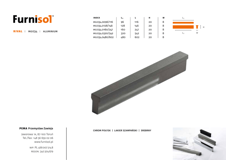 rival mg 034 aluminium PE M A Przemysław Zawieja Jaworowa 1A, 87-100 Toruń Tel./fax: +48 56 659 02 06 www.furnisol.pl NIP: PL 466 007 314 8 REGON: 340 304 679 index l1 l h w mg 034.0096/116 mg 034.0128/146 mg 034.0160/247 mg 034.0320/542 mg 034.0480/602 96 128 160 320 480 116 146 247 542 602 20 20 20 20 20 8 8 8 8 8 chrom połysk | lakier szampański | srebrny l1 h l1 w