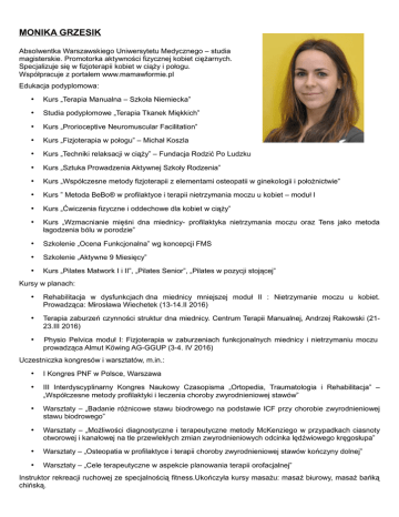 MONIKA GRZESIK Absolwentka Warszawskiego Uniwersytetu Medycznego – studia magisterskie. Promotorka aktywności fizycznej kobiet ciężarnych. Specjalizuje się w fizjoterapii kobiet w ciąży i połogu. Współpracuje z portalem www.mamawformie.pl Edukacja podyplomowa: • Kurs „Terapia Manualna – Szkoła Niemiecka” • Studia podyplomowe „Terapia Tkanek Miękkich” • Kurs „Prorioceptive Neuromuscular Facilitation” • Kurs „Fizjoterapia w połogu” – Michał Koszla • Kurs „Techniki relaksacji w ciąży” – Fundacja Rodzić Po Ludzku • Kurs „Sztuka Prowadzenia Aktywnej Szkoły Rodzenia” • Kurs „Współczesne metody fizjoterapii z elementami osteopatii w ginekologii i położnictwie” • Kurs ” Metoda BeBo® w profilaktyce i terapii nietrzymania moczu u kobiet – moduł I • Kurs „Ćwiczenia fizyczne i oddechowe dla kobiet w ciąży” • Kurs „Wzmacnianie mięśni dna miednicy- profilaktyka nietrzymania moczu oraz Tens jako metoda łagodzenia bólu w porodzie” • Szkolenie „Ocena Funkcjonalna” wg koncepcji FMS • Szkolenie „Aktywne 9 Miesięcy” • Kurs „Pilates Matwork I i II”, „Pilates Senior”, „Pilates w pozycji stojącej” Kursy w planach: • Rehabilitacja w dysfunkcjach dna miednicy mniejszej moduł II : Nietrzymanie moczu u kobiet. Prowadząca: Mirosława Wiechetek (13-14.II 2016) • Terapia zaburzeń czynności struktur dna miednicy. Centrum Terapii Manualnej, Andrzej Rakowski (2123.III 2016) • Physio Pelvica moduł I: Fizjoterapia w zaburzeniach funkcjonalnych miednicy i nietrzymaniu moczu prowadząca Almut Köwing AG-GGUP (3-4. IV 2016) Uczestniczka kongresów i warsztatów, m.in.: • I Kongres PNF w Polsce, Warszawa • III Interdyscyplinarny Kongres Naukowy Czasopisma „Ortopedia, Traumatologia i Rehabilitacja” – „Współczesne metody profilaktyki i leczenia choroby zwyrodnieniowej stawów” • Warsztaty – „Badanie różnicowe stawu biodrowego na podstawie ICF przy chorobie zwyrodnieniowej stawu biodrowego” • Warsztaty – „Możliwości diagnostyczne i terapeutyczne metody McKenziego w przypadkach ciasnoty otworowej i kanałowej na tle przewlekłych zmian zwyrodnieniowych odcinka lędźwiowego kręgosłupa” • Warsztaty – „Osteopatia w profilaktyce i terapii choroby zwyrodnieniowej stawów kończyny dolnej” • Warsztaty – „Cele terapeutyczne w aspekcie planowania terapii orofacjalnej” Instruktor rekreacji ruchowej ze specjalnością fitness.Ukończyła kursy masażu: masaż biurowy, masaż bańką chińską.