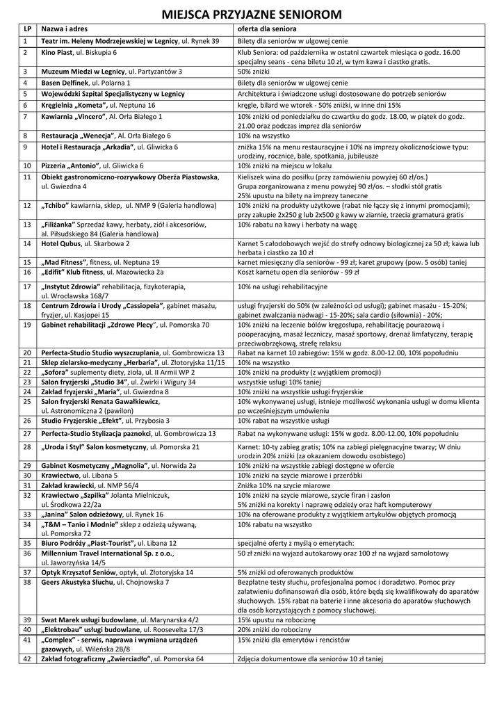 MIEJSCA PRZYJAZNE SENIOROM LP Nazwa i adres oferta dla seniora 1 2 Teatr im. Heleny Modrzejewskiej w Legnicy, ul. Rynek 39 Kino Piast, ul. Biskupia 6 3 4 5 6 7 Muzeum Miedzi w Legnicy, ul. Partyzantów 3 Basen Delfinek, ul. Polarna 1 Wojewódzki Szpital Specjalistyczny w Legnicy Kręgielnia „Kometa”, ul. Neptuna 16 Kawiarnia „Vincero”, Al. Orła Białego 1 8 9 Restauracja „Wenecja”, Al. Orła Białego 6 Hotel i Restauracja „Arkadia”, ul. Gliwicka 6 10 11 Pizzeria „Antonio”, ul. Gliwicka 6 Obiekt gastronomiczno-rozrywkowy Oberża Piastowska, ul. Gwiezdna 4 12 „Tchibo” kawiarnia, sklep, ul. NMP 9 (Galeria handlowa) 13 14 „Filiżanka” Sprzedaż kawy, herbaty, ziół i akcesoriów, al. Piłsudskiego 84 (Galeria handlowa) Hotel Qubus, ul. Skarbowa 2 Bilety dla seniorów w ulgowej cenie Klub Seniora: od października w ostatni czwartek miesiąca o godz. 16.00 specjalny seans - cena biletu 10 zł, w tym kawa i ciastko gratis. 50% zniżki Bilety dla seniorów w ulgowej cenie Architektura i świadczone usługi dostosowane do potrzeb seniorów kręgle, bilard we wtorek - 50% zniżki, w inne dni 15% 10% zniżki od poniedziałku do czwartku do godz. 18.00, w piątek do godz. 21.00 oraz podczas imprez dla seniorów 10% na wszystko zniżka 15% na menu restauracyjne i 10% na imprezy okolicznościowe typu: urodziny, rocznice, bale, spotkania, jubileusze 10% zniżki na miejscu w lokalu Kieliszek wina do posiłku (przy zamówieniu powyżej 60 zł/os.) Grupa zorganizowana z menu powyżej 90 zł/os. – słodki stół gratis 25% upustu na bilety na imprezy taneczne 10% zniżki na produkty użytkowe (rabat nie łączy się z innymi promocjami); przy zakupie 2x250 g lub 2x500 g kawy w ziarnie, trzecia gramatura gratis 10% rabatu na kawy i herbaty na wagę 15 16 „Mad Fitness”, fitness, ul. Neptuna 19 „Edifit” Klub fitness, ul. Mazowiecka 2a 17 „Instytut Zdrowia” rehabilitacja, fizykoterapia, ul. Wrocławska 168/7 Centrum Zdrowia i Urody „Cassiopeia”, gabinet masażu, fryzjer, ul. Kasjopei 15 Gabinet rehabilitacji „Zdrowe Plecy”, ul. Pomorska 70 18 Karnet 5 całodobowych wejść do strefy odnowy biologicznej za 50 zł; kawa lub herbata i ciastko za 10 zł karnet miesięczny dla seniorów - 99 zł; karet grupowy (pow. 5 osób) taniej Koszt karnetu open dla seniorów - 99 zł 10% na usługi rehabilitacyjne 26 Perfecta-Studio Studio wyszczuplania, ul. Gombrowicza 13 Sklep zielarsko-medyczny „Herbaria”, ul. Złotoryjska 11/15 „Sofora” suplementy diety, zioła, ul. II Armii WP 2 Salon fryzjerski „Studio 34”, ul. Żwirki i Wigury 34 Zakład fryzjerski „Maria”, ul. Gwiezdna 8 Salon fryzjerski Renata Gawałkiewicz, ul. Astronomiczna 2 (pawilon) Studio Fryzjerskie „Efekt”, ul. Przybosia 3 usługi fryzjerski do 50% (w zależności od usługi); gabinet masażu - 15-20%; gabinet zwalczania nadwagi - 15-20%; sala cardio (siłownia) - 20%; 10% zniżki na leczenie bólów kręgosłupa, rehabilitację pourazową i pooperacyjną, masaż leczniczy, masaż sportowy, drenaż limfatyczny, terapię przeciwobrzękową, strefę relaksu Rabat na karnet 10 zabiegów: 15% w godz. 8.00-12.00, 10% popołudniu 10% na wszystko 10% zniżki na produkty (z wyjątkiem promocji) wszystkie usługi 10% taniej 10% zniżki na wszystkie usługi fryzjerskie 10% wykonywanej usługi, istnieje możliwość wykonania usługi w domu klienta po wcześniejszym umówieniu 10% rabat na wszystkie usługi 27 Perfecta-Studio Stylizacja paznokci, ul. Gombrowicza 13 Rabat na wykonywane usługi: 15% w godz. 8.00-12.00, 10% popołudniu 28 „Uroda i Styl” Salon kosmetyczny, ul. Pomorska 21 29 30 31 32 Gabinet Kosmetyczny „Magnolia”, ul. Norwida 2a Krawiectwo, ul. Libana 5 Zakład krawiecki, ul. NMP 56/4 Krawiectwo „Szpilka” Jolanta Mielniczuk, ul. Środkowa 22/2a „Janina” Salon odzieżowy, ul. Rynek 16 „T&M – Tanio i Modnie” sklep z odzieżą używaną, ul. Pomorska 72 Biuro Podróży „Piast-Tourist”, ul. Libana 12 Millennium Travel International Sp. z o.o., ul. Jaworzyńska 14/5 Optyk Krzysztof Seniów, optyk, ul. Złotoryjska 14 Geers Akustyka Słuchu, ul. Chojnowska 7 Karnet: 10-ty zabieg gratis; 10% na zabiegi pielęgnacyjne twarzy; W dniu urodzin 20% zniżki (za okazaniem dowodu osobistego) 10% zniżki na wszystkie zabiegi dostępne w ofercie 10% zniżki na szycie miarowe i przeróbki Zniżka 10% na szycie miarowe 10% zniżki na szycie miarowe, szycie firan i zasłon 5% zniżki na korekty i naprawę odzieży oraz haft komputerowy 10% na oferowane produkty z wyjątkiem artykułów objętych promocją 10% rabatu na wszystko 19 20 21 22 23 24 25 33 34 35 36 37 38 39 40 41 42 Swat Marek usługi budowlane, ul. Marynarska 4/2 „Elektrobau” usługi budowlane, ul. Roosevelta 17/3 „Complex” - serwis, naprawa i wymiana urządzeń gazowych, ul. Wileńska 2B/8 Zakład fotograficzny „Zwierciadło”, ul. Pomorska 64 specjalne oferty z myślą o emerytach: 50 zł zniżki na wyjazd autokarowy oraz 100 zł na wyjazd samolotowy 5% zniżki od oferowanych produktów Bezpłatne testy słuchu, profesjonalna pomoc i doradztwo. Pomoc przy załatwieniu dofinansowań dla osób, które będą się kwalifikowały do aparatów słuchowych. 15% rabat na baterie i inne akcesoria do aparatów słuchowych dla osób korzystających z pomocy słuchowej. 15% upustu na robociznę 20% zniżki do robocizny 15% zniżki dla emerytów i rencistów Zdjęcia dokumentowe dla seniorów 10 zł taniej