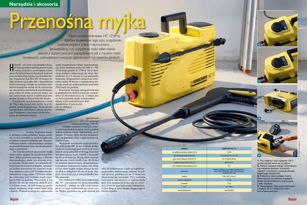 Narzędzia i akcesoria Przenośna myjka Myjka wysokociśnieniowa HC 10 firmy Kärcher to pierwsze tego typu urządzenie zasilane prądem z sieci i akumulatora. Sprawdziliśmy, czy urządzenie radzi sobie równie dobrze z dużymi pracami porządkowymi jak z myciem mebli tarasowych, zabrudzonych narzędzi ogrodniczych lub rowerów górskich. można wygodnie wpiąć w uchwyty z boku obudowy. Kabel zasilania można nawinąć na spód urządzenia, co ułatwia transport i składowanie. Nie przewidziano jedynie odpowiedniego miejsca do przechowywania węża wysokociśnieniowego z pistoletem. Do standardowych akcesoriów myjki należy także adapter do złączki węża Gardeny. Także przewód zasysający z filtrem, doprowadzający wodę, jest wliczony w cenę zestawu. Dzięki temu, bez potrzeby dokonywania kolejnych zakupów, urządzenie można wykorzystać do zasysania wody. Przy zasilaniu z sieci (230 V) myjka wysoko ciśnieniowa osiąga maks. 110 barów ciśnienia roboczego przy wydatku wody sięgającym 400 l na godzinę. Wprawdzie w ten sposób nie da się wykonać dużych prac w krótkim czasie, ale jeśli mamy go trochę więcej, będziemy mogli nawet umyć taras i fasadę. Poziom wydajności odpowiada wielu urządzeniom z klasy wprowadzającej, które kosztują mniej niż 400 zł – HC 10 kosztuje jednak ok. 1700 zł. Za to można go zasilać z załączonego do niego akumulatora 25,2 V, chociaż w tym przypadku będziemy dysponowali ciśnieniem roboczym rzędu 40 barów i wydajnością tłoczenia wody na maksymalnym poziomie 250/l wody na godzinę. Ponieważ energia zmagazynowana w akumulatorze litowo-jonowym o pojemności 3,3 Ah wystarcza na ok. 12 minut pracy, wykorzystanie myjki wysokociśnieniowej z tym zasilaniem jest dość ograniczone. Czasu wystarczy na obmycie fotelików ogrodowych lub zabrudzonego roweru górskiego. Aby dokładnie oczyścić wszystkie rowery pięcioosobowej rodziny, trzeba jednak szukać zasilania z sieci. Tym bardziej, że ciśnienie 40 barów także nie jest wystarczające, by poradzić sobie z uporczywymi zabrudzeniami. Wydajność urządzenia spada dodatkowo, jeśli myjka HC 10 nie zostanie podłączona do wodociągu pod ciśnieniem (zasilanie w wodę pitną lub wodociąg domowy), lecz musi zasysać wodę z beczki z deszczówką lub ze strumienia. Wtedy zdoła zaczerpnąć niecałe cztery wiadra (ok. 40 litrów) na jednym załadowanym akumulatorze, a strumień ciśnieniowy będzie tak słaby, że bez obaw będzie można włożyć do niego dłoń w odległości 20 cm od dyszy. Stopień czyszczenia jest w tym przypadku bardzo niewielki. Do większych robót porządkowych HC 10 – za względu na swoją niewielką wydajność – nadaje się tylko pod warunkiem, że jego użytkownik ma dużo czasu. Myjka sprawdza się, jeśli chcemy jej 2 3 użyć do lekkich prac z dala od najbliższego gniazdka elektrycznego, musimy się jednak spieszyć, ponieważ po ok. 12 minutach akumulator się wyczerpie. Przy zasilaniu bateryjnym zakrojonych na większą skalę prac tym urządzeniem nie uda się wykonać, bowiem czas ładowania akumulatora jest długi, a cena zakupu drugiej baterii bardzo wysoka. model KÄRCHER HC 10 moc pobierana (zasilanie sieciowe 230 V) 1,6 kW akumulator/pojemność akumulatora litowo-jonowy 25,2 V/3,3 Ah zakres ciśnień roboczych (230 V/25,2 V) 20–110 bar/20–40 bar wydajność tłoczenia (230 V/25,2 V) 400 l/h/250 l/h maks. temperatura doprowadzanej wody 40°C wyposażenie pistolet spryskujący, wąż wysokociśnieniowy dł. 4 m, lanca z dyszą Variopower, lanca z dyszą rotacyjną, wbudowany filtr wody wymiary 498 x 270 x 219 mm ciężar bez wyposażenia 7,5 kg gwarancja 2 lata cena ok. 1700 zł adresy dystrybutorów www.karcher.pl 4 1. Przy zasilaniu z sieci napięciem 230 V symbol wtyczki świeci się na zielono. 2. Podczas czerpania energii z akumulatora trzy wskaźniki diodowe, w kolorach zielonym i czerwonym, pokazują aktualny stopień jego naładowania. 3. Praktyczne: kabel zasilający można łatwo nawinąć na podstawę urządzenia. Dysze wysokociśnieniowe można wpiąć z boku obudowy. 4. Niespotykane: nieporęczny akumulator o napięciu 25,2 V wkłada się z boku pod uchylaną pokrywę. Fot. Michael Holz, producent H ybryda – oto nowe czarodziejskie słowo, którym przemysł określa prawie każdy rodzaj urządzeń z podwójnym zasilaniem. Po hybrydowych kosiarkach nadeszła pora na hybrydową myjkę wysokociśnieniową. Urządzenie Kärcher HC 10 można zasilać prądem z gniazdka lub z akumulatora litowo-jonowego. Dzięki tej ostatniej możliwości urządzenie nadaje się do czyszczenia np. akcesoriów sportowych przechowywanych z dala od domu, ponieważ myjka „sama” zasysa wodę wprost z najbliższego strumienia, beczki na deszczówkę lub wiadra. Urządzenie jest kompaktowe i waży ok. 7 kg, a więc nie jest zbyt ciężkie, by je wygodnie przetransportować. Wyposażenie standardowe, czyli lancę z dyszą spryskującą Variopower oraz lancę z dyszą rotacyjną do usuwania brudu, 1 Narzędzia i akcesoria 1. Dzięki szybkozłączce do pistoletu można łatwo podłączyć lancę z dyszą Vario i lancę z dyszą rotacyjną (na zdjęciu). 2. Używając myjki HC 10 narzędzia ogrodnicze można oczyścić także w miejscach, w których nie ma ani prądu, ani wodociągu. Najczęściej do wykonania tych prac wystarczy 12 minut. 3. Przenośna myjka wysokociśnieniowa z zasilaniem akumulatorowym dobrze nadaje się do czyszczenia akcesoriów sportowych, „gdzieś po drodze”, pod warunkiem, że dysponujemy czystą wodą. Myjki wysokociśnieniowe 1 2 Producent Model AGROMA PW1715E GRAPHITE 59G418 PROMA PPW-160 EINHELL BT-HP 200 zasilanie/moc pobierana 230 V/1,7 kW 230 V/1,8 kW 230 V/1,5 kW 230 V/2,2 kW zakres ciśnień roboczych 85–95 bar 100 bar 90 bar b.d. maks. ciśnienie 150 bar 180 bar 160 bar 200 bar wydajność tłoczenia 400 l/h 360 l/h 360 l/h 420 l/h maks. temperatura doprowadzanej wody 60°C 40°C 50°C 50°C pojemn