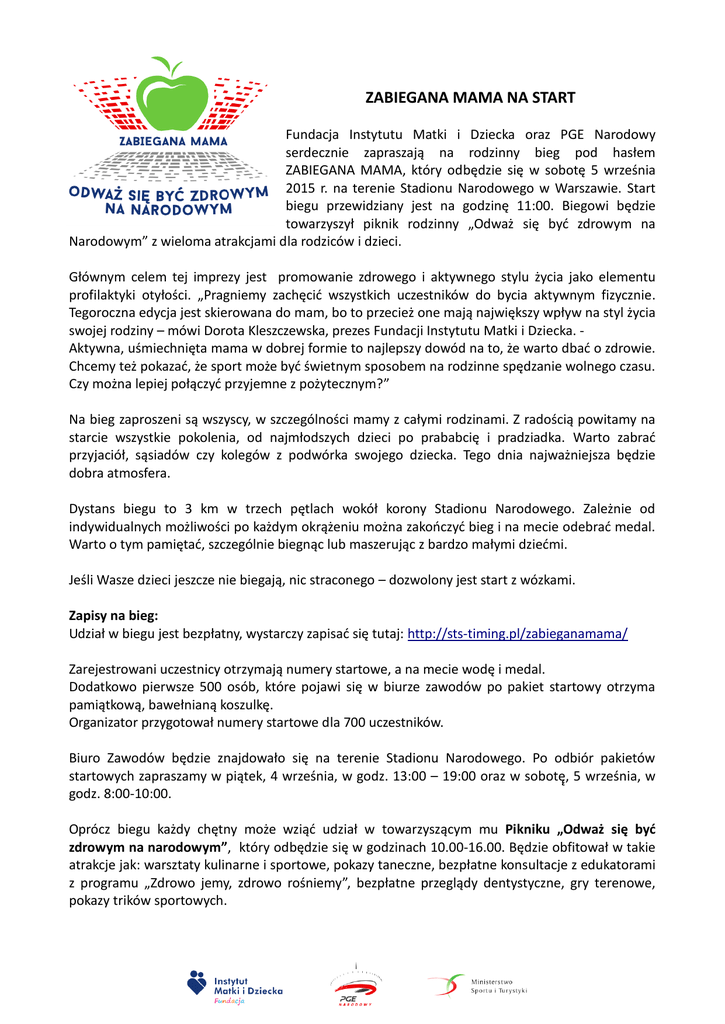 ZABIEGANA MAMA NA START Fundacja Instytutu Matki i Dziecka oraz PGE Narodowy serdecznie zapraszają na rodzinny bieg pod hasłem ZABIEGANA MAMA, który odbędzie się w sobotę 5 września 2015 r. na terenie Stadionu Narodowego w Warszawie. Start biegu przewidziany jest na godzinę 11:00. Biegowi będzie towarzyszył piknik rodzinny „Odważ się być zdrowym na Narodowym” z wieloma atrakcjami dla rodziców i dzieci. Głównym celem tej imprezy jest promowanie zdrowego i aktywnego stylu życia jako elementu profilaktyki otyłości. „Pragniemy zachęcić wszystkich uczestników do bycia aktywnym fizycznie. Tegoroczna edycja jest skierowana do mam, bo to przecież one mają największy wpływ na styl życia swojej rodziny – mówi Dorota Kleszczewska, prezes Fundacji Instytutu Matki i Dziecka. Aktywna, uśmiechnięta mama w dobrej formie to najlepszy dowód na to, że warto dbać o zdrowie. Chcemy też pokazać, że sport może być świetnym sposobem na rodzinne spędzanie wolnego czasu. Czy można lepiej połączyć przyjemne z pożytecznym?” Na bieg zaproszeni są wszyscy, w szczególności mamy z całymi rodzinami. Z radością powitamy na starcie wszystkie pokolenia, od najmłodszych dzieci po prababcię i pradziadka. Warto zabrać przyjaciół, sąsiadów czy kolegów z podwórka swojego dziecka. Tego dnia najważniejsza będzie dobra atmosfera. Dystans biegu to 3 km w trzech pętlach wokół korony Stadionu Narodowego. Zależnie od indywidualnych możliwości po każdym okrążeniu można zakończyć bieg i na mecie odebrać medal. Warto o tym pamiętać, szczególnie biegnąc lub maszerując z bardzo małymi dziećmi. Jeśli Wasze dzieci jeszcze nie biegają, nic straconego – dozwolony jest start z wózkami. Zapisy na bieg: Udział w biegu jest bezpłatny, wystarczy zapisać się tutaj: http://sts-timing.pl/zabieganamama/ Zarejestrowani uczestnicy otrzymają numery startowe, a na mecie wodę i medal. Dodatkowo pierwsze 500 osób, które pojawi się w biurze zawodów po pakiet startowy otrzyma pamiątkową, bawełnianą koszulkę. Organizator przygotował numery startowe dla 700 uczestników. Biuro Zawodów będzie znajdowało się na terenie Stadionu Narodowego. Po odbiór pakietów startowych zapraszamy w piątek, 4 września, w godz. 13:00 – 19:00 oraz w sobotę,̨ 5 września, w godz. 8:00-10:00. Oprócz biegu każdy chętny może wziąć udział w towarzyszącym mu Pikniku „Odważ się być zdrowym na narodowym”, który odbędzie się w godzinach 10.00-16.00. Będzie obfitował w takie atrakcje jak: warsztaty kulinarne i sportowe, pokazy taneczne, bezpłatne konsultacje z edukatorami z programu „Zdrowo jemy, zdrowo rośniemy”, bezpłatne przeglądy dentystyczne, gry terenowe, pokazy trików sportowych. To już druga edycja akcji „Odważ się być zdrowym na Narodowym” zainicjowanej przez Fundację Instytutu Matki i Dziecka oraz PGE Narodowy. Ma ona na celu wspieranie profilaktyki otyłości wśród dzieci i młodzieży. Tegoroczna edycja wydarzenia realizowana jest przy współpracy z Ministerstwem Sportu i Turystyki, programem „Zdrowo jemy, zdrowo rośniemy”, Centrum Edukacji Obywatelskiej, programem „Szkoła na Widelcu”, Fundacją FitKid, Kroplą Beskidu, Szybką Koleją Miejską, a także firmami VE, Dobra Forma i Run Vegan. Wstęp na wydarzenie jest bezpłatny. Pomysłodawcy i Fundatorzy: Fundacja Instytut Matki i Dziecka; Ministerstwo Sportu i Turystyki; PGE Narodowy Fundacja Instytutu Matki i Dziecka. Fundacja rozpoczęła swoją działalność w marcu 2014 r. Jej głównym celem jest wspieranie Instytutu Matki i Dziecka, a także pozyskiwanie funduszy na rzecz podejmowanych w IMiD inicjatyw o charakterze medycznym i naukowym. Ponadto Fundacja działa na rzecz ochrony zdrowia poprzez promocję profilaktyki zdrowotnej wśród dzieci, młodzieży i kobiet w ciąży, pomoc pacjentom i ich rodzinom, wsparcie placówek medycznych pod kątem wyposażenia w sprzęt medyczny, a także wspieranie i upowszechnianie działalności naukowej. Mapka biegu ZABIEGANA MAMA, 5 września 2015, sobota, 11.00 Organizator: Run Vegan Violetta Domaradzka, [email protected], +48 507 006851 Dorota Kleszczewska E-mail: [email protected] Tel: 532 130 322 Monika Rybarczyk E-mail: [email protected] Tel: 533 525 300 Jadwiga Komar-Mrozik E-mail: [email protected] Tel. 519 351 576