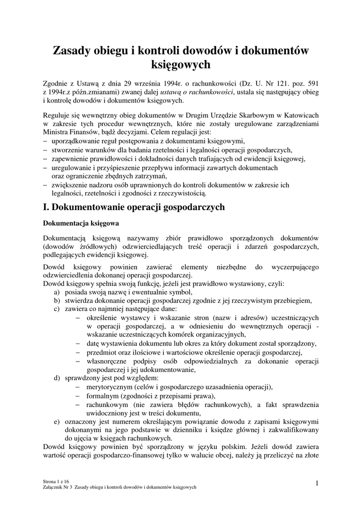 Zasady obiegu i kontroli dowodów i dokumentów księgowych Zgodnie z Ustawą z dnia 29 września 1994r. o rachunkowości (Dz. U. Nr 121. poz. 591 z 1994r.z późn.zmianami) zwanej dalej ustawą o rachunkowości, ustala się następujący obieg i kontrolę dowodów i dokumentów księgowych. Reguluje się wewnętrzny obieg dokumentów w Drugim Urzędzie Skarbowym w Katowicach w zakresie tych procedur wewnętrznych, które nie zostały uregulowane zarządzeniami Ministra Finansów, bądź decyzjami. Celem regulacji jest: − uporządkowanie reguł postępowania z dokumentami księgowymi, − stworzenie warunków dla badania rzetelności i legalności operacji gospodarczych, − zapewnienie prawidłowości i dokładności danych trafiających od ewidencji księgowej, − uregulowanie i przyśpieszenie przepływu informacji zawartych dokumentach oraz ograniczenie zbędnych zatrzymań, − zwiększenie nadzoru osób uprawnionych do kontroli dokumentów w zakresie ich legalności, rzetelności i zgodności z rzeczywistością. I. Dokumentowanie operacji gospodarczych Dokumentacja księgowa Dokumentacją księgową nazywamy zbiór prawidłowo sporządzonych dokumentów (dowodów źródłowych) odzwierciedlających treść operacji i zdarzeń gospodarczych, podlegających ewidencji księgowej. Dowód księgowy powinien zawierać elementy niezbędne do wyczerpującego odzwierciedlenia dokonanej operacji gospodarczej. Dowód księgowy spełnia swoją funkcję, jeżeli jest prawidłowo wystawiony, czyli: a) posiada swoją nazwę i ewentualnie symbol, b) stwierdza dokonanie operacji gospodarczej zgodnie z jej rzeczywistym przebiegiem, c) zawiera co najmniej następujące dane: − określenie wystawcy i wskazanie stron (nazw i adresów) uczestniczących w operacji gospodarczej, a w odniesieniu do wewnętrznych operacji wskazanie uczestniczących komórek organizacyjnych, − datę wystawienia dokumentu lub okres za który dokument został sporządzony, − przedmiot oraz ilościowe i wartościowe określenie operacji gospodarczej, − własnoręczne podpisy osób odpowiedzialnych za dokonanie operacji gospodarczej i jej udokumentowanie, d) sprawdzony jest pod względem: − merytorycznym (celów i gospodarczego uzasadnienia operacji), − formalnym (zgodności z przepisami prawa), − rachunkowym (nie zawiera błędów rachunkowych), a fakt sprawdzenia uwidoczniony jest w treści dokumentu, e) oznaczony jest numerem określającym powiązanie dowodu z zapisami księgowymi dokonanymi na jego podstawie w dzienniku i księdze głównej i zakwalifikowany do ujęcia w księgach rachunkowych. Dowód księgowy powinien być sporządzony w języku polskim. Jeżeli dowód zawiera wartość operacji gospodarczo-finansowej tylko w walucie obcej, należy ją przeliczyć na złote Strona 1 z 16 Załącznik Nr 3 Zasady obiegu i kontroli dowodów i dokumentów księgowych 1 polskie, zgodnie z zasadami wyceny aktywów i pasywów wynikającymi z ustawy o rachunkowości i wpisać w wolnych miejscach dokumentu. Za dowód księgowy uważa się także: − notę księgową sporządzaną dla udokumentowania operacji i zdarzeń gospodarczych, − polecenie księgowania wystawiane w celu dokonania wstępnej korekty operacji gospodarczej wynikającej z dowodu księgowego obcego, Dopuszcza się sporządzenie zestawienia dowodów księgowych w celu dokonania w księgach rachunkowych księgowania zbiorczym zapisem operacji gospodarczych o jednakowym charakterze. Zestawienia dowodów księgowych powinny: − składać się co najmniej: z określenia jednostki wystawiającej, nazwy zestawienia, daty lub okresu, którego dotyczą objęte nim dowody kwot do księgowania, daty wystawienia oraz podpisu osoby sporządzającej, − obejmować dowody wyrażające operacje gospodarcze dokonane wyłącznie w jednym okresie sprawozdawczym lub jego części, − zapewnić sprawdzalne powiązanie ujętych w nich kwot z dowodami, na podstawie których zostały sporządzone. A. Klasyfikacja dokumentów Różnorodność zdarzeń i operacji gospodarczo-finansowych, powoduje powstawanie dużej liczby dokumentów zróżnicowanych pod względem formy i treści. Dokumenty te można klasyfikować według różnych kryteriów. Do podstawowych kryteriów zalicza się: a) podział według spełnienia funkcji, b) podział według chronologii ich wystawiania, c) podział według rodzajów operacji i zdarzeń gospodarczych, d) podział według wystawców. Z uwagi na pełnioną funkcję, dokumenty dzielimy na: a) dokumenty dyspozycyjne - zawierające polecenie dokonania pewnych czynności lub zapisów; często nie stanowią one potwierdzenia operacji lub zdarzeń gospodarczych; zaliczamy do nich zarządzenia wewnętrzne, polecenia przyjęcia lub wydania środków trwałych, materiałów, gotówki, b) dokumenty wykonawcze – stanowiące potwierdzenie powstania operacji gospodarczej podlegającej ewidencji księgowej; zaliczane są do tej grupy dokumentów między innymi faktury, rachunki, pokwitowanie odbioru gotówki, wyciągi z konta bankowego, c) dokumenty dyspozycyjno-wykonawcze, które w pewnym okresie są poleceniem do wykonania określonej operacji, a po jej wykonaniu przybierają charakter dokumentów wykonawczych (potwierdzających). W ramach kryterium chronologii wystawiania dokumenty dzielą się na: a) dokumenty, które powinny być wystawiane przed dokonaniem operacji gospodarczej; do tej grupy dokumentów zalicza się umowy, zamówienia, umowy-zlecenia, b) dokumenty wystawiane w określonym czasie po dokonaniu operacji; zalicza się do nich dokumenty wtórne, powstające na podstawie dokumentów wystawionych przed lub w trakcie operacji gospodarczych. Strona 2 z 16 Załącznik Nr 3 Zasady obiegu i kontroli dowodów i dokumentów księgowych 2 Według kryterium rodzaju operacji lub zdarzenia gospodarczego dokumenty dzieli się w szczególności na następujące grupy: a) dokumenty kasowe, b) dokumenty bankowe, c) dokumenty materiałowe, d) do