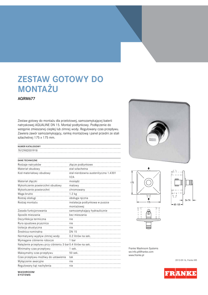 ZESTAW GOTOWY DO MONTAŻU AQRM677 Zestaw gotowy do montażu dla przelotowej, samozamykającej baterii natryskowej AQUALINE DN 15. Montaż podtynkowy. Podłączenie do wstępnie zmieszanej ciepłej lub zimnej wody. Regulowany czas przepływu. Zawiera zawór samozamykający, ramkę montażową i panel przedni ze stali szlachetnej 175 x 175 mm. NUMER KATALOGOWY 7612982001918 DANE TECHNICZNE Rodzaje natrysków Materiał obudowy Kod materiałowy obudowy złącze podtynkowe stal szlachetna stal nierdzewna austenityczna 1.4301 V2A Materiał złączki mosiądz Wykończenie powierzchni obudowy matowy Wykończenie powierzchni chromowany Waga brutto 1.2 kg Rodzaj obsługi obsługa ręczna Rodzaj montażu instalacja podtynkowa w puszce montażowej Zasada funkcjonowania samozamykający hydraulicznie Sposób mieszania bez mieszania Dezynfekcja termiczna nie Rura spustowa prysznica nie Izolacja akustyczna nie Średnica nominalna DN 15 Normatywny wypływ zimnej wody 0.2 litrów na sek. Wymagane ciśnienie robocze 1 bar Natężenie przepływu przy ciśnieniu 3 bar0.4 litrów na sek. Minimalny czas przepływu 1 sek. Maksymalny czas przepływu 50 sek. Czas przepływu możliwy do ustawienia tak Wyłączenie awaryjne nie Regulowany kąt nachylenia nie Franke Washroom Systems [email protected] www.franke.pl 2012-09-16, Franke WS