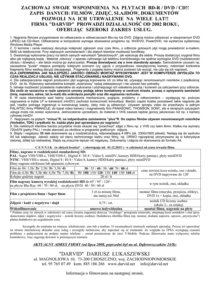 ZACHOWAJ SWOJE WSPOMNIENIA NA PŁYTACH BD-R / DVD / CD!! ZAPIS DANYCH: FILMÓW, ZDJĘĆ, SLAJDÓW, DOKUMENTÓW POZWOLI NA ICH UTRWALENIE NA WIELE LAT!! FIRMA "DARVID" PROWADZI DZIAŁALNOŚĆ OD 2002 ROKU, OFERUJĄC SZEROKI ZAKRES USŁUG. 1. Nagrania filmowe przygotowane do odtwarzania w odtwarzaczach Blu-ray lub DVD. Zdjęcia można odtwarzać w stacjonarnym DVD (JPEG) lub CD-Rom. Odtwarzanie w komputerze wymaga stosowania programu np. WinDVD, PowerDVD, nie wystarcza systemowy Windows Media Player. 2. O terminie i cenie realizacji decyduje kolejność zgłoszeń oraz czas filmu, o odbiorze gotowych płyt mogę powiadomić e-mailem, SMS lub telefonicznie. Przy większych zamówieniach i dla stałych klientów możliwość bonifikaty. 3. Gwarantuję wykonanie pracy na takich samych warunkach "jakościowych", jak wykonuję dla siebie. Proszę dostarczyć oryginał filmu albo jak najlepszą kopię . Materiał „roboczy” z aparatu cyfrowego lub telefonu komórkowego nie spełnia wymogów DVD (rozdzielczość obrazu i dźwięku) – ale także można go wykorzystać. Proszę dowiadywać się o inne standardy sprzętu. Samodzielnie usuwam np. zauważone "puste" miejsca pomiędzy kolejnymi scenami czy ujęcia z przypadkowo niewyłączonej kamery, natomiast konkretne fragmenty filmu według decyzji zlecającego. Fragmenty z pogiętej taśmy można zostawić lub wyciąć, nie uda się ich naprawić. DLA ZAPEWNIENIA JAK NAJLEPSZEJ JAKOŚCI OBRAZU MONTAŻ WYKONYWANY JEST W KOMPUTERZE (WYDŁUŻA TO CZAS REALIZACJI USŁUGI), NIE UŻYWAM STACJONARNEJ NAGRYWARKI DVD. 4. Dla zabezpieczenia nagrań producenci płyt sugerują kopiowanie ich co kilka lat, używając renomowanych nośników z prędkością: DVD do 4x. Wykonany samodzielnie komplet „rezerwowy” radzę zabezpieczyć i nie używać bez potrzeby. 5. Istnieje możliwość przesłania materiałów do wykonania i późniejszego ich odesłania pocztą / kurierem za zaliczeniem przy odbiorze. Dla osób ze szczecina w razie zawarcia umowy podaję adres kontaktowy w centrum miasta. proszę o opisywanie zamówień (imię, nazwisko, adres, tel./e-mail) dla uniknięcia pomyłki oraz dla wypisania rachunku. 6. W razie stwierdzenia wad taśmy (uszkodzenia mechaniczne, pogięcie, problemy z odtworzeniem – występują np. podczas nagrywania w trybie LP w kamerach miniDV) zachodzi konieczność konsultacji. Bardzo często trzeba pozostawić takie nagranie jak jest, rzadko pomaga ingerencja w konstrukcję kasety, żeby móc ją odtworzyć. Używam sprzętu video do przechwytu w pełnym PAL/NTSC firmy PINNACLE; do kaset video kamery i magnetowidy firm PANASONIC, THOMSON, SONY, ale w skrajnych sytuacjach usługa może nie zostać wykonana. Jednocześnie uprzedzam, że materiał z VHS zawsze będzie gorszy jakościowo niż np. z kamery cyfrowej miniDV. 7. Nagrywam na płytach ”minus”R, na indywidualne zamówienie ”plus”R. Do zapisu filmów używam renomowanych nośników (Verbatim, TDK) i prędkość 4x. każda płyta jest sprawdzana po nagraniu! 8. Dla niektórych klientów bardzo przydatne może okazać się “przechwyt” zdjęć z filmu np. z VHS czy taśm 8mm. Klatka ma wymiary 720x576 (pełny PAL) i może stanowić po obróbce w programie graficznym zdjęcie. 9. Slajdy i negatywy 35 mm skanowane są z rozdzielczością, odpowiadającą 4 MPx (ok. 2300x1600 pikseli). Nadają się do wydruku A5 lub większego. Jakość zależy od stanu technicznego kadru oraz firmy, np. ORWO najczęściej utrzymywane są w kolorystyce zielonej, żółtej lub niebieskiej. Slajdy są znacznie lepsze niż negatywy. Dokumenty i zdjęcia do skanowania do formatu A4. C E N N I K (w złotych brutto)* ( obowiązuje od: 01.12.2015 ) - w zależności od czasu trwania filmu Filmy, nagrane w rozdzielczości standardowej SD: PAL: Super VHS/VHS-c, VHS/VHS-C, Digital 8 / Hi 8 / Video 8, miniDV, kamery HDD/karty pamięci, płyty miniDVD NTSC: VHS/VHS-c mono, Digital 8 / Hi 8 / Video 8, kamery HDD/karty pamięci, płyty miniDVD filmy nagrane telefonem lub aparatem cyfrowym Film do 1h/ 1,5h/ 2h/ 2,5h/ 3h/ 3,5h/ 4h 30 / 35 / 40 / 50 / 60/ 70 / 80 zł cena zawiera koszt nośnika, etui i okładki, Film do 4,5h/ 5h/ 5,5h/ 6h/ 6,5h/ 7h/ 7,5h/ 8h 90/ 100/ 110/ 120/ 130/ 140/ 150/ 160 zł na DVD nagrywane do 120' Kolejne godziny nagrań 20 zł / h Film nagrany kamerą wysokiej rozdzielczości HD do 65' / 95' / 120' : w tym nośnik, etui, okładka na płycie Blu-Ray: 60 / 70 / 80 zł, na płycie DVD 40 / 50 / 60 zł Film z projektora 8mm / Super 8mm Zdjęcie / kadr z negatywu / slajd Wideofilmowanie 3 zł za minutę filmu, nie mniej niż 50zł 0,75 / szt. umowa indywidualna montaż filmu (muzyka, przejścia, efekty), DVD 1x + kopia, etui, okładka nośnik CD liczony osobno (około 2,- za sztukę) montaż filmu, nagranie na płyty * Podane ceny (w złotych w zależności od czasu trwania nagrania) dotyczą “zwykłego” przegrania materiału, obejmują koszt nośników i etui (przy skanowaniu slajdów, zdjęć i negatywów – nośnik liczony osobno). Dodatkowa obróbka filmu (np. montaż, dodanie napisów, oprawa „artystyczna”) płatna dodatkowo po uzgodnieniu ceny. Szczegóły do ustalenia na miejscu, telefonicznie, sms lub e-mailem. O ewentualnych istotnych zmianach uprzedzę. Proszę też sprawdzać na stronie internetowej aktualne ceny usług i szczegóły techniczne, aby zapoznać się ze zmianami. Ze względu na TPSA występują czasami problemy z połączeniem na podany numer telefonu – został przeniesiony do sieci T-Mobile. Podczas filmowania mam wyłączony telefon komórkowy, więc sugeruję dzwonić w późniejszym terminie. AKTUALNY ADRES FIRMY (od lipca 2008, poprzedni był na ul. Dąbrowszczaków 24/8): "DARVID" DARIUSZ ŁUKASZEWSKI ul. MAGNOLIOWA 10, 73-200 CHOSZCZNO, woj. ZACHODNIOPOMORSKIE tel. 95 765 07 49 kom. 885 186 266 www.darvid.net [email protected] Informacja o filmowaniu na następnej stronie. Filmowanie w wysokiej rozdzielczości 1920x1080 50p, film 