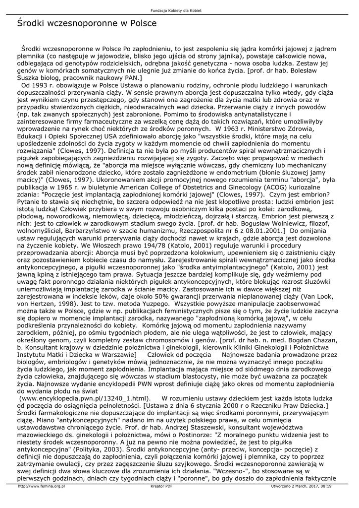 Fundacja Kobiety dla Kobiet Środki wczesnoporonne w Polsce Środki wczesnoporonne w Polsce Po zapłodnieniu, to jest zespoleniu się jądra komórki jajowej z jądrem plemnika (co następuje w jajowodzie, blisko jego ujścia od strony jajnika), powstaje całkowicie nowa, odbiegająca od genotypów rodzicielskich, odrębna jakość genetyczna - nowa osoba ludzka. Zestaw jej genów w komórkach somatycznych nie ulegnie już zmianie do końca życia. [prof. dr hab. Bolesław Suszka biolog, pracownik naukowy PAN.] Od 1993 r. obowiązuje w Polsce Ustawa o planowaniu rodziny, ochronie płodu ludzkiego i warunkach dopuszczalności przerywania ciąży. W sensie prawnym aborcja jest dopuszczalna tylko wtedy, gdy ciąża jest wynikiem czynu przestępczego, gdy stanowi ona zagrożenie dla życia matki lub zdrowia oraz w przypadku stwierdzonych ciężkich, nieodwracalnych wad dziecka. Przerwanie ciąży z innych powodów (np. tak zwanych społecznych) jest zabronione. Pomimo to środowiska antynatalistyczne i zainteresowane firmy farmaceutyczne za wszelką cenę dążą do takich rozwiązań, które umożliwiłyby wprowadzenie na rynek choć niektórych ze środków poronnych. W 1963 r. Ministerstwo Zdrowia, Edukacji i Opieki Społecznej USA zdefiniowało aborcję jako "wszystkie środki, które mają na celu upośledzenie zdolności do życia zygoty w każdym momencie od chwili zapłodnienia do momentu rozwiązania" (Clowes, 1997). Definicja ta nie była po myśli producentów spiral wewnątrzmacicznych i pigułek zapobiegających zagnieżdżeniu rozwijającej się zygoty. Zaczęto więc propagować w mediach nową definicję mówiącą, że "aborcja ma miejsce wyłącznie wówczas, gdy chemiczny lub mechaniczny środek zabił nienarodzone dziecko, które zostało zagnieżdżone w endometrium (błonie śluzowej jamy macicy)" (Clowes, 1997). Ukoronowaniem akcji promocyjnej nowego rozumienia terminu "aborcja", była publikacja w 1965 r. w biuletynie American College of Obstetrics and Ginecology (ACOG) kuriozalne zdania: "Poczęcie jest implantacją zapłodnionej komórki jajowej" (Clowes, 1997). Czym jest embrion? Pytanie to stawia się niechętnie, bo szczera odpowiedź na nie jest kłopotliwe prosta: ludzki embrion jest istotą ludzką! Człowiek przybiera w swym rozwoju osobniczym kilka postaci po kolei: zarodkową, płodową, noworodkową, niemowlęcą, dziecięcą, młodzieńczą, dojrzałą i starczą. Embrion jest pierwszą z nich: jest to człowiek w zarodkowym stadium swego życia. [prof. dr hab. Bogusław Wolniewicz, filozof, wolnomyśliciel, Barbarzyństwo w szacie humanizmu, Rzeczpospolita nr 6 z 08.01.2001.] Do omijania ustaw regulujących warunki przerywania ciąży dochodzi nawet w krajach, gdzie aborcja jest dozwolona na życzenie kobiety. We Włoszech prawo 194/78 (Katolo, 2001) reguluje warunki i procedury przeprowadzania aborcji: Aborcja musi być poprzedzona kolokwium, upewnieniem się o zaistnieniu ciąży oraz pozostawieniem kobiecie czasu do namysłu. Zarejestrowanie spirali wewnątrzmacicznej jako środka antykoncepcyjnego, a pigułki wczesnoporonnej jako "środka antyimplantacyjnego" (Katolo, 2001) jest jawną kpiną z istniejącego tam prawa. Sytuacja jeszcze bardziej komplikuje się, gdy weźmiemy pod uwagę fakt poronnego działania niektórych pigułek antykoncepcyjnych, które blokując rozrost śluzówki uniemożliwiają implantację zarodka w ścianie macicy. Zastosowanie ich w dawce większej niż zarejestrowana w indeksie leków, daje około 50% gwarancji przerwania nieplanowanej ciąży (Van Look, von Hertzen, 1998). Jest to tzw. metoda Yuzpego. Wszystkie powyższe manipulacje zaobserwować można także w Polsce, gdzie w np. publikacjach feministycznych pisze się o tym, że życie ludzkie zaczyna się dopiero w momencie implantacji zarodka, nazywanego "zapłodnioną komórką jajową", w celu podkreślenia przynależności do kobiety. Komórkę jajową od momentu zapłodnienia nazywamy zarodkiem, później, po ośmiu tygodniach płodem, ale nie ulega wątpliwości, że jest to człowiek, mający określony genom, czyli kompletny zestaw chromosomów i genów. [prof. dr hab. n. med. Bogdan Chazan, b. Konsultant krajowy w dziedzinie położnictwa i ginekologii, kierownik Kliniki Ginekologii i Położnictwa Instytutu Matki i Dziecka w Warszawie] Człowiek od poczęcia Najnowsze badania prowadzone przez biologów, embriologów i genetyków mówią jednoznacznie, że nie można wyznaczyć innego początku życia ludzkiego, jak moment zapłodnienia. Implantacja mająca miejsce od siódmego dnia zarodkowego życia człowieka, znajdującego się wówczas w stadium blastocysty, nie może być uważana za początek życia. Najnowsze wydanie encyklopedii PWN wprost definiuje ciążę jako okres od momentu zapłodnienia do wydania płodu na świat (www.encyklopedia.pwn.pl/13240_1.html). W rozumieniu ustawy dzieckiem jest każda istota ludzka od poczęcia do osiągnięcia pełnoletności. [Ustawa z dnia 6 stycznia 2000 r o Rzeczniku Praw Dziecka.] Środki farmakologiczne nie dopuszczające do implantacji są więc środkami poronnymi, przerywającym ciążę. Miano "antykoncepcyjnych" nadano im na użytek polskiego prawa, w celu ominięcia ustawodawstwa chroniącego życie. Prof. dr hab. Andrzej Staszewski, konsultant województwa mazowieckiego ds. ginekologii i położnictwa, mówi o Postinorze: "Z moralnego punktu widzenia jest to niestety środek wczesnoporonny. A już na pewno nie można powiedzieć, że jest to pigułka antykoncepcyjna" (Polityka, 2003). Środki antykoncepcyjne (anty- przeciw, koncepcja- poczęcie) z definicji nie dopuszczają do zapłodnienia, czyli połączenia komórki jajowej i plemnika, czy to poprzez zatrzymanie owulacji, czy przez zagęszczenie śluzu szyjkowego. Środki wczesnoporonne zawierają w swej definicji dwa słowa kluczowe dla zrozumienia ich działania. "Wczesno-", bo stosowane są w pierwszych godzinach, dniach czy tygodniach ciąży i 