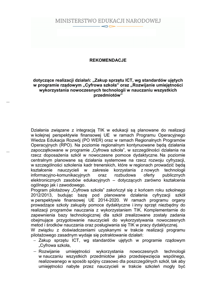 REKOMENDACJE dotyczące realizacji działań: „Zakup sprzętu ICT, wg standardów ujętych w programie rządowym „Cyfrowa szkoła” oraz „Rozwijanie umiejętności wykorzystania nowoczesnych technologii w nauczaniu wszystkich przedmiotów” Działania związane z integracją TIK w edukacji są planowane do realizacji w kolejnej perspektywie finansowej UE w ramach Programu Operacyjnego Wiedza Edukacja Rozwój (PO WER) oraz w ramach Regionalnych Programów Operacyjnych (RPO). Na poziomie regionalnym kontynuowane będą działania zapoczątkowane w programie „Cyfrowa szkoła”, w szczególności działania na rzecz doposażenia szkół w nowoczesne pomoce dydaktyczne. Na poziomie centralnym planowane są działania systemowe na rzecz rozwoju cyfryzacji, w szczególności szkolenia kadr trenerskich, które w regionach prowadzić będą kształcenie nauczycieli w zakresie korzystania z nowych technologii informacyjno-komunikacyjnych oraz rozbudowa oferty publicznych elektronicznych zasobów edukacyjnych – dotyczących zarówno kształcenia ogólnego jak i zawodowego. Program pilotażowy „Cyfrowa szkoła” zakończył się z końcem roku szkolnego 2012/2013, budując bazę pod planowane działania cyfryzacji szkół w perspektywie finansowej UE 2014-2020. W ramach programu organy prowadzące szkoły zakupiły pomoce dydaktyczne i inny sprzęt niezbędny do realizacji programów nauczania z wykorzystaniem TIK. Komplementarnie do zapewnienia bazy technologicznej dla szkół zrealizowane zostały zadania obejmujące przygotowanie nauczycieli do wykorzystywania nowoczesnych metod i środków nauczania oraz posługiwania się TIK w pracy dydaktycznej. W związku z doświadczeniami uzyskanymi w trakcie realizacji programu pilotażowego zasadnym wydaje się potraktowanie działań: − Zakup sprzętu ICT, wg standardów ujętych w programie rządowym „Cyfrowa szkoła, − Rozwijanie umiejętności wykorzystania nowoczesnych technologii w nauczaniu wszystkich przedmiotów jako przedsięwzięcia wspólnego, realizowanego w sposób spójny czasowo dla poszczególnych szkół, tak aby umiejętności nabyte przez nauczycieli w trakcie szkoleń mogły być wykorzystywane przy prowadzeniu lekcji z wykorzystaniem zakupionego sprzętu komputerowego. Poniższe rekomendacje prezentują takie właśnie podejście. Podstawa prawna oraz kontekst realizacji działania Znaczenie technologii informacyjno-komunikacyjnych, zwanych dalej „TIK”, dla rozwoju społeczno-gospodarczego Polski i Europy, zostało podkreślone w krajowych i europejskich dokumentach strategicznych. Zgodnie z założeniami dokumentu „Europa 2020. Strategia na rzecz inteligentnego i zrównoważonego rozwoju sprzyjającego włączeniu społecznemu”, zwiększenie roli wiedzy i innowacji uważane jest za siłę napędową przyszłego rozwoju i podstawę budowania przewag konkurencyjnych Unii Europejskiej na rynkach światowych. Podkreśla się, że przygotowywanie dzieci i młodzieży do korzystania z TIK rozszerza ich możliwości funkcjonowania w późniejszym życiu społecznozawodowym. 1. Długookresowa Strategia Rozwoju Kraju. Polska 2030 Strategia zwraca uwagę na wymiar terytorialny podejmowanych działań, wzmocnienie i lepsze wykorzystanie potencjałów regionalnych. Widzi zatem znaczenie włączenia samorządu terytorialnego i innych podmiotów w dynamizację rozwoju regionów i kraju. Jednym z celów strategicznych jest rozwój kapitału ludzkiego. Priorytetowym kierunkiem interwencji wskazywanym dla tego celu jest poprawa jakości kapitału ludzkiego. Priorytetowym zaś zadaniem państwa, w kontekście zmieniających się potrzeb rynku pracy, jest wyrównywanie szans edukacyjnych na wszystkich etapach kształcenia i podnoszenie jakości usług edukacyjnych. W ramach działań strategicznych reforma edukacji ukierunkowana zostanie na podwyższenie jakości i efektywności kształcenia, odpowiadających warunkom gospodarki opartej na wiedzy. Działania w tym obszarze są następujące: − upowszechnianie edukacji cyfrowej i medialnej na wszystkich poziomach kształcenia formalnego (programy podnoszenia kompetencji kadr nauczających, − wykorzystanie technologii cyfrowych w całym procesie nauczania – klasy „laptopowe” w szkołach, − wdrożenie programów edukacji cyfrowej i medialnej w ramach edukacji szkolnej). Cel 3 - Poprawa dostępności i jakości edukacji na wszystkich etapach oraz podniesienie konkurencyjności nauki Kierunek interwencji - Wprowadzenie nowych modeli kształcenia i rozwoju kompetencji zawodowych nauczycieli oraz kariery zawodowej nauczycieli, str. 2 sprzyjających wybieraniu zawodu nauczyciela i pozostawania w nim najlepszych. Realizacja nastąpi między innymi poprzez wprowadzenie do standardów kształcenia nauczycieli zasady nabywania umiejętności teoretycznych w ścisłym związku i na podstawie doświadczeń praktycznych oraz obowiązku uzyskania przez nauczycieli umiejętności wykorzystywania nowoczesnych technologii w nauczaniu wszystkich przedmiotów. Kierunek interwencji - Podnoszenie jakości edukacji poprzez zorientowanie na efekty uczenia się, w szczególności w zakresie kluczowych kompetencji, a także personalizację nauczania oraz ewaluację pracy szkół i placówek. Realizacja tego kierunku nastąpi między innymi poprzez upowszechnienie nowoczesnych technologii komunikacyjnych i informacyjnych jako środków dydaktycznych podczas wszystkich zajęć edukacyjnych w szkole oraz upowszechnienie kształtowania umiejętności sprawnego i krytycznego ich wykorzystywania przez uczniów. Cel 5 – Stworzenie Polski Cyfrowej Kierunek interwencji - Budowanie kompetencji cyfrowych osób nauczających (m.in. nauczycieli, pracowników innych instytucji edukacyjnych i kultury, pracowników organizacji pozarządowych) i wdrożenie powszechnej edukacji cyfrowej oraz stworzenie nowoczesnej sieciowej infrastruktury i zasobów edukacyjnych. Realizacja tego kierunku będzie odbyw