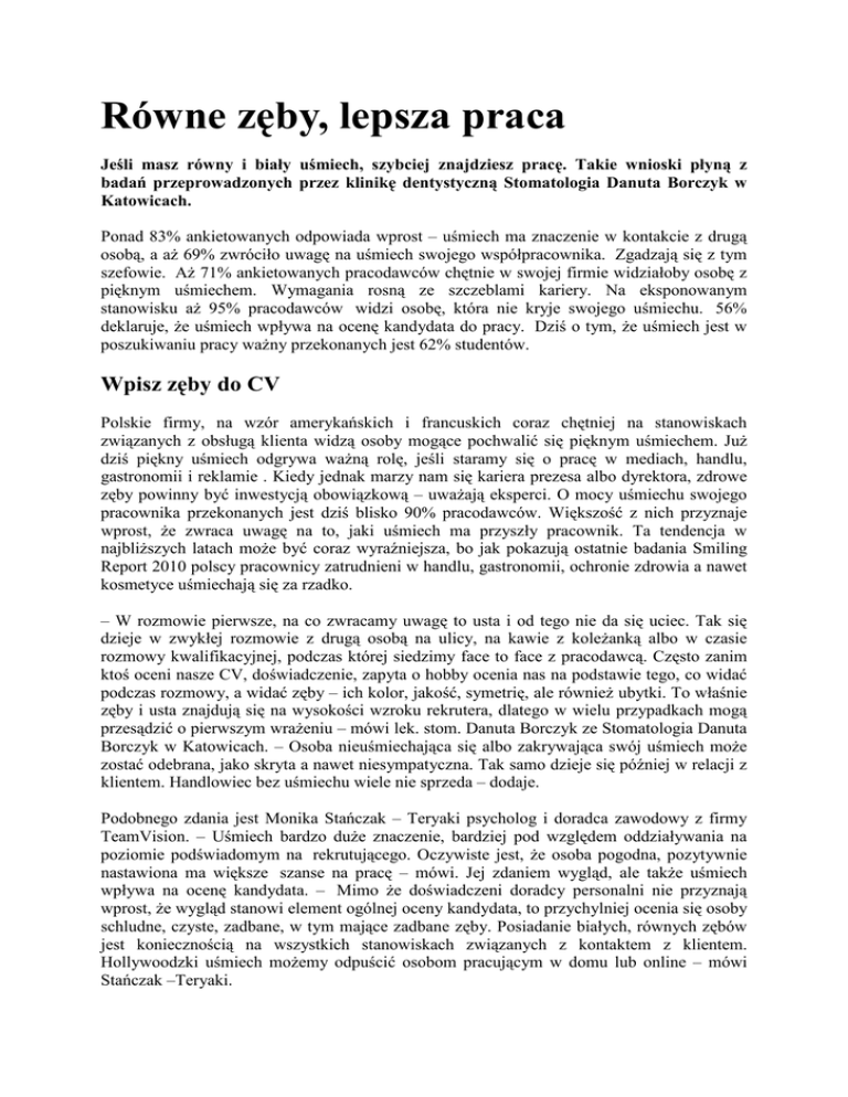 Równe zęby, lepsza praca Jeśli masz równy i biały uśmiech, szybciej znajdziesz pracę. Takie wnioski płyną z badań przeprowadzonych przez klinikę dentystyczną Stomatologia Danuta Borczyk w Katowicach. Ponad 83% ankietowanych odpowiada wprost – uśmiech ma znaczenie w kontakcie z drugą osobą, a aŜ 69% zwróciło uwagę na uśmiech swojego współpracownika. Zgadzają się z tym szefowie. AŜ 71% ankietowanych pracodawców chętnie w swojej firmie widziałoby osobę z pięknym uśmiechem. Wymagania rosną ze szczeblami kariery. Na eksponowanym stanowisku aŜ 95% pracodawców widzi osobę, która nie kryje swojego uśmiechu. 56% deklaruje, Ŝe uśmiech wpływa na ocenę kandydata do pracy. Dziś o tym, Ŝe uśmiech jest w poszukiwaniu pracy waŜny przekonanych jest 62% studentów. Wpisz zęby do CV Polskie firmy, na wzór amerykańskich i francuskich coraz chętniej na stanowiskach związanych z obsługą klienta widzą osoby mogące pochwalić się pięknym uśmiechem. JuŜ dziś piękny uśmiech odgrywa waŜną rolę, jeśli staramy się o pracę w mediach, handlu, gastronomii i reklamie . Kiedy jednak marzy nam się kariera prezesa albo dyrektora, zdrowe zęby powinny być inwestycją obowiązkową – uwaŜają eksperci. O mocy uśmiechu swojego pracownika przekonanych jest dziś blisko 90% pracodawców. Większość z nich przyznaje wprost, Ŝe zwraca uwagę na to, jaki uśmiech ma przyszły pracownik. Ta tendencja w najbliŜszych latach moŜe być coraz wyraźniejsza, bo jak pokazują ostatnie badania Smiling Report 2010 polscy pracownicy zatrudnieni w handlu, gastronomii, ochronie zdrowia a nawet kosmetyce uśmiechają się za rzadko. – W rozmowie pierwsze, na co zwracamy uwagę to usta i od tego nie da się uciec. Tak się dzieje w zwykłej rozmowie z drugą osobą na ulicy, na kawie z koleŜanką albo w czasie rozmowy kwalifikacyjnej, podczas której siedzimy face to face z pracodawcą. Często zanim ktoś oceni nasze CV, doświadczenie, zapyta o hobby ocenia nas na podstawie tego, co widać podczas rozmowy, a widać zęby – ich kolor, jakość, symetrię, ale równieŜ ubytki. To właśnie zęby i usta znajdują się na wysokości wzroku rekrutera, dlatego w wielu przypadkach mogą przesądzić o pierwszym wraŜeniu – mówi lek. stom. Danuta Borczyk ze Stomatologia Danuta Borczyk w Katowicach. – Osoba nieuśmiechająca się albo zakrywająca swój uśmiech moŜe zostać odebrana, jako skryta a nawet niesympatyczna. Tak samo dzieje się później w relacji z klientem. Handlowiec bez uśmiechu wiele nie sprzeda – dodaje. Podobnego zdania jest Monika Stańczak – Teryaki psycholog i doradca zawodowy z firmy TeamVision. – Uśmiech bardzo duŜe znaczenie, bardziej pod względem oddziaływania na poziomie podświadomym na rekrutującego. Oczywiste jest, Ŝe osoba pogodna, pozytywnie nastawiona ma większe szanse na pracę – mówi. Jej zdaniem wygląd, ale takŜe uśmiech wpływa na ocenę kandydata. – Mimo Ŝe doświadczeni doradcy personalni nie przyznają wprost, Ŝe wygląd stanowi element ogólnej oceny kandydata, to przychylniej ocenia się osoby schludne, czyste, zadbane, w tym mające zadbane zęby. Posiadanie białych, równych zębów jest koniecznością na wszystkich stanowiskach związanych z kontaktem z klientem. Hollywoodzki uśmiech moŜemy odpuścić osobom pracującym w domu lub online – mówi Stańczak –Teryaki. Uśmiech Polaka, czyli co zobaczy pracodawca Przy tym wszystkim trzeba jeszcze mieć czym pochwalić się przyszłemu pracodawcy. Tymczasem dziś blisko 99% dorosłych Polaków ma próchnicę. Tylko 6% ankietowanych korzysta z najprostszego zabiegu estetycznego, jakim jest wybielanie. 4% Polaków nosi aparat ortodontyczny. Najczęstszym zabiegiem wciąŜ jest usuwanie zębów. Taki zabieg wybiera 28% Polaków – podaje serwis dentysta.eu. Jednocześnie aŜ 32% ankietowanych za powód swoich regularnych wizyt u dentysty podaje pracę – to juŜ dane Stomatologia Danuta Borczyk. - O zdrowe zęby wciąŜ dbają bardziej osoby na eksponowanych stanowiskach lub marzące o awansie, trudno, bowiem sobie wyobrazi prezesa duŜej firmy, albo managera korporacji z ubytkami zębów i z przebarwieniami. Niejednokrotnie w moim fotelu siadał biznesmen, który po podróŜy za granicę, na widok pięknych uśmiechów swoich partnerów biznesowych, poczuł potrzebę zadbania obok ubioru, samochodu o swój uśmiech – opowiada dr Danuta Borczyk. Jednocześnie jak zauwaŜa dr Danuta Borczyk świadomość Polaków związana z rolą uśmiechu w Ŝyciu zawodowym wzrasta. – Coraz częściej zdajemy sobie sprawę z tego, Ŝe ładne zęby to nie tylko zdrowie, ale takŜe szansa, jaką sobie stwarzamy, szansa na awans i rozwój. I chociaŜ uśmiech nigdy nie zastąpi dobrego wykształcenia, doświadczenia ani naszej osobowości, moŜe dopomóc, zostawiając przynajmniej dobre pierwsze wraŜenie I nie chodzi bynajmniej o to, Ŝebyśmy wszyscy prezentowali białe, "hollywoodzkie' zęby, raczej , Ŝeby harmonijny uśmiech dopełniał wygląd całej twarzy. Dobrze byłoby wytworzyć taki pozytywny rodzaj "snobizmu" - obok krawatów, okularów, zadbajmy o nasze uśmiechy, wtedy dopiero zagra całość – wyjaśnia. Jak przygotować uśmiech do rozmowy kwalifikacyjnej? O pięknym uśmiechu w kategorii inwestycji w karierę myśli dziś blisko 45% kobiet. Wśród męŜczyzn odsetek ten wynosi 35% Ale kiedykolwiek przed rozmową kwalifikacyjną u dentysty było juŜ tylko 2% ankietowanych. Zdaniem dr Danuty Borczyk przed rozmową kwalifikacyjną i poszukiwaniem pracy powinniśmy zadbać o swój uśmiech tak samo, jak o dobrze skrojone CV. - Podczas rozmowy kwalifikacyjnej jesteśmy nieustannie oceniani. Oceniany jest takŜe nasz wygląd. Oceniany jest uśmiech. Ten podobnie jak nową koszulę i spódnicę moŜna sobie zafundować. Najprostszym dziś zabiegiem, który poprawi wygląd naszych zębów jest wybielanie. Rozjaśni ono zęby o kilka tonów i 