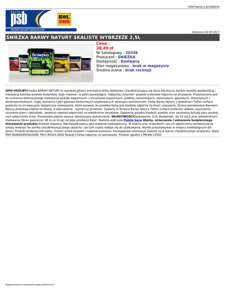 Informacje o produkcie Utworzono 02-03-2017 ŚNIEŻKA BARWY NATURY SKALISTE WYBRZEŻE 2,5L Cena : 38,49 zł Nr katalogowy : 20346 Producent : ŚNIEŻKA Dostępność : Dostępny Stan magazynowy : brak w magazynie Średnia ocena : brak recenzji OPIS OGÓLNYŚnieżka BARWY NATURY to wysokiej jakości emulsyjna farba lateksowa charakteryzującą się dużą siłą krycia, bardzo wysoką wydajnością i trwałością kolorów powłoki malarskiej. Daje matowe i w pełni pozwalające "oddychać ścianom" powłoki malarskie odporne na zmywanie. Przeznaczona jest do ochronno-dekoracyjnego malowania tynków wapiennych i cementowo-wapiennych, podłoży cementowych, betonowych, gipsowych, drewnianych i drewnopochodnych, cegły, kamienia i płyt gipsowo-kartonowych użytkowanych wewnątrz pomieszczeń. Farby Barwy Natury z dodatkiem Teflon surface protector to innowacyjne, bezpieczne rozwiązanie, które sprawia, że powłoka farby jest bardziej odporna na brud i zmywanie. Ściany pomalowane Barwami Natury pozostają piękne na dłużej, a zabrudzenia - wystarczy przetrzeć. Zawarty w Śnieżce Barwy Natury Teflon surface protector ułatwia czyszczenie, usuwanie plam i zabrudzeń, zwiększa również odporność na wielokrotne zmywanie. Zapewnia wysoką trwałość powłoki oraz swobodną dyfuzję pary wodnej, czyli oddychanie ścian. Pozostawia piękne wysoce dekoracyjne wykończenie. WŁAŚCIWOŚCIOpakowanie: 2,5L Wydajność: do 14 m2/L przy jednokrotnym malowaniu Okres gwarancji: 48 m-ce licząc od daty produkcji Kolor: Skaliste wybrzeże Paleta barw Atesty, oznaczenia i wskazania bezpiecznego stosowania produktu Produkt niepalny. Nie klasyfikowany jako materiał niebezpieczny. W trakcie prac malarskich i po ich zakończeniu pomieszczenie należy wietrzyć do zaniku charakterystycznego zapachu i po tym czasie nadaje się do użytkowania. Wyrób przechowywać w miejscu niedostępnym dla dzieci. Produkt wodorozcieńczalny, chronić przed mrozem i nasłonecznieniem. Szczegółowe informacje zawarte są w karcie charakterystyki preparatu. Atest PZH HK/B/0295/04/2008 PN-C-81914:2002 Rodzaj I-Farba odporna na szorowanie. Produkt zgodny z PN-EN-13300 Wygenerowano w programie www.oscGold.com