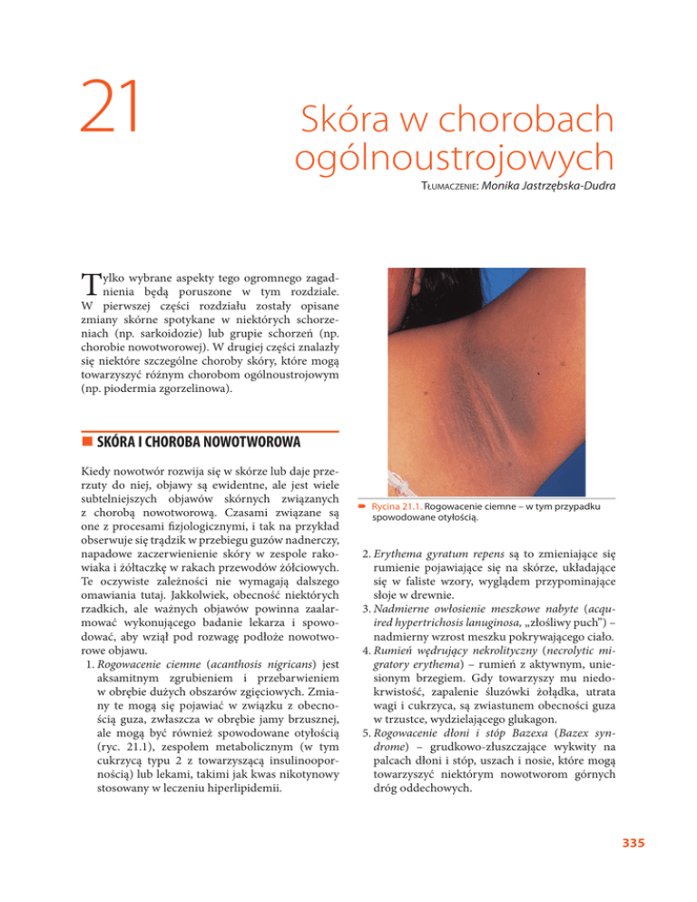 21 Skóra w chorobach ogólnoustrojowych TŁUMACZENIE: Monika Jastrzębska-Dudra T ylko wybrane aspekty tego ogromnego zagadnienia będą poruszone w tym rozdziale. W pierwszej części rozdziału zostały opisane zmiany skórne spotykane w niektórych schorzeniach (np. sarkoidozie) lub grupie schorzeń (np. chorobie nowotworowej). W drugiej części znalazły się niektóre szczególne choroby skóry, które mogą towarzyszyć różnym chorobom ogólnoustrojowym (np. piodermia zgorzelinowa). SKÓRA I CHOROBA NOWOTWOROWA Kiedy nowotwór rozwija się w skórze lub daje przerzuty do niej, objawy są ewidentne, ale jest wiele subtelniejszych objawów skórnych związanych z chorobą nowotworową. Czasami związane są one z procesami fizjologicznymi, i tak na przykład obserwuje się trądzik w przebiegu guzów nadnerczy, napadowe zaczerwienienie skóry w zespole rakowiaka i żółtaczkę w rakach przewodów żółciowych. Te oczywiste zależności nie wymagają dalszego omawiania tutaj. Jakkolwiek, obecność niektórych rzadkich, ale ważnych objawów powinna zaalarmować wykonującego badanie lekarza i spowodować, aby wziął pod rozwagę podłoże nowotworowe objawu. 1. Rogowacenie ciemne (acanthosis nigricans) jest aksamitnym zgrubieniem i przebarwieniem w obrębie dużych obszarów zgięciowych. Zmiany te mogą się pojawiać w związku z obecnością guza, zwłaszcza w obrębie jamy brzusznej, ale mogą być również spowodowane otyłością (ryc. 21.1), zespołem metabolicznym (w tym cukrzycą typu 2 z towarzyszącą insulinoopornością) lub lekami, takimi jak kwas nikotynowy stosowany w leczeniu hiperlipidemii. Rycina 21.1. Rogowacenie ciemne – w tym przypadku spowodowane otyłością. 2. Erythema gyratum repens są to zmieniające się rumienie pojawiające się na skórze, układające się w faliste wzory, wyglądem przypominające słoje w drewnie. 3. Nadmierne owłosienie meszkowe nabyte (acquired hypertrichosis lanuginosa, „złośliwy puch”) – nadmierny wzrost meszku pokrywającego ciało. 4. Rumień wędrujący nekrolityczny (necrolytic migratory erythema) – rumień z aktywnym, uniesionym brzegiem. Gdy towarzyszy mu niedokrwistość, zapalenie śluzówki żołądka, utrata wagi i cukrzyca, są zwiastunem obecności guza w trzustce, wydzielającego glukagon. 5. Rogowacenie dłoni i stóp Bazexa (Bazex syndrome) – grudkowo-złuszczające wykwity na palcach dłoni i stóp, uszach i nosie, które mogą towarzyszyć niektórym nowotworom górnych dróg oddechowych. 335 336 Rozdział 21 Skóra w chorobach ogólnoustrojowych 6. Zapalenie skórno-mięśniowe (dermatomyositis) z wyjątkiem choroby w okresie dzieciństwa (rozdz. 10), u około 30% dorosłych osób związane jest z nowotworami. Szczególnie należy zwrócić uwagę na jajniki, gdyż ten nowotwór może wzrastać bezobjawowo. 7. Uogólniony świąd. Jedną z wielu jego przyczyn może być nowotwór, zazwyczaj chłoniak (rozdz. 21). 8. Zakrzepowe zapalenie żył powierzchownych (thrombophlebitis) postać wędrująca, tradycyjnie wiązana jest z nowotworami trzustki. 9. Rybia łuska nabyta (acquired ichthyosis) może być wynikiem wielu chorób (rozdz. 4), ale zawsze należy wykluczyć nowotwory jako przyczynę, zwłaszcza chłoniaki. 10. Genodermatozy. Jednym z przykładów jest zespół Muira-Torre’a, w którym to nowotworom gruczołów łojowych towarzyszą zaskakująco mało agresywne nowotwory narządów wewnętrznych. 11. Ostra gorączkowa dermatoza neutrofilowa (zespół Sweeta; ryc. 21.2 i rozdz. 8). Rumieniowo-obrzękowym zmianom skórnym towarzyszy triada objawów: gorączka, przyspieszenie OB i podwyższony poziom neutrofili w surowicy. Do najważniejszych korelacji internistycznych należą choroby mieloproliferacyjne. 12. Pęcherzyca paraneoplastyczna (rozdz. 9). Jest podobna do pęcherzycy zwyczajnej, ale towarzy- szą jej rozsiane i uporczywe owrzodzenia błon śluzowych. Pęcherze na dłoniach i podeszwach wyglądają jak zmiany w przebiegu rumienia wielopostaciowego. Jednostka ta jest związana ze złośliwą mieloproliferacją, ale także innymi nowotworami złośliwymi. 13. Inne. Pachydermoperiostosis jest zgrubieniem skóry z towarzyszącym objawem palców pałeczkowatych. Schorzenie to może być dziedziczone w sposób autosomalny dominujący lub też może być wynikiem klasycznych przyczyn palców pałeczkowatych, takich jak nowotwory płuc. SKÓRA I CUKRZYCA Rycina 21.2. Ostra gorączkowa dermatoza neutrofilowa (zespół Sweeta). Rycina 21.3. Obumieranie tłuszczowate: połyskujące żółtawe ognisko plackowate z zaznaczonymi teleangiektazjami. Zmiany wymienione poniżej są znacznie częściej spotykane u osób z cukrzycą niż u pozostałych. 1. Obumieranie tłuszczowate. Mniej niż 3% diabetyków cierpi z powodu obumierania tłuszczowatego, ale 11-62% pacjentów z takimi zmianami skórnymi będzie miało cukrzycę. Pacjenci z obumieraniem tłuszczowatym bez cukrzycy w wywiadzie powinni być w jej kierunku diagnozowani, gdyż część z nich może mieć nietolerancję glukozy lub cukrzycę, a u innych cukrzyca rozwinie się później. Istnieje związek zarówno z typem 1 (wcześniej zwanym insulinozależnym) jak i ty- Rozdział 21 Rycina 21.4. Ziarniniak obrączkowaty. pem 2 (wcześniej zwanym insulinoniezależnym) cukrzycy. Na przedniej powierzchni goleni pojawia się wykwit jako obszar lub obszary o zmienionym kolorze (ryc. 21.3). Wczesne tarczki są fioletowe, ale w miarę ustępowania stanu zapalnego stają się atroficzne, błyszczące, brązowoczerwone lub lekko żółte. Naczynia krwionośne prześwitują przez atroficzną skórę, a brzegi mogą być rumieniowe lub fioletowe. Przyczyną wolno gojących się owrzodzeń mogą być niewielkie urazy; biopsja również. Nie ma sprawdzonego i skutecznego leczenia. Atrofia jest nieodwracalna; od leczenia można oczekiwać jedynie zahamowania postępu choroby. Zmiany są spowodowane zapaleniem, ale leczenie miejscowymi kortykoste