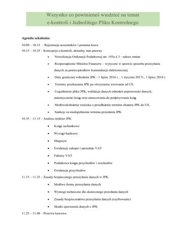 Wszystko co powinieneś wiedzieć na temat e-kontroli i Jednolitego Pliku Kontrolnego Agenda szkolenia: 10:00 – 10.15 – Rejestracja uczestników i poranna kawa 10.15 – 10.35 – Koncepcja e-kontroli, aktualny stan prawny Nowelizacja Ordynacji Podatkowej art. 193a § 3 - zakres zmian Rozporządzenie Ministra Finansów – wytyczne w sprawie sposobu przesyłania danych za pomocą środków komunikacji elektronicznej Daty graniczne wdrożenia JPK - 1 lipiec 2016 r. , 1 stycznia 2017r., 1 lipiec 2018 r. Terminy przekazania JPK po otrzymaniu wezwania od US. Uzgodnienie pliku JPK, walidacja danych odnośnie poprawności danych, autentyczności ksiąg oraz umocowania do podpisywania ksiąg Możliwość złożenia wniosku o przedłużenie terminu złożenia JPK do US. Sankcje za niedopełnienie terminu przesłania JPK 10.35 – 11.15 – Analiza struktur JPK Księgi rachunkowe Wyciągi bankowe Magazyn Ewidencje zakupu i sprzedaży VAT Faktury VAT Podatkowa księga przychodów i rozchodów Ewidencja przychodów 11.15 – 11.25 – Zasady bezpiecznego przesyłania danych w JPK Możliwe formy przesyłania danych Wymogi techniczne dla skutecznego przesłania danych Zasady bezpieczeństwa przesyłania danych (szyfrowanie) Skutki ujawnienia danych z JPK 11.25 – 11.40 – Przerwa kawowa 11.40 – 12.00 – Implementacja JPK w systemach informatycznych przedsiębiorstw Kto jest zobowiązany do stosowania JPK Terminy wprowadzenia JPK ze względu na wielkość przedsiębiorstwa Spodziewane problemy związane z implementacją JPK do systemów informatycznych Koszty związane z implementacją JPK Konsekwencje braku implementacji JPK Stanowisko Ministra Finansów w sprawie implementacji JPK 12.00 – 12.30 – Analiza zagadnieńbudzących wątpliwości interpretacyjne Czy JPK może nie zostać wypełniony w pełni (brak danych w księgach)? Czy możliwe jest wdrożenie JPK w trakcie roku podatkowego? Jakie będą skutki wprowadzenia JPK dla stosowania procedury MOSS? Czy dane z faktur papierowych powinny być wpisywane do JPK? Czy w JPK należy uwzględniać dane historyczne? Czy wprowadzenie JPK wpłynie na stosowanie standardów rachunkowości? Czy JPK będzie podlegało korekcie np. w przypadku skorygowania faktur VAT? JPK a wiele różnych systemów informatycznych w firmie (np. różne programy sprzedaży) Wysyłania danych za pośrednictwem nośników zewnętrznych lub elektronicznej bramki Ministerstwa Finansów 12.30 – 13.00 – Analiza techniczna i merytoryczna JPK JPK pod kątem nieprawidłowości technicznych i formalnych Walidacja techniczna poprawności danych Testy merytoryczne Symulacja e-kontroli Od JPK do deklaracji podatkowej – czy dane sumują się do deklaracji ? 13.00 – 13.30 – Pytania i odpowiedzi 13.30 – 14.00 –Rozdanie certyfikatów