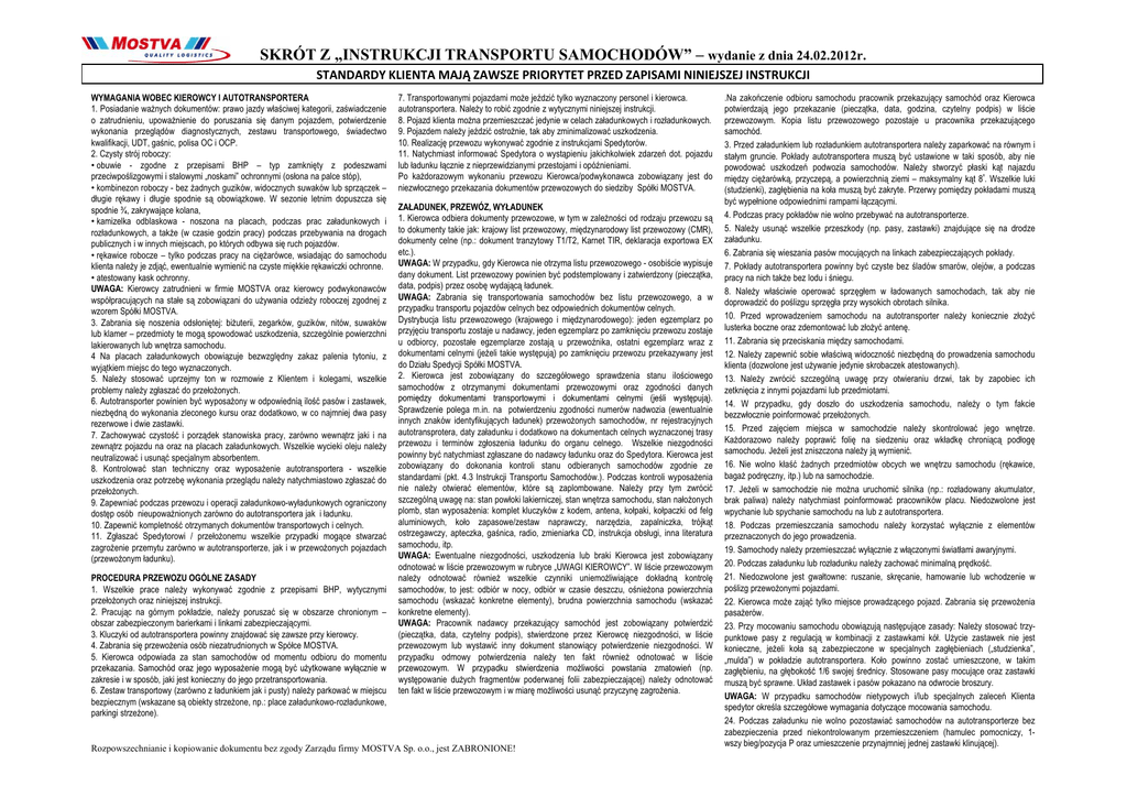 SKRÓT Z „INSTRUKCJI TRANSPORTU SAMOCHODÓW” – wydanie z dnia 24.02.2012r. STANDARDY KLIENTA MAJĄ ZAWSZE PRIORYTET PRZED ZAPISAMI NINIEJSZEJ INSTRUKCJI WYMAGANIA WOBEC KIEROWCY I AUTOTRANSPORTERA 1. Posiadanie ważnych dokumentów: prawo jazdy właściwej kategorii, zaświadczenie o zatrudnieniu, upoważnienie do poruszania się danym pojazdem, potwierdzenie wykonania przeglądów diagnostycznych, zestawu transportowego, świadectwo kwalifikacji, UDT, gaśnic, polisa OC i OCP. 2. Czysty strój roboczy: • obuwie - zgodne z przepisami BHP – typ zamknięty z podeszwami przeciwpoślizgowymi i stalowymi „noskami” ochronnymi (osłona na palce stóp), • kombinezon roboczy - bez żadnych guzików, widocznych suwaków lub sprzączek – długie rękawy i długie spodnie są obowiązkowe. W sezonie letnim dopuszcza się spodnie ¾, zakrywające kolana, • kamizelka odblaskowa - noszona na placach, podczas prac załadunkowych i rozładunkowych, a także (w czasie godzin pracy) podczas przebywania na drogach publicznych i w innych miejscach, po których odbywa się ruch pojazdów. • rękawice robocze – tylko podczas pracy na ciężarówce, wsiadając do samochodu klienta należy je zdjąć, ewentualnie wymienić na czyste miękkie rękawiczki ochronne. • atestowany kask ochronny. UWAGA: Kierowcy zatrudnieni w firmie MOSTVA oraz kierowcy podwykonawców współpracujących na stałe są zobowiązani do używania odzieży roboczej zgodnej z S MOSTVA. OS wzorem Spółki 3. Zabrania się noszenia odsłoniętej: biżuterii, zegarków, guzików, nitów, suwaków lub klamer – przedmioty te mogą spowodować uszkodzenia, szczególnie powierzchni lakierowanych lub wnętrza samochodu. 4 Na placach załadunkowych obowiązuje bezwzględny zakaz palenia tytoniu, z wyjątkiem miejsc do tego wyznaczonych. 5. Należy stosować uprzejmy ton w rozmowie z Klientem i kolegami, wszelkie problemy należy zgłaszać do przełożonych. 6 Autotransporter 6. A t t t powinien i i być b ć wyposażony ż w odpowiednią d i d i ilość il ść pasów ó i zastawek, t k niezbędną do wykonania zleconego kursu oraz dodatkowo, w co najmniej dwa pasy rezerwowe i dwie zastawki. 7. Zachowywać czystość i porządek stanowiska pracy, zarówno wewnątrz jaki i na zewnątrz pojazdu na oraz na placach załadunkowych. Wszelkie wycieki oleju należy neutralizować i usunąć specjalnym absorbentem. 8. Kontrolować stan techniczny oraz wyposażenie autotransportera - wszelkie uszkodzenia oraz potrzebę wykonania przeglądu należy natychmiastowo zgłaszać do przełożonych. ł ż h 9. Zapewniać podczas przewozu i operacji załadunkowo-wyładunkowych ograniczony dostęp osób nieupoważnionych zarówno do autotransportera jak i ładunku. 10. Zapewnić kompletność otrzymanych dokumentów transportowych i celnych. 11. Zgłaszać Spedytorowi / przełożonemu wszelkie przypadki mogące stwarzać zagrożenie przemytu zarówno w autotransporterze, jak i w przewożonych pojazdach (przewożonym ładunku). PROCEDURA PRZEWOZU OGÓLNE ZASADY 1. Wszelkie prace należy wykonywać zgodnie z przepisami BHP, wytycznymi przełożonych oraz niniejszej instrukcji. 2. Pracując na górnym pokładzie, należy poruszać się w obszarze chronionym – obszar zabezpieczonym barierkami i linkami zabezpieczającymi. 3. Kluczyki od autotransportera powinny znajdować się zawsze przy kierowcy. 4. Zabrania się przewożenia osób niezatrudnionych w Spółce MOSTVA. 5. Kierowca odpowiada za stan samochodów od momentu odbioru do momentu przekazania Samochód oraz jego wyposażenie mogą być użytkowane wyłącznie w przekazania. zakresie i w sposób, jaki jest konieczny do jego przetransportowania. 6. Zestaw transportowy (zarówno z ładunkiem jak i pusty) należy parkować w miejscu bezpiecznym (wskazane są obiekty strzeżone, np.: place załadunkowo-rozładunkowe, parkingi strzeżone). 7. Transportowanymi pojazdami może jeździć tylko wyznaczony personel i kierowca. autotransportera. Należy to robić zgodnie z wytycznymi niniejszej instrukcji. 8. Pojazd klienta można przemieszczać jedynie w celach załadunkowych i rozładunkowych. 9. Pojazdem należy jeździć ostrożnie, tak aby zminimalizować uszkodzenia. 10. Realizację przewozu wykonywać zgodnie z instrukcjami Spedytorów. 11. Natychmiast informować Spedytora o wystąpieniu jakichkolwiek zdarzeń dot. pojazdu lub ładunku łącznie z nieprzewidzianymi przestojami i opóźnieniami. Po każdorazowym wykonaniu przewozu Kierowca/podwykonawca zobowiązany jest do niezwłocznego przekazania dokumentów przewozowych do siedziby Spółki MOSTVA. ZAŁADUNEK, PRZEWÓZ, WYŁADUNEK 11. Kierowca odbiera dokumenty przewozowe, przewozowe w tym w zależności od rodzaju przewozu są to dokumenty takie jak: krajowy list przewozowy, międzynarodowy list przewozowy (CMR), dokumenty celne (np.: dokument tranzytowy T1/T2, Karnet TIR, deklaracja exportowa EX etc.). UWAGA: W przypadku, gdy Kierowca nie otrzyma listu przewozowego - osobiście wypisuje dany dokument. List przewozowy powinien być podstemplowany i zatwierdzony (pieczątka, data, podpis) przez osobę wydającą ładunek. UWAGA: Zabrania się transportowania samochodów bez listu przewozowego, a w przypadku transportu pojazdów celnych bez odpowiednich dokumentów celnych. celnych Dystrybucja listu przewozowego (krajowego i międzynarodowego): jeden egzemplarz po przyjęciu transportu zostaje u nadawcy, jeden egzemplarz po zamknięciu przewozu zostaje u odbiorcy, pozostałe egzemplarze zostają u przewoźnika, ostatni egzemplarz wraz z dokumentami celnymi (jeżeli takie występują) po zamknięciu przewozu przekazywany jest do Działu Spedycji Spółki MOSTVA. 2. Kierowca jest zobowiązany do szczegółowego sprawdzenia stanu ilościowego samochodów z otrzymanymi dokumentami przewozowymi oraz zgodności danych pomiędzy dokumentami transportowymi i dokumentami celnymi (jeśli występują). występują) Sprawdzenie polega m.in. na po