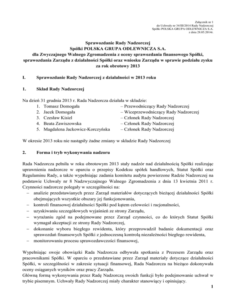 Załącznik nr 1 do Uchwały nr 34/III/2014 Rady Nadzorczej Spółki POLSKA GRUPA ODLEWNICZA S.A. z dnia 28.05.2014r. Sprawozdanie Rady Nadzorczej Spółki POLSKA GRUPA ODLEWNICZA S.A. dla Zwyczajnego Walnego Zgromadzenia z oceny sprawozdania finansowego Spółki, sprawozdania Zarządu z działalności Spółki oraz wniosku Zarządu w sprawie podziału zysku za rok obrotowy 2013 I. Sprawozdanie Rady Nadzorczej z działalności w 2013 roku 1. Skład Rady Nadzorczej Na dzień 31 grudnia 2013 r. Rada Nadzorcza działała w składzie: 1. Tomasz Domogała – Przewodniczący Rady Nadzorczej 2. Jacek Domogała – Wiceprzewodniczący Rady Nadzorczej 3. Czesław Kisiel – Członek Rady Nadzorczej 4. Beata Zawiszowska – Członek Rady Nadzorczej 5. Magdalena Jackowicz-Korczyńska – Członek Rady Nadzorczej W okresie 2013 roku nie nastąpiły żadne zmiany w składzie Rady Nadzorczej 2. Forma i tryb wykonywania nadzoru Rada Nadzorcza pełniła w roku obrotowym 2013 stały nadzór nad działalnością Spółki realizując uprawnienia nadzorcze w oparciu o przepisy Kodeksu spółek handlowych, Statut Spółki oraz Regulaminu Rady, a także wypełniając zadania komitetu audytu powierzone Radzie Nadzorczej na podstawie Uchwały nr 8 Nadzwyczajnego Walnego Zgromadzenia z dnia 13 kwietnia 2011 r. Czynności nadzorcze polegały w szczególności na: analizie przedstawianych przez Zarząd materiałów dotyczących bieżącej działalności Spółki obejmujących wszystkie obszary jej funkcjonowania, kontroli finansowej działalności Spółki pod kątem celowości i racjonalności, uzyskiwaniu szczegółowych wyjaśnień ze strony Zarządu, wyrażaniu zgód na podejmowane przez Zarząd czynności, co do których Statut Spółki wymagał akceptacji ze strony Rady Nadzorczej, dokonanie wyboru biegłego rewidenta, który przeprowadził badanie dokumentacji oraz sprawozdań finansowych Spółki z jednoczesną kontrolą niezależności biegłego rewidenta, monitorowaniu procesu sprawozdawczości finansowej, Wypełniając swoje obowiązki Rada Nadzorcza odbywała spotkania z Prezesem Zarządu oraz pracownikami Spółki. W oparciu o przedstawiane przez Zarząd materiały dotyczące działalności Spółki, w szczególności w zakresie sytuacji finansowej, Rada Nadzorcza na bieżąco dokonywała oceny osiąganych wyników oraz pracy Zarządu. Główną formą wykonywania przez Radę Nadzorczą swoich funkcji było podejmowanie uchwał w trybie pisemnym. Uchwały Rady Nadzorczej miały charakter stanowiący i opiniujący. 1 3. Zakres prac Rady Nadzorczej w okresie sprawozdawczym W 2013 r. Rada Nadzorcza w swoich pracach koncentrowała się na bieżących problemach związanych z działalnością Spółki oraz na strategii dalszego rozwoju. Głównymi tematami pracy Rady były: przyznanie premii Prezesowi Zarządu za wyniki osiągnięte w 2012 r., zatwierdzenie działań o charakterze inwestycyjno-rozwojowym, w tym wyrażenie zgody na działania zmierzające do przejęcie spółki Kuźnia „Glinik” Sp. z o.o., powołanie Wiceprezesa Zarządu, zawarcie umowy o pracę z Wiceprezesem Zarządu, ocena sprawozdania finansowego Spółki za rok obrotowy 2012, sprawozdania Zarządu z działalności Spółki za rok obrotowy 2012, skonsolidowanego sprawozdania finansowego Grup Kapitałowej za rok obrotowy 2012, sprawozdania Zarządu z działalności Grup Kapitałowej za rok obrotowy 2012, wniosku Zarządu w sprawie pokrycia straty za rok obrotowy 2012 oraz sprawozdania Rady z wyników tej oceny, analiza ofert biegłych rewidentów oraz wybór biegłego rewidenta, zmiana wynagrodzenia Prezesa Zarządu, ustalenie wzoru umowy o zakazie konkurencji dla członków Zarządu, przyjęcie regulaminu wynagradzania członków Zarządu, ustalenie indywidualnych zasad wynagradzania Prezesa Zarządu, wyrażenie zgody na nabycie udziałów spółki Kuźnia „Glinik” Sp. z o.o., wyrażenie zgody na zawarcie umowy kredytu w rachunku bieżącym z Bankiem Polska Kasa Opieki S.A. W okresie 2013 r. Rada Nadzorcza wykonywała kolegialnie zadania należące do kompetencji komitetu audytu, przedstawiając swoje rekomendacje i opinie. II. Sprawozdanie Rady Nadzorczej z wyników oceny sprawozdania finansowego i sprawozdania Zarządu z działalności Spółki za rok obrotowy 2013 1. Sprawozdanie Rady Nadzorczej z oceny jednostkowego sprawozdania finansowego Spółki oraz z oceny skonsolidowanego sprawozdania Grupy Kapitałowej PGO za rok obrotowy 2013 Zgodnie z art. 382 § 3 k.s.h. oraz Statutem Spółki, Rada Nadzorcza zapoznała się ze sprawozdaniami finansowymi, a następnie dokonała oceny jednostkowego oraz skonsolidowanego sprawozdania finansowego za rok obrotowy od 01 stycznia do 31 grudnia 2013 r. Rada Nadzorcza wykonując swoje obowiązki, w tym zadania należące do kompetencji komitetu audytu, Uchwałą z dnia 16 lipca 2013 r., wybrała firmę Deloitte Polska Spółka z ograniczoną odpowiedzialnością Sp. k. z siedzibą w Warszawie, jako firmę audytorską do przeprowadzenia przeglądu śródrocznego oraz badania jednostkowego sprawozdania finansowego Spółki oraz przegląd śródrocznego i badania skonsolidowanego sprawozdania finansowego Grupy Kapitałowej PGO za rok obrotowy 2013 r. 2 Powyższe badanie stanowi główną podstawę przedstawionej poniżej oceny sprawozdania finansowego Spółki oraz rocznego skonsolidowanego sprawozdania finansowego Grupy Kapitałowej PGO. Zdaniem audytora zbadane jednostkowe sprawozdanie finansowe za 2013 r. we wszystkich istotnych aspektach: przedstawia rzetelnie i jasno informacje istotne dla oceny sytuacji majątkowej i finansowej Spółki na dzień 31 grudnia 2013 r., jak też jej wyniku finansowego za rok obrotowy od 01 stycznia 2013 r. do 31 grudnia 2013 r., zostało sporządzone zgodnie z Międzynarodowymi Standardami Rachunkowości, Międzynarodowymi Standardami Sprawozdawczości Finansowej oraz związanymi z nimi interpretacjami ogłoszonymi w formie rozporządzeń Komisji Europejs