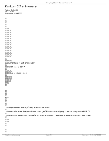 Gminny Zespół Szkół w Bielanach Wrocławskich Konkurs GIF animowany Autor: Stobnicki 24.03.2007. Zmieniony 16.04.2007. Konkurs > GIF animowany 24 marca 2007 >>> więcej <<< Cel: - Kultywowanie tradycji Świąt Wielkanocnych. - Doskonalenie umiejętności tworzenia grafiki animowanej przy pomocy programu GIMP. - Rozwijanie wyobraźni, zmysłów artystycznych oraz talentów w dziedzinie grafiki użytkowej. http://www.szkola.sisco.pl Kreator PDF Utworzono 2 March, 2017, 08:20 Gminny Zespół Szkół w Bielanach Wrocławskich Termin: - Ogłoszenie konkursu 21 marca 2007 - Termin oddawania prac do 18 kwietnia 2007 - Ocena prac po upływie 7 dni od terminu oddania prac. Regulamin: - Organizator: Gminny Zespół Szkół w Bielanach Wrocławskich - Osoba odpowiedzialna: Krzysztof Stobnicki - Udział w konkursie polega na samodzielnym wykonaniu prac w formie pliku *.gif - Wymiary: wysokość 150 pikseli X 150 pikseli. - Praca musi być wykonana w programie GIMP, o czym świadczyć powinien automatyczny zapis w strukturze pliku: "Created with The GIMP". - Animacja przed eksportem z programu Gimp powinna być zoptymalizowana! (Filtry>Animacja>Optimize for GIF). - Prace oceniane będą w dwóch kategoriach: - Szkoła Podstawowa IV - VI - Gimnazjum I - III - Składanie prac w formie elektronicznej CD-R, CD-RW u nauczycieli Informatyki (Lilianna Łabudek, Krzysztof Stobnicki PRZYDATNE INFORMACJE DOTYCZĄCE GIMP-a Darmowy program Gimp >>>pobierz<<< (uwaga!!! przed instalacją Gimpa należy zainstalować biblioteki tego programy, które też są zawarte w ściąganym pliku *.zip). Żeby Gimp był po Polsku http://www.szkola.sisco.pl Kreator PDF Utworzono 2 March, 2017, 08:20 Gminny Zespół Szkół w Bielanach Wrocławskich >>>zobacz<<<. Dla osób, które nie znają możliwości programu GIMP polecam stronę internetową, na której dowiecie się jak pracować na warstwach, jak wykonać gifa animowanego itp. Polecam strony: - http://www.ikb.poznan.pl/poss/oprogramowanie/gimp/gimpowanie.htm - http://www.gimp.signs.pl/gimpowanie.shtml Ciekawostki: Strona z linkami do tutoriali dla programu GIMP. POLECAM!!! http://www.maniooo.pl/tutoriale.php http://www.szkola.sisco.pl Kreator PDF Utworzono 2 March, 2017, 08:20