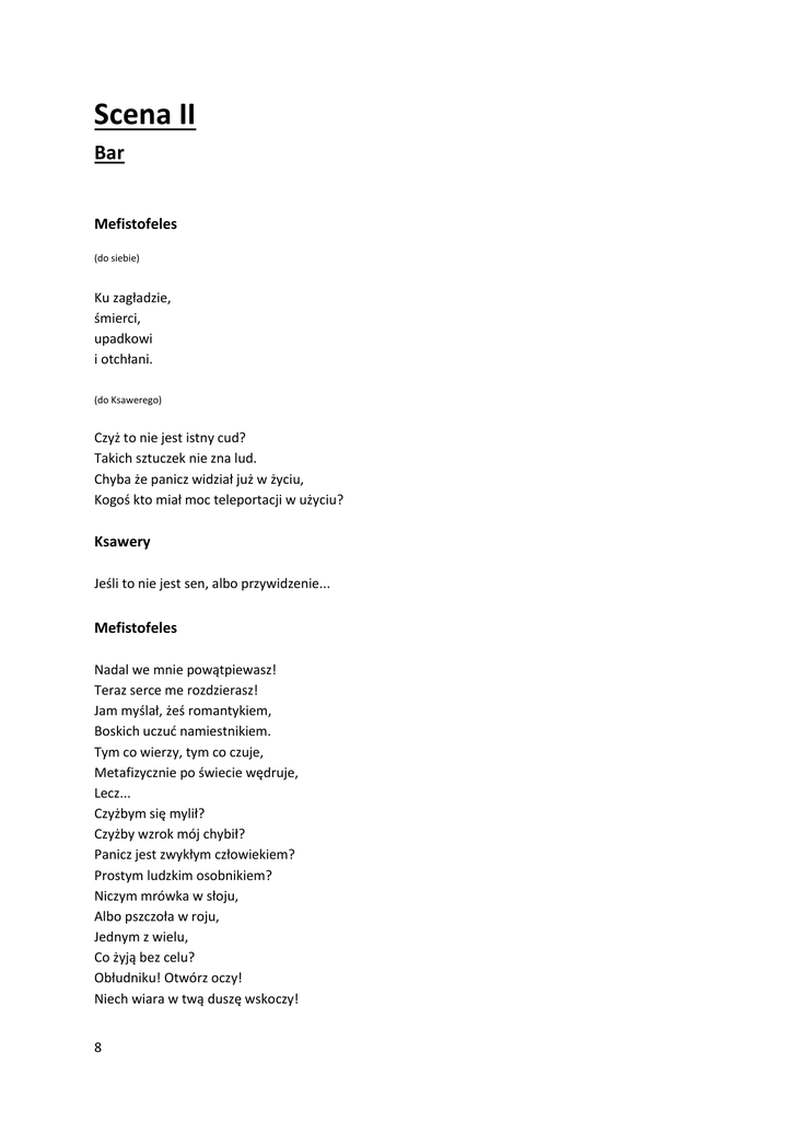 Scena II Bar Mefistofeles (do siebie) Ku zagładzie, śmierci, upadkowi i otchłani. (do Ksawerego) Czyż to nie jest istny cud? Takich sztuczek nie zna lud. Chyba że panicz widział już w życiu, Kogoś kto miał moc teleportacji w użyciu? Ksawery Jeśli to nie jest sen, albo przywidzenie... Mefistofeles Nadal we mnie powątpiewasz! Teraz serce me rozdzierasz! Jam myślał, żeś romantykiem, Boskich uczud namiestnikiem. Tym co wierzy, tym co czuje, Metafizycznie po świecie wędruje, Lecz... Czyżbym się mylił? Czyżby wzrok mój chybił? Panicz jest zwykłym człowiekiem? Prostym ludzkim osobnikiem? Niczym mrówka w słoju, Albo pszczoła w roju, Jednym z wielu, Co żyją bez celu? Obłudniku! Otwórz oczy! Niech wiara w twą duszę wskoczy! 8 Nie każ wystawiad mej mocy na próbę! Nie idź proszę na zgubę! Uwierz w anioła! Niech cię nie sięgnie diabelska smoła! Ksawery Wierzę, aniele, wierzę! Ha! I co teraz pseudo racjonaliści? Kto miał rację!? Kto! Metafizyczności! Wreszcie poznam ciebie! Wreszcie odkryję romantyzmu stronę. Lecz aniele, gdzie jesteśmy i co tu robimy? Mefistofeles Zebraliśmy się dziś tutaj... Zaiste, osobliwe miejsce, Świadczące o ludzi klęsce... Dawniej Gasthaus zwane, dziś tak niesłychanie... wydmuchane. Nijakośd niebywała ból okropny mi zadaje, Gorsze są współczesne zwyczaje. Z duszy karczma... obdarta... Nie ma w niej już tego harta! Kiedyś to i pobawid i porozmawiad, wolno było, w zacnej atmosferze! W basenie, gdzie pływają ludzie w eterze! I muzyka przednia była, nigdy mnie tu nie nużyła! A jak życia człowieczeostwo uczyła! Szkoda rozprawiad nad karczmy losem... Tyś jest jeszcze młokosem. Skargę odpowiednią złożę I na biurko Boga ją położę. A tymczasem! Poroszę ogórka z zakwasem! Hejże hola! Achtung! Achtung! Kufer piwa, wódki kielich, zrazu dajcie aniołkowi, Temu świętemu diabełkowi, Jam tu przybył się napoid! Kelner! Proszę mi tego ogórka przekroid! Ksawery 9 Wypada to tak aniołowi? Mefistofeles Anioł też pid przecie musi. Ksawery Ale żeby to alkohol? Mefistofeles (obruszony) Czyżby tylko wam wolno, trud się bez ustanku? A nam, osóbkom o głowach jak głazy mocnych – mój bratanku, Piwa się nie bojących I nigdy nie upijających, Już nie? Ksawery Pij jak chcesz, bardzo proszę, nie będę przecież robił ci z tego powodu wyrzutów. Ja jednakże, wodę bym poprosił, co najwyżej z sokiem. Miałeś ze mną porozmawiad, a więc, proszę bardzo, gadaj. Mefistofeles Czas najwyższy o tobie porozmawiad. Ksawery Dobre miejsce wybrałeś do pogawędek! Mefistofeles Dawniej Gasthaus wyglądał inaczej... Przyjemnie tu było raczej... Kiedyś karczma przepięknym miejscem była! Dziś ma stópka jest wstydliwa, że do takiego miejsca panicza dostarczyła. Brudy, smrody były zawsze... Lecz przynajmniej piwko dawali smaczne! Oj... I skutki tego były znaczne. 10 Ksawery Długo jesteś na swej służbie? Powiedz mi, ile masz lat? Bardzo pewnie stary jesteś? Mefistofeles Gdybym to ja wiedział... powiedziałbym przecie! Młodym, starym? Wy tego nie wiecie, I my tego nie wiemy, My boską ambrozję – lepszą od piwa – pijemy. Ziemskie czasy, aniołów z nieba nie imają, Wam, nagim małpom, głowę zawracają. Ile wieków owej planety przeoczyłem? Bodaj cały szereg! I chod wydaje się, że tylko na chwilę się zmyłem, Przegapiłem milion gierek! Pokolenia żale do mnie mają, Jak w mroźne zimy ptaszki chateczki witają, Szukając tam okruszków drobniutkich, Chociażby bardzo malutkich... Tak i oni szukali, Wszak nie odszukali, Bo jak ja – właściciel chatki - z urlopu korzystał, Ciało swe słonecznym balsamem pryskał... Zawiodłem ludzkie gromady, Ileż to z nich rozpoczęło zwady! Istotki cierpią katusze, Za swoje dusze. Bowiem aniołka w porę nie zastały, Ratunku nie doczekały, Lecz przysięgam, Przed tobą teraz klękam, Wyszedłem tylko na chwilę! Odszedłem od Ziemi zaledwie na milę, A teraz, wróciłem i nadrabiam zaległe czynienie. Zobaczysz! Jeszcze samego Boga wprawię w zdumienie! Ksawery Ominąłeś pewnie wiele? 11 Mefistofeles Tod kula na której gościmy, Codziennie się na niej budzimy, I tutaj rodzimy, Jak i umieramy, Komedią zwie się urokliwie – drugie to jej nazewnictwo, Pierwsze Ziemia, drugie Komedia. Chod dla niektórych może to głuptnictwo, To Ziemia to Najprzedniejsza Komedia! Ksawery Co robiłeś, gdzie Ty byłeś? Długie to były wakacje. Mefistofeles Błąkałem się po tamtym świecie. Jak stado jeleni w lecie. Lecz wróciłem, aby pomóc Bogu ludzkośd zbawid! I jego potęgę sławid! W rzeczy samej, laba ma przewlekłą była! Ależ mi się wydłużyła! Odpocząłem za wsze czasy! Teraz wyratuję ludzkie masy! Siły do działania, mam co niemiara! Eh! Ta Ziemia to jednak szczęściara! Ksawery I ja, zaszczyt mam z tobą rozmawiad? Mefistofeles Najwidoczniej mej pomocy potrzebujesz. Ksawery Skoro Ty owce zbłąkane na dobrą drogę wprowadzasz, to znaczy że i ja nią jestem? Zawsze miałem wrażenie, że nie jestem złym człowiekiem. To złudzenie? Jak często, draosko grzeszyłem? Sam ja grzechu w sobie nie widzę. Boże mój! Racz przebaczyd grzesznikowi, bo nie wiedział co czyni! Gdzie mój błąd w postępowaniu widzisz największy? Kiedy ze właściwej drogi, obranej specjalnie przez ciebie, do diabła zboczyłem? Kiedy feralnie zabłądziłem? A jednak! Interwencji anioła we własnej osobie potrzebuję? Aż tak źle ze mną? Aniele? 12 Mefistofeles Módl się do Boga o przebaczenie, I racz wysłuchad moich porad na wybawienie, A wnet na drogę światłości żwawo powrócisz, I szczęście na swą stronę obrócisz. Ksawery Zdejmij klapki z oczu moich i powiedz, w którym miejscu z bożego kursu odszedłem i niechybnie ku wiecznym potępieniu zmierzam? Mefistofeles To historia długa jest szalenie.... Ksawery Jeszcze jedno piwo, dla tego tu pana! (Mefistofeles dostaje piwo) Mefistofeles Powróciłem, Ledwo z chmurki wyskocz
