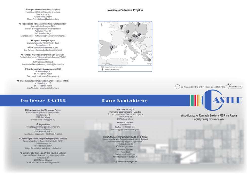 Lokalizacja Partnerów Projektu Instytut na rzecz Transportu i Logistyki Fondazione Istituto sui Trasporti e la Logistica Viale A. Moro, 38 40127 Bolonia, Włochy Alberto Preti – [email protected] Region Emilia-Romagna, Brukselskie biuro łącznikowe Regione Emilia-Romagna (RER), Servizio di collegamento con l’Unione Europea Avenue de l’Yser, 19 1040 Bruxelles, Belgia Lorenza Badiello – [email protected] 9 1 Agencja Rozwoju Karyntii Entwicklungsagentur Kärnten GmbH (EAK) Primoschgasse, 3 9020 Klagenfurt am Wörthersee, Austria Udo Tarmann – [email protected] Fundacja Wspólnota Walencka Region Europejski Fundación Comunidad Valenciana Región Europea (FCVRE) Plaza Manises, 1 46003 Valencia, Hiszpania Juan Manuel Revuelta Pérez – [email protected] Instytut Logistyki i Magazynowania (ILIM) ul. Estkowskiego, 6 61-755 Poznań, Polska Piotr Nowak – [email protected] 5,6 2 N 3 10 7 4 8 0 200 400 km kraj pochodzenia partnera projektu 1 lokalizacja partnera projektu r Urząd Marszałkowski Województwa Wielkopolskiego (WMO) al. Niepodległosci, 18 61-713 Poznań, Polska Anna Maciolek – [email protected] Pa r t n e rz y CAST L E Dane kontaktowe Stowarzyszenie Sieci Biznesowej Pannon PARTNER WIODĄCY Instytut na rzecz Transportu i Logistyki Fondazione Istituto sui Trasporti e la Logistica Viale A. Moro, 38 4027 Bolonia, Włochy Pannon Gazdasági Hálózat Egyesület (PBN) Gesztenyefa u., 4 9027 Györ, Węgry Pethő Regina – [email protected] Region Krety Γενικη Γραμματεια Περιφερεια Κρητης (ROC) Kountourioti Square 71202 Heraklion, Grecja Konstantinos Strataridakis – [email protected] Korporacja Rozwoju Gospodarczego Regionu Stuttgart Wirtschaftsförderung Region Stuttgart GmbH (WRS) Friedrichstrasse, 10 70174 Stuttgart, NIemcy Holger Bach – [email protected] Uniwersytet w Mariborze, Wydział Inżynierii Lądowej Univerza v Mariboru, Fakulteta za gradbeništvo (UniMB) Smetanova, 17 2000 Maribor, Słowenia Stane Božičnik – [email protected] Osoba do kontaktu: Marco Mobrici Telefon: +39 051 527 3246 [email protected] PRASA, MEDIA I ROZPOWSZECHNIANIE INFORMACJI Korporacja Rozwoju Gospodarczego Regionu Stuttgart Wirtschaftsförderung Region Stuttgart GmbH Friedrichstrasse, 10 70174 Stuttgart, Niemcy Osoba do kontaktu: Holger Bach Telefon: +49 711 2283 559 [email protected] http://www.castle-project.eu C ASTLE Współpraca w Ramach Sektora MŚP na Rzecz Logistycznej Doskonalosci C ASTLE D l a cze g o CAST L E ? Dlaczego uczymy polityki? Fo r m u ł a R e a l i z a c j i CASTLE to projekt finansowany w ramach Interreg IVC, stworzony by spełnić regionalne potrzeby usprawnienia elementów polityki publicznej dotyczących transportu i logistyki, ze szczególnym uwzględnieniem sektora MŚP. Inicjatywa CASTLE dotycząca “uczenia się polityki” łączy mniej i bardziej doświadczone regiony i pomaga usprawniać umiejętności formułowania zasad polityki w ramach czterech głównych tematów związanych z innowacyjnością: Krok 1: Identyfikacja i systematyzowanie najlepszych praktyk w ramach logistyki sektora MŚP (ze specjalnym naciskiem na tworzenie sieci MŚP i współpracę sektora MŚP nad zarządzaniem logistycznym) w każdym z 8 regionów CASTLE. Krok 2: Transfer modeli między Ośrodkami Kompetencji Logistycznych (OKL, ang. LoCC) podczas spotkań doradczych organizowanych dla regionów UE i wizyt studyjnych. Krok 3: Europejski transfer wiedzy na rzecz rozwoju polityki logistycznej w ramach sektora MŚP (w dziedzinach popytu na logistykę, podaży usług logistycznych, szkoleń dotyczących logistyki dla MŚP). Krok 4: Regionalny transfer wiedzy (szkolenia dla decydentów oraz dostosowywanie najlepszych praktyk do kontekstów regionalnych) oraz organizacja Forów Logistycznych jako instrumentów usprawniających proces formułowania zasad polityki. Krok 5: Wspólne badanie statusu polityki UE oraz praktyk sektora MŚP, także poza ramami partnerstwa. Krok 6: Stworzenie wspólnych zasad formułowania elementów polityki dotyczących logistyki sektora MŚP oraz rozwoju Ośrodków Kompetencji Logistycznych i ulepszania polityki regionalnej dotyczącej logistyki w sektorze MŚP. Cele CASTLE mają swoje korzenie w badaniach dotyczących statusu i perspektyw związanych z logistyką na poziomie regionalnym w krajach UE, których wyniki wykazały, że sieć logisty czna i innowacje sektora MŚP są głównymi obszarami wymagającymi interwencji sektora publicznego. Projekt ruszył w listopadzie 2008 r. i zostanie zakończony w październiku 2011 r. Bierze w nim udział dziesięciu partnerów z Włoch, Polski, Grecji, Słowenii, Hiszpanii, Niemiec, Węgier i Austrii. 1. 2. CASTLE umożliwia wymianę najlepszych praktyk i doświadczeń w ramach sieci operacyjnej na rzecz rozwoju elementów polityki publicznej, za które odpowiedzialni są partnerzy CASTLE - dotyczących logistyki w sektorze MŚP w celu: • promowania innowacyjności i konkurencyjności sektora MŚP; • zmniejszenia przepaści pomiędzy efektywnością transportu i logistyki a ochroną środowiska i oszczędnością energii w ramach polityki „win-win”, w myśl której każda ze stron odnosi korzyści (połączenie strategii lizbońskiej i goeteborskiej na poziomie regionalnym). CASTLE usprawnia proces formułowania zasad polityki poprzez przeprowadzanie badań, analiz, wymian najlepszych praktyk, tworzenie nowych narzędzi polityki regionalnej, które mogą być wykorzystane przez decydentów w procesach opracowywania elementów polityki oraz oceniania ich efektywności, a także za pomocą ćwiczeń dotyczących formułowania zasad polityki, w których biorą udział partnerzy w ramach Forum Transferowego UE. Działania te zostały uruchomione również na zasadzie metody wstępującej w ramach wzmacniania zarządzania logistyką, dzięki założeniu Regionalnych Forów Logistycznych oraz Ośrodków Kompetencji Logistycznych, które uświadamiają decydentom potrzeby log