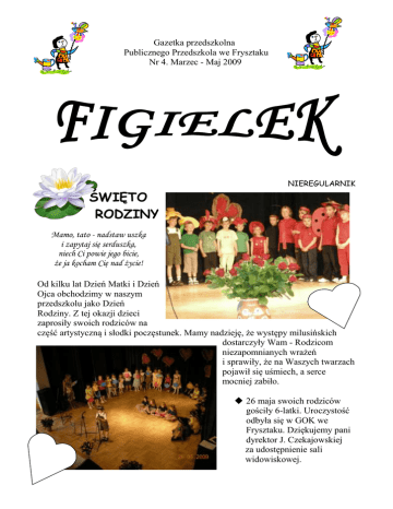 Gazetka przedszkolna Publicznego Przedszkola we Frysztaku Nr 4. Marzec - Maj 2009 ŚWIĘTO RODZINY NIEREGULARNIK Mamo, tato - nadstaw uszka i zapytaj się serduszka, niech Ci powie jego bicie, że ja kocham Cię nad życie! Od kilku lat Dzień Matki i Dzień Ojca obchodzimy w naszym przedszkolu jako Dzień Rodziny. Z tej okazji dzieci zaprosiły swoich rodziców na część artystyczną i słodki poczęstunek. Mamy nadzieję, że występy milusińskich dostarczyły Wam - Rodzicom niezapomnianych wrażeń i sprawiły, że na Waszych twarzach pojawił się uśmiech, a serce mocniej zabiło. 26 maja swoich rodziców gościły 6-latki. Uroczystość odbyła się w GOK we Frysztaku. Dziękujemy pani dyrektor J. Czekajowskiej za udostępnienie sali widowiskowej. 27 maja świętowali rodzice maluszków i 5-latków zaś 28 maja mamusie i tatusiowie 4-latków. DZIEŃ DZIECKA 29 maja obydwie grupy 6-latków pojechały do Teatru im. W. Siemaszkowej w Rzeszowie na pełen humoru spektakl pt. KOZIOŁEK MATOŁEK. A tak bawiły się maluszki i średniaki w FIKOLANDZIE w Krośnie 2 czerwca. Dziękujemy Rodzicom za pomoc w zorganizowaniu imprez dla dzieci z okazji ich święta. SPOTKANIE Z PSYCHOLOGIEM 9 marca w naszej placówce gościliśmy panią psycholog z Poradni PsychologicznoPedagogicznej w Strzyżowie. Pani Bogusława wygłosiła dla rodziców bardzo interesującą prelekcję nt.: „Wychowywać, to kochać i wymagać”. Spotkanie odbyło się w godzinach popołudniowych, jednak zainteresowanych było niewielu. Dziękujemy tym Rodzicom, którzy zaszczycili nas swoją obecnością. Przedszkolny humorek… Jasio pyta tatę: - Tato, jak funkcjonuje mózg? - Daj mi święty spokój, mam teraz w głowie cos innego… „Dzieci odkrywają Wielkanoc” W dniu 2 kwietnia dzieci z grupy II - „ZAJĄCZKI” i III - „BIEDRONECZKI” uczestniczyły w spotkaniu pod hasłem „Dzieci odkrywają Wielkanoc”- zorganizowanym przez pracowników Gminnej Biblioteki Publicznej we Frysztaku. Po powitaniu w oddziale dla dzieci (zapoznaniu z bajkami, układem książek) przedszkolaki zgromadziły się w sali audiowizualnej. Panie zaprezentowały pokaz slajdów przybliżający dzieciom zwyczaje i tradycje związane ze Świętami Wielkanocnymi. Przedszkolaki poznały znaczenie poszczególnych symboli świątecznych: chleb, sól, jajko, chrzan, wędliny, baranek, a także różne sposoby zdobienia pisanek. Atrakcyjnym zadaniem dla dzieci było wybranie i umieszczenie w koszyczku wielkanocnym składników „święconki”. Ponadto dzieci wesoło bawiły się i tańczyły do melodii piosenki „Woogieboogie”. Przedszkolaki wykonały również bardzo piękne „pisanki”-szablon jajka ozdobiony kredkami wg. inwencji własnej każdego dziecka. Kolorowe pisanki umieszczone zostały na świątecznym drzewku upamiętniającym nasze wspólne spotkanie. Czas spędzony w bibliotece dostarczył dzieciom wielu wrażeń i niezapomnianych przeżyć. Ponadto wprowadził je w radosny nastrój oczekiwania na przyjście Świąt Wielkiej Nocy oraz pozytywnie wpłynął na kształtującą się wrażliwość dzieci na piękno sztuki ludowej. 22 kwietnia, korzystając z pięknej pogody, maluszki po raz pierwszy odwiedziły Gminną Bibliotekę. Pani bibliotekarka mile nas przywitała i opowiedziała o tym, jak ciekawie można spędzić czas w bibliotece. Wypożyczyliśmy także kilka bajek do przeczytania w przedszkolu. UCZYMY PATRIOTYZMU OD NAJMŁODSZYCH LAT Piękny jest Biały Orzeł Piękna jest biel i czerwień Piękna nasza Ojczyzno Kochać będziemy Cię wiernie! Miesiąc maj jest „bogaty” w święta i rocznice państwowe. Najważniejsze z nich to: 2 V – DZIEŃ FLAGI PAŃSTWOWEJ 3 V – ROCZNICA UCHWALENIA KONSTYTUCJI 9 V – ŚWIĘTO UNII EUROPEJSKIEJ. W związku z tym 29 kwietnia nasze przedszkolaki miały okazję zapoznać się lub przypomnieć sobie te ważne wydarzenia związane z historią Polski. W trakcie pogadanki dowiedziały się o pochodzeniu nazwy naszej Ojczyzny, dlaczego godłem jest Biały Orzeł, co oznaczają kolory na fladze narodowej. Przy „mapie-puzzlach” miały okazję poznać tragiczny los Polski w XVIII w. i okoliczności uchwalenia 3 maja 1791r. pierwszej konstytucji w Europie a drugiej na świecie. Grupy starszaków przedstawiły okolicznościowy program artystyczny, z którym wystąpiły również podczas spotkania z panem wójtem J. Ziarnikiem. Po śniadaniu wszystkie dzieci, niosąc chorągiewki zrobione wcześniej na zajęciach, przemaszerowały pod pomnik J. Wybickiego – autora słów naszego hymnu. Tam, w postawie na baczność, odśpiewały Mazurka Dąbrowskiego. Grupa maluszków wróciła do przedszkola, natomiast pozostali udali się pod pomnik św. Floriana oraz do Urzędu Gminy na spotkanie z „gospodarzami” naszej gminy. Na zakończenie spotkania pan wójt poczęstował swoich małych gości sokiem i słodyczami. Przedpołudnie to dostarczyło dzieciom, wychowawcom, a nawet mieszkańcom Frysztaka niezapomnianych wrażeń. Wielu z nich przekonało się, iż PATRIOTYZMU UCZYMY SIĘ JUŻ W PRZEDSZKOLU. Przecież szacunek i cześć składana symbolom narodowym to także patriotyzm, przejawiający się w bardzo prostych gestach, takich jak stanie na baczność i śpiew hymnu podczas ważnych uroczystości, zachowanie powagi obchodów rocznic i świąt państwowych, czy wywieszanie flagi biało-czerwonej w czasie tych świąt. PAMIĘTAJMY ZATEM O PATRIOTYCZNYM WYCHOWANIU NASZYCH POCIECH OD NAJMŁODSZYCH LAT! LEKCJA PATRIOTYZMU W BIBLIOTECE 23 kwietnia w Gminnej Bibliotece Publicznej we Frysztaku odbyło się spotkanie z panią Haliną Korabiowską-Dobrowolską, łączniczką Powstania Warszawskiego. Delegacja dzieci przedszkolnych (Karolina Godek, Sylwia Płaziak, Daria Kowalska, Bartłomiej Gibadło) zaprezentowała krótki program artystyczny, na który złożyły się wiersze i piosenki o tematyce patriotycznej. Przedszkolaki wraz ze swoimi rodzicami uczestniczyły w przekazywaniu 