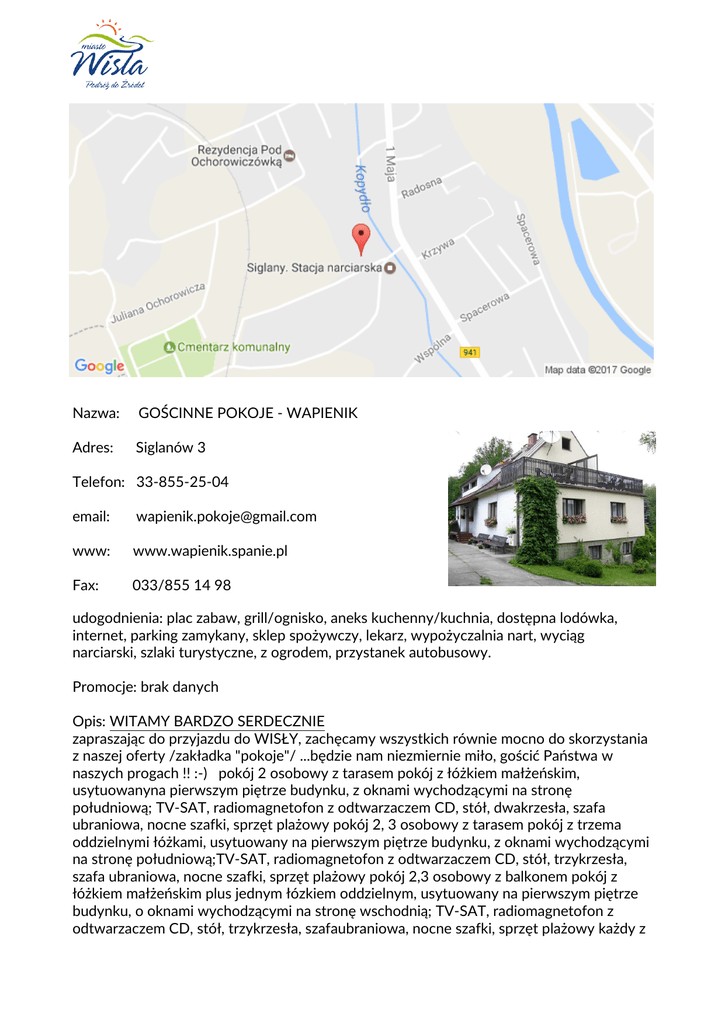 Nazwa: GOŚCINNE POKOJE - WAPIENIK Adres: Siglanów 3 Telefon: 33-855-25-04 email: [email protected] www: www.wapienik.spanie.pl Fax: 033/855 14 98 udogodnienia: plac zabaw, grill/ognisko, aneks kuchenny/kuchnia, dostępna lodówka, internet, parking zamykany, sklep spożywczy, lekarz, wypożyczalnia nart, wyciąg narciarski, szlaki turystyczne, z ogrodem, przystanek autobusowy. Promocje: brak danych Opis: WITAMY BARDZO SERDECZNIE zapraszając do przyjazdu do WISŁY, zachęcamy wszystkich równie mocno do skorzystania z naszej oferty /zakładka "pokoje"/ ...będzie nam niezmiernie miło, gościć Państwa w naszych progach !! :-) pokój 2 osobowy z tarasem pokój z łóżkiem małżeńskim, usytuowanyna pierwszym piętrze budynku, z oknami wychodzącymi na stronę południową; TV-SAT, radiomagnetofon z odtwarzaczem CD, stół, dwakrzesła, szafa ubraniowa, nocne szafki, sprzęt plażowy pokój 2, 3 osobowy z tarasem pokój z trzema oddzielnymi łóżkami, usytuowany na pierwszym piętrze budynku, z oknami wychodzącymi na stronę południową;TV-SAT, radiomagnetofon z odtwarzaczem CD, stół, trzykrzesła, szafa ubraniowa, nocne szafki, sprzęt plażowy pokój 2,3 osobowy z balkonem pokój z łóżkiem małżeńskim plus jednym łózkiem oddzielnym, usytuowany na pierwszym piętrze budynku, o oknami wychodzącymi na stronę wschodnią; TV-SAT, radiomagnetofon z odtwarzaczem CD, stół, trzykrzesła, szafaubraniowa, nocne szafki, sprzęt plażowy każdy z powyższych pokoi posiada oddzielną łazienkę, usytuowaną na korytarzu vis a vis poszczególnego pokoju pokój 2,3 osobowy bez balkonu pokój z trzema oddzielnymi łózkami i łazienką, usytuowany na pierwszym piętrze budynku z oknami wychodzącymi na strone północną; TV-SAT, radiomagnetofon z odtwarzaczem CD, stół, trzy krzesła, szafa ubraniowa, nocne szafki, sprzęt plażowy apartament 3 osobowy bez balkonu apartament 2 pokojowy z łożem małżeńskim i rozkładaną kanapą, usytuowany na drugim pietrze, w parti szczytowej budynku; oddzielnie WC i łazienka (wanna), chłodziarka, kącik jadalny, TV-SAT, radiomagnetofon z odtwarzaczem CD, stół, krzesła, szafa ubraniowa, nocne szafki, sprzęt plażowy.