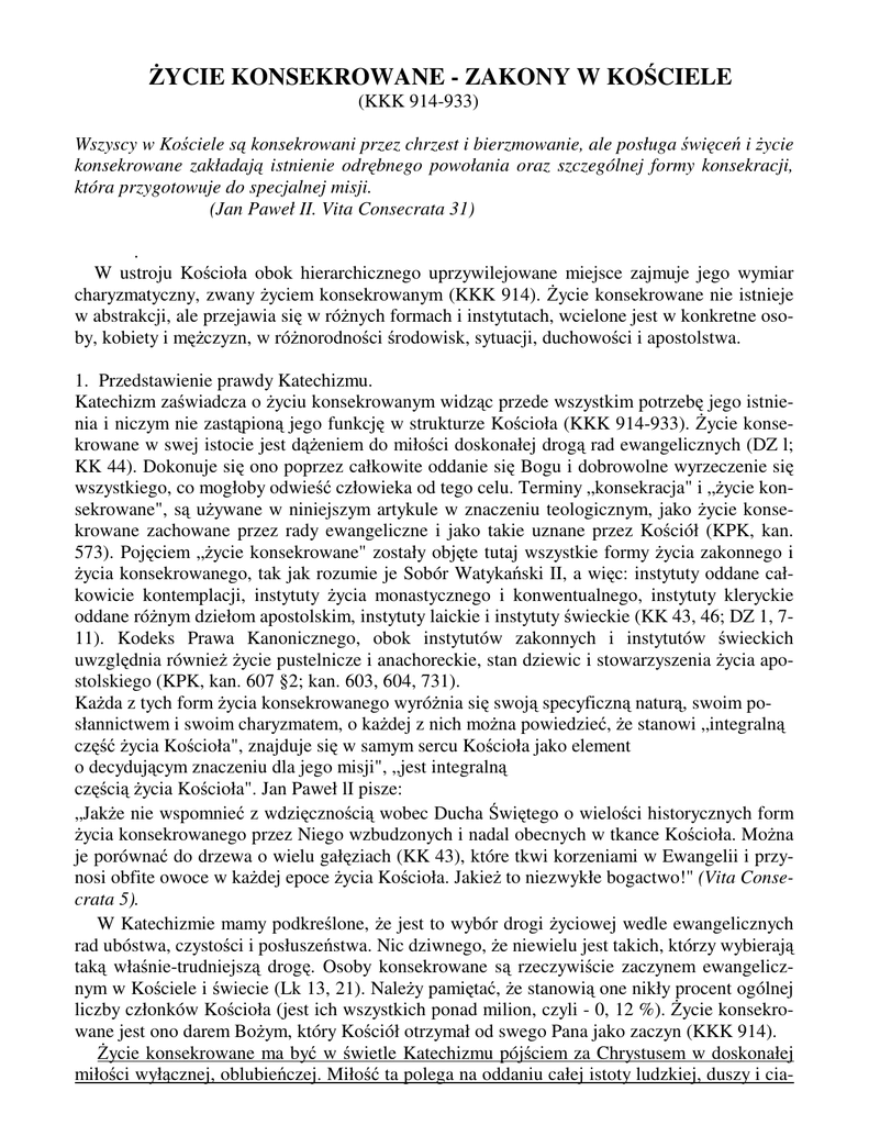 ŻYCIE KONSEKROWANE - ZAKONY W KOŚCIELE (KKK 914-933) Wszyscy w Kościele są konsekrowani przez chrzest i bierzmowanie, ale posługa święceń i życie konsekrowane zakładają istnienie odrębnego powołania oraz szczególnej formy konsekracji, która przygotowuje do specjalnej misji. (Jan Paweł II. Vita Consecrata 31) . W ustroju Kościoła obok hierarchicznego uprzywilejowane miejsce zajmuje jego wymiar charyzmatyczny, zwany życiem konsekrowanym (KKK 914). Życie konsekrowane nie istnieje w abstrakcji, ale przejawia się w różnych formach i instytutach, wcielone jest w konkretne osoby, kobiety i mężczyzn, w różnorodności środowisk, sytuacji, duchowości i apostolstwa. 1. Przedstawienie prawdy Katechizmu. Katechizm zaświadcza o życiu konsekrowanym widząc przede wszystkim potrzebę jego istnienia i niczym nie zastąpioną jego funkcję w strukturze Kościoła (KKK 914-933). Życie konsekrowane w swej istocie jest dążeniem do miłości doskonałej drogą rad ewangelicznych (DZ l; KK 44). Dokonuje się ono poprzez całkowite oddanie się Bogu i dobrowolne wyrzeczenie się wszystkiego, co mogłoby odwieść człowieka od tego celu. Terminy „konsekracja" i „życie konsekrowane", są używane w niniejszym artykule w znaczeniu teologicznym, jako życie konsekrowane zachowane przez rady ewangeliczne i jako takie uznane przez Kościół (KPK, kan. 573). Pojęciem „życie konsekrowane" zostały objęte tutaj wszystkie formy życia zakonnego i życia konsekrowanego, tak jak rozumie je Sobór Watykański II, a więc: instytuty oddane całkowicie kontemplacji, instytuty życia monastycznego i konwentualnego, instytuty kleryckie oddane różnym dziełom apostolskim, instytuty laickie i instytuty świeckie (KK 43, 46; DZ 1, 711). Kodeks Prawa Kanonicznego, obok instytutów zakonnych i instytutów świeckich uwzględnia również życie pustelnicze i anachoreckie, stan dziewic i stowarzyszenia życia apostolskiego (KPK, kan. 607 §2; kan. 603, 604, 731). Każda z tych form życia konsekrowanego wyróżnia się swoją specyficzną naturą, swoim posłannictwem i swoim charyzmatem, o każdej z nich można powiedzieć, że stanowi „integralną część życia Kościoła", znajduje się w samym sercu Kościoła jako element o decydującym znaczeniu dla jego misji", „jest integralną częścią życia Kościoła". Jan Paweł lI pisze: „Jakże nie wspomnieć z wdzięcznością wobec Ducha Świętego o wielości historycznych form życia konsekrowanego przez Niego wzbudzonych i nadal obecnych w tkance Kościoła. Można je porównać do drzewa o wielu gałęziach (KK 43), które tkwi korzeniami w Ewangelii i przynosi obfite owoce w każdej epoce życia Kościoła. Jakież to niezwykłe bogactwo!" (Vita Consecrata 5). W Katechizmie mamy podkreślone, że jest to wybór drogi życiowej wedle ewangelicznych rad ubóstwa, czystości i posłuszeństwa. Nic dziwnego, że niewielu jest takich, którzy wybierają taką właśnie-trudniejszą drogę. Osoby konsekrowane są rzeczywiście zaczynem ewangelicznym w Kościele i świecie (Lk 13, 21). Należy pamiętać, że stanowią one nikły procent ogólnej liczby członków Kościoła (jest ich wszystkich ponad milion, czyli - 0, 12 %). Życie konsekrowane jest ono darem Bożym, który Kościół otrzymał od swego Pana jako zaczyn (KKK 914). Życie konsekrowane ma być w świetle Katechizmu pójściem za Chrystusem w doskonałej miłości wyłącznej, oblubieńczej. Miłość ta polega na oddaniu całej istoty ludzkiej, duszy i cia- ła, Temu, który oddał się całkowicie ludziom, poprzez Wcielenie, Krzyż i unicestwienie, przez ubóstwo, czystość i posłuszeństwo (KKK 916). Jeżeli jednak to naśladowanie ma być aktem miłości - musi być aktem wolnym. Powołanie zakonne jest owocem tej wolności duchowej, obudzonej przez Chrystusa, wolności, z której wytryska gotowość całkowitego oddania się Bogu samemu. Powołanie zakonne polega na przyjęciu surowej dyscypliny, która nie przychodzi z przykazania, lecz z rad ewangelicznych. A to wszystko, przyjęte świadomie i zakorzenione w miłości Boskiego Oblubieńca, stanowi w istocie szczególne ukazanie głębi wolności ducha ludzkiego, wolności dzieci Bożych. Podkreślenie wolności wyboru jest bardzo ważne, gdyż tylko wtedy człowiek może zaakceptować wszystkie obowiązki życia zakonnego (KKK 916). Naśladowanie Chrystusa, które równocześnie różnicuje poszczególne rodziny zakonne, gdyż jedne obierają sobie za wzór Chrystusa ubogiego, inne miłosiernego czy nauczającego - wymaga przede wszystkim wiary (KKK 917). Naśladowanie Chrystusa w życiu zakonnym nie jest możliwe bez całkowitego oddania się Chrystusowi oraz osobowego związania się z Nim. Tę przyjaźń z Chrystusem realizuje się w zakonach na drodze praktykowania rad ewangelicznych. Praktyka rad ewangelicznych zespala ze sobą w jedną całość dwa zalecenia Chrystusa: Mk 8, 34 - „Jeśli kto chce pójść za Mną, niech zaprze się samego siebie" i Mt 19, 21 - „Jeśli chcesz być doskonałym, idź, sprzedaj co posiadasz i rozdaj ubogim, a będziesz miał skarb w niebie”: Zakony podejmują oficjalnie wobec Boga i Kościoła oraz praktykują na co dzień trzy podstawowe rady ewangeliczne czystość, posłuszeństwo, ubóstwo oraz życie wspólne. Cecha ta zwana konsekracją wyróżnia zakony spośród innych dróg dążenia do świętości, praktykowanych w Kościele i stanowi istotny element życia zakonnego (KKK 916). Składając te śluby - tym samym wybierają Chrystusa za Oblubieńca. Chrystus działa w osobach zakonnych-w takiej mierze, w jakiej one oddają się Jemu. Przyjaźń z Chrystusem realizuje się w wypełnianiu ślubów, a tym samym powinna stawać się dla osób konsekrowanych źródłem realnych cnót, które są sprawdzianem autentyzmu tej przyjaźni (KKK 926). Zakony są w Kościele znakiem wartości eschatologicznych - ukazują świętość całego Ciała Chrystusa i daj