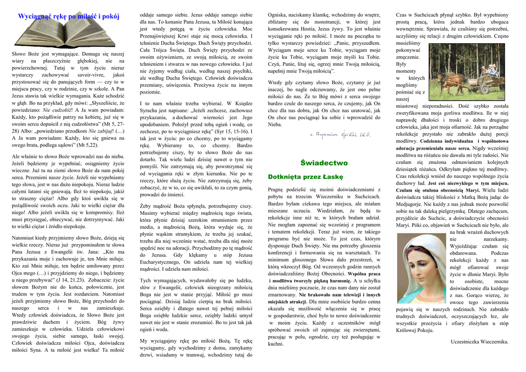 Wyciągnąć rękę po miłość i pokój Słowo Boże jest wymagające. Domaga się naszej wiary na płaszczyźnie głębokiej, nie na powierzchownej. Tutaj w tym życiu nieraz savoir-vivre, jakoś wystarczy zachowywać przystosować się do panujących form — czy to w miejscu pracy, czy w rodzinie, czy w szkole. A Pan Jezus stawia tak wielkie wymagania. Każe schodzić w głąb. Bo na przykład, gdy mówi: „Słyszeliście, że powiedziano: Nie cudzołóż! A Ja wam powiadam: Każdy, kto pożądliwie patrzy na kobietę, już się w swoim sercu dopuścił z nią cudzołóstwa” (Mt 5, 2728) Albo: „powiedziano przodkom Nie zabijaj! (…) A Ja wam powiadam: Każdy, kto się gniewa na swego brata, podlega sądowi” (Mt 5,22). Ale właśnie to słowo Boże wprowadzi nas do nieba. Jeżeli będziemy je wypełniać, osiągniemy życie wieczne. Już tu na ziemi słowo Boże da nam pokój serca. Przemieni nasze życie. Jeżeli nie wypełniamy tego słowa, jest w nas dużo niepokoju. Nieraz ludzie całymi latami się gniewają. Ileż to niepokoju, jakiż to straszny ciężar! Albo gdy ktoś uwikła się w pożądliwość swoich oczu. Jaki to wielki ciężar dla niego! Albo jeżeli uwikła się w kompromisy. Ileż musi przysięgać, obiecywać, nie dotrzymywać. Jaki to wielki ciężar i źródło niepokoju. Natomiast kiedy przyjmiemy słowo Boże, dzieją się wielkie rzeczy. Nieraz już przypominałem te słowa Pana Jezusa z Ewangelii św. Jana: „Kto ma przykazania moje i zachowuje je, ten Mnie miłuje. Kto zaś Mnie miłuje, ten będzie umiłowany przez Ojca mego (…) i przyjdziemy do niego, i będziemy u niego przebywać” (J 14, 21.23). Zobaczcie: życie słowem Bożym nie do końca, połowicznie, jest trudem w tym życiu. Jest rozdarciem. Natomiast jeżeli przyjmiemy słowo Boże, Bóg przychodzi do naszego serca i w nas zamieszkuje. Wtedy człowiek doświadcza, że Słowo Boże jest prawdziwie duchem i życiem. Bóg żywy zamieszkuje w człowieku. Udziela człowiekowi swojego życia, siebie samego, łaski swojej. Człowiek doświadcza miłości Ojca, doświadcza miłości Syna. A ta miłość jest wielka! Ta miłość oddaje samego siebie. Jezus oddaje samego siebie dla nas. To konanie Pana Jezusa, ta Miłość konająca jest wtedy potęgą w życiu człowieka. Moc Przenajświętszej Krwi staje się mocą człowieka. I tchnienie Ducha Świętego. Duch Święty przychodzi. Cała Trójca Święta. Duch Święty przychodzi ze swoim ożywieniem, ze swoją miłością, ze swoim tchnieniem i stwarza w nas nowego człowieka. I już nie żyjemy według ciała, według naszej psychiki, ale według Ducha Świętego. Człowiek doświadcza przemiany, uświęcenia. Przeżywa życie na innym poziomie. I to nam właśnie trzeba wybierać. W Księdze Syracha jest napisane: „Jeżeli zechcesz, zachowasz przykazania, a dochować wierności jest Jego upodobaniem. Położył przed tobą ogień i wodę, co zechcesz, po to wyciągniesz rękę” (Syr 15, 15-16). I tak jest w życiu: po co chcemy, po to wyciągamy rękę. Wybieramy to, co chcemy. Bardzo potrzebujemy ciszy, by to słowo Boże do nas dotarło. Tak wielu ludzi dzisiaj nawet o tym nie pomyśli. Nie zatrzymają się, aby powstrzymać się od wyciągania ręki w złym kierunku. Nie po te rzeczy, które służą życiu. Nie zatrzymają się, żeby zobaczyć, że w to, co się uwikłali, to za czym gonią, prowadzi do śmierci. Żeby mądrość Boża spłynęła, potrzebujemy ciszy. Musimy wybierać między mądrością tego świata, która płynie dzisiaj szerokim strumieniem przez media, a mądrością Bożą, która wydaje się, że płynie wąskim strumykiem, że trzeba jej szukać, trzeba dla niej wcześnie wstać, trzeba dla niej może spędzić noc na adoracji. Przychodźmy po tę mądrość do Jezusa. Gdy klękamy u stóp Jezusa Eucharystycznego, On udziela nam tej wielkiej mądrości. I udziela nam miłości. Tych wymagających, wydawałoby się po ludzku, słów z Ewangelii, człowiek nieogrzany miłością Boga nie jest w stanie przyjąć. Miłość go musi pociągnąć. Dzisiaj ludzie cierpią na brak miłości. Serca oziębły i dlatego nawet tej pełnej miłości Boga oziębłe ludzkie serce, oziębły ludzki umysł nawet nie jest w stanie zrozumieć. Bo to jest tak jak ogień i woda. My wyciągajmy rękę po miłość Bożą. Tę rękę wyciągamy, gdy wychodzimy z domu, zamykamy drzwi, wsiadamy w tramwaj, wchodzimy tutaj do Ogniska, naciskamy klamkę, wchodzimy do wnętrz, zbliżamy się do monstrancji, w której jest konsekrowana Hostia, Jezus żywy. To jest właśnie wyciąganie ręki po miłość. I może na początku to tylko wystarczy powiedzieć: „Panie, przyszedłem. Wyciągam moje serce ku Tobie, wyciągam moje życie ku Tobie, wyciągam moje myśli ku Tobie. Czyń, Panie, lituj się, ogrzej mnie Twoją miłością, napełnij mnie Twoją miłością”. Wtedy gdy czytamy słowo Boże, czytamy je już inaczej, bo nagle odczuwamy, że jest ono pełne miłości do nas. Że to Bóg mówi z serca swojego bardzo czule do naszego serca, że czujemy, jak On chce dla nas dobra, jak On chce nas uratować, jak On chce nas pociągnąć ku sobie i wprowadzić do Nieba. Świadectwo Dotknięta przez Łaskę Pragnę podzielić się moimi doświadczeniami z pobytu na trzecim Wieczerniku w Suchcicach. Bardzo byłam ciekawa tego miejsca, ale miałam mieszane uczucia. Wiedziałam, że będą to rekolekcje inne niż te, w których brałam udział. Nie mogłam zapoznać się wcześniej z programem i tematem rekolekcji. Teraz już wiem, że takiego programu być nie może. To jest czas, którym dysponuje Duch Święty. Nie ma potrzeby głoszenia konferencji i formowania się na warsztatach. To minimum głoszonego Słowa dało przestrzeń, w którą wkroczył Bóg. Od wczesnych godzin rannych doświadczaliśmy Bożej Obecności. Wspólna praca i modlitwa tworzyły piękną harmonię. A u schyłku dnia mieliśmy poczucie, że czas nam dany n