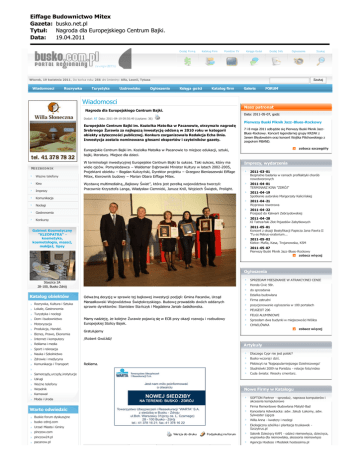 Eiffage Budownictwo Mitex Gazeta: busko.net.pl Tytu³: Nagroda dla Europejskiego Centrum Bajki. Data: 19.04.2011 Imprezy, Dodaj wpis wydarzenia Dodaj Firm ę Katalog Firm Ponidzie TV Księga Go ści Dodaj Info Ogłoszenia Szukaj Wtorek, 19 kwietnia 2011 , Do ko ńca roku 256 dni Imieniny: Alfa, Leonii, Tytusa Wiadomosci Rozrywka Turystyka Uzdrowisko Szukaj Ogłoszenia Księga gości Katalog firm Galeria FORUM Wiadomosci Nasz patronat Nagroda dla Europejskiego Centrum Bajki. Data: 2011-05-07, godz: Dodał: AT Data: 2011-04-19 09:56:49 (czytane: 36) Pierwszy Buski Piknik Jazz-Blues-Rockowy Europejskie Centrum Bajki im. Koziołka Matołka w Pacanowie, otrzymało nagrodę Srebrnego Żurawia za najlepszą inwestycję oddaną w 2010 roku w kategorii obiekty użyteczności publicznej. Konkurs zorganizowała Redakcja Echa Dnia. Inwestycja została nominowana głosami ekspertów i czytelników gazety. 7 i 8 maja 2011 odbędzie się Pierwszy Buski Piknik JazzBlues-Rockowy. Koncert legendarnej grupy KRZAK z Janem Błędowskim oraz koncert Wojtka Pilichowskiego z zespołem PiBAND. zobacz szczegóły Europejskie Centrum Bajki im. Koziołka Matołka w Pacanowie to miejsce edukacji, sztuki, bajki, literatury. Miejsce dla dzieci. NIEZBEDNIK Wazne telefony Kino Imprezy W terminologii inwestycyjnej Europejskie Centrum Bajki to sukces. Taki sukces, który ma wiele ojców. Pomysłodawca – Waldemar Dąbrowski Minister Kultury w latach 2002-2005, Projektant obiektu – Bogdan Kulczyński, Dyrektor projektu – Grzegorz Bieniaszewski Eiffage Mitex, Kierownik budowy – Marian Obara Eiffage Mitex. Imprezy, wydarzenia 2011-03-01 Bezpłatne badania w ramach profilaktyki chorób nowotworowych 2011-04-01 TERMINARZ KINA ''ZDRÓJ'' Wystaw ę multimedialną „Bajkowy Świat”, która jest perełką województwa tworzyli: Pracownie Krzysztofa Langa, Władysław Ciemnicki, Janusz Król, Wojciech Świątek, Prolight. 2011-04-19 Spotkanie autorskie Małgorzaty Kalicińskiej Komunikacja Noclegi 2011-04-21 Wyprawa rowerowa Gastronomia 2011-04-22 Przejazd do Kalwarii Zebrzydowskiej Konkursy 2011-04-28 XI Tatrzański Zlot Pojazdów Zabytkowych 2011-05-01 Koncert z okazji Beatyfikacji Papieża Jana Pawła II 'Tu es Petrus-oratorium... Gabinet Kosmetyczny "KLEOPATRA" kosmetyka, kosmetologia, masaż, makijaż, tipsy 2011-05-02 Kielce: Mafia, Kasa, Trojanowska, KSM 2011-05-07 Pierwszy Buski Piknik Jazz-Blues-Rockowy zobacz więcej Ogłoszenia SPRZEDAM MIESZKANIE W ATRAKCYJNEJ CENIE Staszica 2A 28-100, Busko Zdrój Honda Civic 98r. do sprzedania Katalog obiektów Rozrywka, Kultura i Sztuka Lokale, Gastronomia Odważną decyzję w sprawie tej bajkowej inwestycji podjęli: Gmina Pacanów, Urząd Marszałkowski Województwa Świętokrzyskiego. Budow ę prowadziło dwóch oddanych sprawie dyrektorów: Stanisław Stańczyk i Magdalena Janiak-Jaskółowska. Motoryzacja Produkcja, Handel. Biznes, Prawo, Ekonomia Internet i komputery Firma zatrudni pozycjonowanie ogłoszenia w 100 portalach PEUGEOT 206 Turystyka i noclegi Dom i budownictwo Działka budowlana FELGI ALUMINIOWE Mamy nadzieję, że kolejne Żurawie pojawią się w ECB przy okazji rozwoju i rozbudowy Europejskiej Stolicy Bajek. Sprzedam dwa budynki w miejscowości Wiślica CHWILÓWKA zobacz więcej Gratulujemy /Robert Gwó źdź/ Reklama i media Artykuły Sport i rekreacja Nauka i Szkolnictwo Dlaczego Cypr nie jest polski? Busko wczoraj i dziś. Zdrowie i medycyna Komunikacja i Transport Plebiscyt na 'Najpopularniejszego Dzielnicowego' Reklama. Studniówki 2009 na Ponidziu - relacje foto/video Cuda świata: Wesoły cmentarz. Samorządy,urzędy,instytucje Usługi Ważne telefony Nowe Firmy w Katalogu Weselnik Karnawał SOFTON Partner - sprzedaż, naprawa komputerów i akcesoria komputerowe Moda i Uroda Firma Remontowo-Budowlana Matyld-Bud Warto odwiedzic Kancelaria Adwokacka: adw. Jakub Łakomy, adw. Sylwester Ligęza Buskie forum dyskusyjne Willa Anna - kwatery i noclegi busko-zdroj.com Ekologiczna szkółka i plantacja truskawek Szczytrus.pl Urzad Miasta i Gminy pinczow.com Salonik Dziecięcy KAPI - odzież niemowlęca, dziecięca, wyprawka dla niemowlaka, akcesoria niemowlęce pinczow24.pl pacanow.pl Solec-Zdrój Agencja Hostess i Modelek hostessima.pl Wiadomości z regionu Aktualności Sport staszow24.pl jedrzejow.net.pl Miasto.Kielce.pl Nagroda dla Europejskiego Centrum Bajki. Kultura, rozrywka Polityka Firma Sprzątająca "AGA-CZYŚCIK" - usługi porządkowe, sprzątanie, pranie, czyszczenie tapicerek Centrum Zdrowia i Urody - fryzjer, kosmetyczka, masażysta SOFTON Partner - sprzedaż, naprawa komputerów i akcesoria komputerowe Moda i Uroda Firma Remontowo-Budowlana Matyld-Bud Warto odwiedzic Kancelaria Adwokacka: adw. Jakub Łakomy, adw. Sylwester Ligęza Eiffage Budownictwo Mitex Buskie forum dyskusyjne Gazeta: busko.net.pl busko-zdroj.com Urzad Miasta i Gminy Tytu³: Nagroda dla Europejskiego Centrum Bajki. pinczow.com Data: 19.04.2011 pinczow24.pl Willa Anna - kwatery i noclegi Ekologiczna szkółka i plantacja truskawek Szczytrus.pl Salonik Dziecięcy KAPI - odzież niemowlęca, dziecięca, wyprawka dla niemowlaka, akcesoria niemowlęce pacanow.pl Agencja Hostess i Modelek hostessima.pl Solec-Zdrój Wiadomości z regionu Aktualności Sport Kultura, rozrywka Firma Sprzątająca "AGA-CZYŚCIK" - usługi porządkowe, sprzątanie, pranie, czyszczenie tapicerek Polityka staszow24.pl jedrzejow.net.pl Centrum Zdrowia i Urody - fryzjer, kosmetyczka, masażysta Nagroda dla Europejskiego Centrum Bajki. Miasto.Kielce.pl Starachowice Przedświąteczne przestrogi. ostrowiec-sw.pl Finał konkursu Europa to My. www.kamienna.info HURTOWNIA OWOCÓW I WARZYW „AGRA II” Agencja Reklamowo-Artystyczna MONTOWNIA Motoserce Busko-Zdrój: 11 litrów bezcennej krwi i wspaniała zabawa (video/fotoreporta ż). www.swietokrzyskie.info Fotograd - Ceremonia ślubna w obiektywie Salon Fryzjerski "Angel Studio" Targi Edukacyjne – Busko 2011. SOFTON Partner sprzedaż, naprawa komputerów i