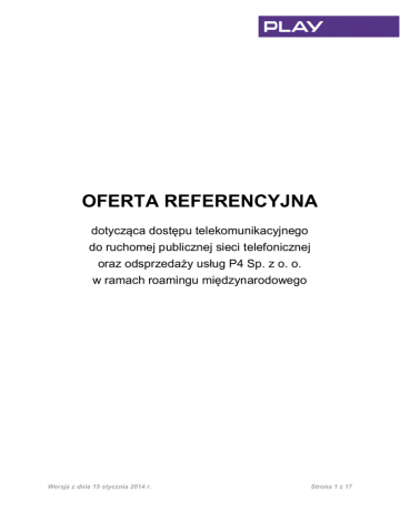 OFERTA REFERENCYJNA dotycząca dostępu telekomunikacyjnego do ruchomej publicznej sieci telefonicznej oraz odsprzedaży usług P4 Sp. z o. o. w ramach roamingu międzynarodowego Wersja z dnia 15 stycznia 2014 r. Strona 1 z 17 WSTĘP Niniejszy dokument („Oferta Referencyjna”) określa warunki niezbędne do rozpoczęcia hurtowej współpracy z P4 Sp. z o.o. („P4”) w zakresie połączenia z ruchomą publiczną siecią telefoniczną P4, w celu świadczenia usług w ramach międzynarodowego roamingu pasywnego (inbound roaming) oraz odsprzedaży usług P4 świadczonych poza Polską na potrzeby międzynarodowego roamingu aktywnego (outbound roaming). Warunki i zasady połączenia określone w niniejszej Ofercie Referencyjnej stanowią podstawę dla przyszłych dwustronnych uzgodnień pomiędzy Operatorem lub Alternatywnym Dostawcą Usług Roamingu Międzynarodowego („ADURM”) a P4, których wyniki zostaną ustalone odpowiednio w Umowie o Połączeniu Sieci na potrzeby międzynarodowego roamingu pasywnego lub w Umowie Odsprzedaży Usług Aktywnego Roaming Międzynarodowego na potrzeby międzynarodowego roamingu aktywnego. P4 przedstawi Operatorowi lub ADURM właściwy projekt umowy po otrzymaniu Wniosku (,,Wniosek”), złożonego w formie pisemnej i zgodnie z zasadami określonymi w niniejszej Ofercie Referencyjnej, w tym zgodnie z treścią Załącznika nr 1 do niniejszej Oferty Referencyjnej. Na prośbę Operatora lub ADURM składającego Wniosek, P4 przedstawi Operatorowi lub ADURM propozycję warunków i zasad hurtowej współpracy w zakresie usług nieobjętych niniejszą Ofertą Referencyjną. Niniejszą Ofertę Referencyjną sporządzono i opublikowano zgodnie z obowiązkiem nałożonym na P4 w ramach Rozporządzenia Parlamentu Europejskiego i Rady (UE) NR 531/2012 z dnia 13 czerwca 2012 r. w sprawie roamingu w publicznych sieciach łączności ruchomej wewnątrz Unii. W przypadku zmian zakresu bądź treści niniejszej Oferty Referencyjnej, zmiany takie zostaną niezwłocznie opublikowane na stronie internetowej P4: www.play.pl oraz będą uwzględnione w już rozpoczętych negocjacjach z Operatorami lub ADURM. P4 zastrzega prawo do odrzucenia Wniosków, które w rozumieniu Rozporządzenia mogą być uznane za nieuzasadnione. Pełne wyjaśnienie przyczyny odrzucenia Wniosku będzie przesłane Operatorowi lub ADURM w formie pisemnej w ciągu 14 dni od otrzymania poprawnie wypełnionego Wniosku. Wersja z dnia 15 stycznia 2014 r. Strona 2 z 17 SPIS TREŚCI 1. DEFINICJE .......................................................................................................... 4 2. ZASADY SKŁADANIA WNIOSKU ....................................................................... 5 3. PROCES NEGOCJACJI UMOWY ....................................................................... 6 4. OGÓLNE ZASADY WSPÓŁPRACY I KORZYSTANIA Z SIECI P4 ..................... 7 5. CHARAKTERYSTYKA SIECI P4 ......................................................................... 8 6. USŁUGI I AKTYWNOŚCI MIĘDZYOPERATORSKIE ŚWIADCZONE PRZEZ P4 W RAMACH UMOWY O POŁĄCZENIU SIECI NA POTRZEBY PASYWNEGO ROAMINGU MIĘDZYNARODOWEGO ...................................................................... 9 7. USŁUGI MIĘDZYOPERATORSKIE ŚWIADCZONE PRZEZ P4 W RAMACH UMOWY O ODSPRZEDAŻY USŁUG AKTYWNEGO ROAMINGU MIĘDZYNARODOWEGO ......................................................................................... 10 8. TESTY PRZED KOMERCYJNYM URUCHOMIENIEM USŁUG W RAMACH UMOWY O POŁĄCZENIU SIECI NA POTRZEBY PASYWNEGO ROAMINGU MIĘDZYNARODOWEGO ......................................................................................... 10 9. TESTY PRZED KOMERCYJNYM URUCHOMIENIEM USŁUG W RAMACH UMOWY O ODSPRZEDAŻY USŁUG AKTYWNEGO ROAMINGU MIĘDZYNARODOWEGO ......................................................................................... 11 10. POROZUMIENIE O POZIOMIE USŁUG ............................................................ 11 11. OPŁATY ............................................................................................................. 11 ZAŁĄCZNIK NR 1..................................................................................................... 14 ZAŁĄCZNIK NR 2..................................................................................................... 17 Wersja z dnia 15 stycznia 2014 r. Strona 3 z 17 1. DEFINICJE Dzień Roboczy - jakikolwiek dzień tygodnia od poniedziałku do piątku, z wyłączeniem dni ustawowo wolnych od pracy; Oferta Referencyjna - niniejszy dokument określający informacje w sprawie dostępu telekomunikacyjnego do Sieci P4, niezbędne zainteresowanego Operatora lub ADURM Wniosku; do przygotowania przez Alternatywny Dostawca Usług Roamingu Międzynarodowego (ADURM) przedsiębiorstwo, inne niż P4, które świadczy klientowi korzystającemu z roamingu, detaliczne usługi roamingu regulowanego; Operator - przedsiębiorca telekomunikacyjny dostarczający publiczne sieci telekomunikacyjne lub posiadający infrastrukturę niezbędną do technicznej realizacji połączenia sieci, wnioskujący o połączenie swojej sieci lub infrastruktury z Siecią P4 dla potrzeb pasywnego roamingu międzynarodowego, (tzw. MNO lub infrastrukturalny MVNO); Sieć P4 - ruchoma publiczna sieć telefoniczna dostarczana przez P4; UKE - Urząd Komunikacji Elektronicznej; Umowa o Połączeniu Sieci na potrzeby Pasywnego Roamingu Międzynarodowego - umowa o dostępie telekomunikacyjnym w zakresie połączenia sieci zawierana pomiędzy Operatorem i P4, regulująca zasady współpracy w zakresie świadczenia usług roamingu pasywnego, tj. dla klientów Operatora w Sieci P4 na terenie Polski; Umowa Odsprzedaży Usług Aktywnego Roamingu Międzynarodowego - umowa o dostępie telekomunikacyjnym w zakresie połączenia sieci zawierana pomiędzy ADURM i P4, regulująca zasady współpracy w zakresie świadczenia usług roamingu aktywnego, tj. dla klientów ADURM prz