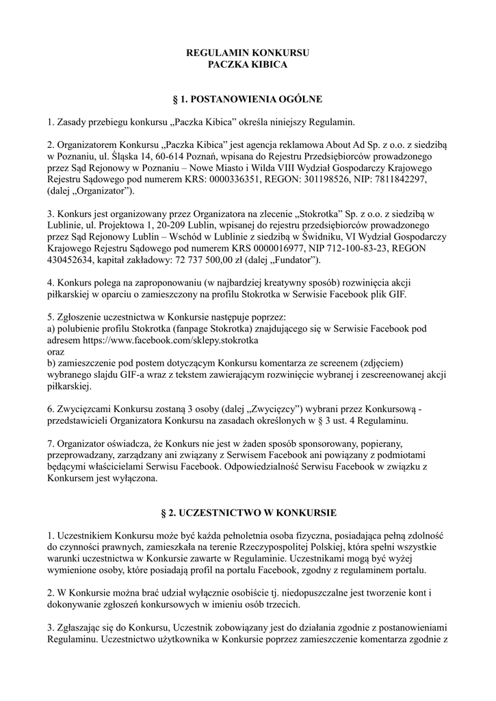 REGULAMIN KONKURSU PACZKA KIBICA § 1. POSTANOWIENIA OGÓLNE 1. Zasady przebiegu konkursu „Paczka Kibica” określa niniejszy Regulamin. 2. Organizatorem Konkursu „Paczka Kibica” jest agencja reklamowa About Ad Sp. z o.o. z siedzibą w Poznaniu, ul. Śląska 14, 60-614 Poznań, wpisana do Rejestru Przedsiębiorców prowadzonego przez Sąd Rejonowy w Poznaniu – Nowe Miasto i Wilda VIII Wydział Gospodarczy Krajowego Rejestru Sądowego pod numerem KRS: 0000336351, REGON: 301198526, NIP: 7811842297, (dalej „Organizator”). 3. Konkurs jest organizowany przez Organizatora na zlecenie „Stokrotka” Sp. z o.o. z siedzibą w Lublinie, ul. Projektowa 1, 20-209 Lublin, wpisanej do rejestru przedsiębiorców prowadzonego przez Sąd Rejonowy Lublin – Wschód w Lublinie z siedzibą w Świdniku, VI Wydział Gospodarczy Krajowego Rejestru Sądowego pod numerem KRS 0000016977, NIP 712-100-83-23, REGON 430452634, kapitał zakładowy: 72 737 500,00 zł (dalej „Fundator”). 4. Konkurs polega na zaproponowaniu (w najbardziej kreatywny sposób) rozwinięcia akcji piłkarskiej w oparciu o zamieszczony na profilu Stokrotka w Serwisie Facebook plik GIF. 5. Zgłoszenie uczestnictwa w Konkursie następuje poprzez: a) polubienie profilu Stokrotka (fanpage Stokrotka) znajdującego się w Serwisie Facebook pod adresem https://www.facebook.com/sklepy.stokrotka oraz b) zamieszczenie pod postem dotyczącym Konkursu komentarza ze screenem (zdjęciem) wybranego slajdu GIF-a wraz z tekstem zawierającym rozwinięcie wybranej i zescreenowanej akcji piłkarskiej. 6. Zwycięzcami Konkursu zostaną 3 osoby (dalej „Zwycięzcy”) wybrani przez Konkursową przedstawicieli Organizatora Konkursu na zasadach określonych w § 3 ust. 4 Regulaminu. 7. Organizator oświadcza, że Konkurs nie jest w żaden sposób sponsorowany, popierany, przeprowadzany, zarządzany ani związany z Serwisem Facebook ani powiązany z podmiotami będącymi właścicielami Serwisu Facebook. Odpowiedzialność Serwisu Facebook w związku z Konkursem jest wyłączona. § 2. UCZESTNICTWO W KONKURSIE 1. Uczestnikiem Konkursu może być każda pełnoletnia osoba fizyczna, posiadająca pełną zdolność do czynności prawnych, zamieszkała na terenie Rzeczypospolitej Polskiej, która spełni wszystkie warunki uczestnictwa w Konkursie zawarte w Regulaminie. Uczestnikami mogą być wyżej wymienione osoby, które posiadają profil na portalu Facebook, zgodny z regulaminem portalu. 2. W Konkursie można brać udział wyłącznie osobiście tj. niedopuszczalne jest tworzenie kont i dokonywanie zgłoszeń konkursowych w imieniu osób trzecich. 3. Zgłaszając się do Konkursu, Uczestnik zobowiązany jest do działania zgodnie z postanowieniami Regulaminu. Uczestnictwo użytkownika w Konkursie poprzez zamieszczenie komentarza zgodnie z § 1 ust. 5 oznacza, że zapoznał się on z treścią Regulaminu i akceptuje jego postanowienia. § 3. PRZEBIEG KONKURSU 1. Konkurs rozpoczyna się w dniu 25.06.2016 r. z chwilą publikacji posta konkursowego na profilu Stokrotka w Serwisie Facebook i kończy się w dniu 25.06.2016 r. o godz. 23:59. 2. W celu wzięcia udziału w Konkursie Uczestnik musi w wyznaczonym terminie zamieścić pod postem dotyczącym Konkursu komentarz ze screenem (zdjęciem) wybranego slajdu GIF-a wraz z tekstem zawierającym rozwinięcie wybranej i zescreenowanej akcji piłkarskiej. 3. Jeden Użytkownik może dodać wyłącznie jeden komentarz zawierający wybrany slajd GIF wraz teksem zawierającym rozwinięcie akcji piłkarskiej przebiegającej na GIFie. Każda kolejna odpowiedź będzie ukrywana przez moderatorów profilu Stokrotka na Facebooku. 4. Zwycięzcami Konkursu zostaną osoby 3 osoby wybrane przez Komisję Konkursową, które wypełnią zadanie konkursowe w sposób jak najbardziej kreatywny np. w formie pomysłowego opisu sytuacji, wierszyka itp. Kryteria oceny i wyboru najciekawszych prac pozostawia się do wyłącznego uznania Komisji. Podczas oceny uwzględniania będzie przede wszystkim kreatywność, oryginalność, pomysłowość przedstawionych treści. 5. Decyzja Komisji Konkursowej w przedmiocie rozstrzygnięcia Konkursu jest ostateczna i nie przysługuje od niej odwołanie. Z obrad i decyzji Komisji Konkursowej zostanie sporządzony protokół. 6. W przypadku braku kontaktu z którymkolwiek ze Zwycięzców, nagrodę otrzymają następni w kolejności, wskazani przez Komisję Konkursową, Uczestnicy. 7. Wyniki konkursu zostaną opublikowane w dniu 27.06.2016 r. na profilu Stokrotki na Facebooku (https://www.facebook.com/sklepy.stokrotka) w formie komentarza pod postem konkursowym. 8. Organizator zastrzega sobie prawo do wykluczenia z udziału w Konkursie Uczestników, których działania są sprzeczne z prawem, dobrymi obyczajami lub Regulaminem Konkursu, w szczególności Użytkowników: a) niedziałających osobiście, lecz przez osoby trzecie; b) wykorzystujących dodatkowe adresy poczty elektronicznej do występowania w imieniu/zgłaszania rzekomo różnych Uczestników; c) tworzących fikcyjne konta/ profile w serwisie Facebook; d) zamieszczających pod postem komentarze zawierające treści wulgarne, sprzeczne z prawem, dobrymi obyczajami lub naruszające prawa osób trzecich, jak również przedstawiające lub opisujące sytuacje lub zdarzenia, które mogą powodować zagrożenie dla zdrowia lub życia ludzi lub zwierząt. 9. Organizator zastrzega sobie prawo do usuwania treści (postów) zamieszczanych przez Uczestników w przypadku, gdy posty te zawierają treści sprzeczne z prawem, dobrymi obyczajami, wulgarne, naruszające dobra osobiste lub prawa osób trzecich. 10. Nadzór nad przebiegiem Konkursu sprawuje Komisja Konkursowa, w skład której wchodzą przedstawiciele Organizatora. Komisja Konkursowa: a) czuwa nad prawidłowym przebiegiem Konkursu; b) weryfikuje zgłoszenia do Konkursu pod kątem opisanych w Regulaminie kryteriów uczestnictwa; c) dokonuje oceny wszystkich prawidłowo dokonanych zgł