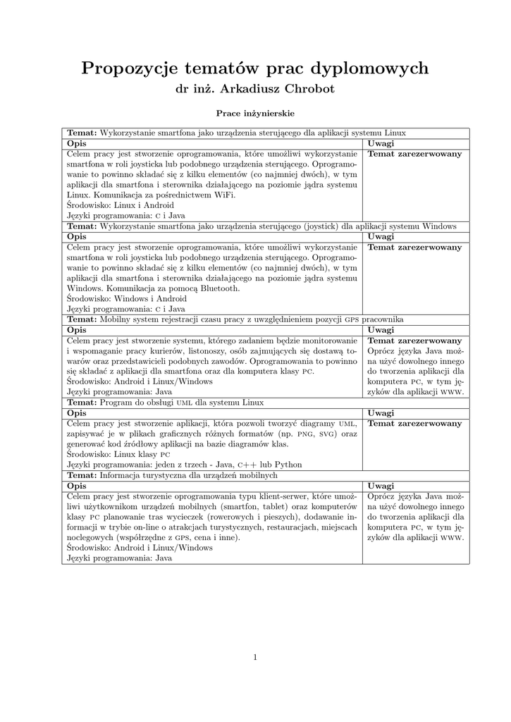 Propozycje tematów prac dyplomowych dr inż. Arkadiusz Chrobot Prace inżynierskie Temat: Wykorzystanie smartfona jako urządzenia sterującego dla aplikacji systemu Linux Opis Uwagi Celem pracy jest stworzenie oprogramowania, które umożliwi wykorzystanie Temat zarezerwowany smartfona w roli joysticka lub podobnego urządzenia sterującego. Oprogramowanie to powinno składać się z kilku elementów (co najmniej dwóch), w tym aplikacji dla smartfona i sterownika działającego na poziomie jądra systemu Linux. Komunikacja za pośrednictwem WiFi. Środowisko: Linux i Android Języki programowania: c i Java Temat: Wykorzystanie smartfona jako urządzenia sterującego (joystick) dla aplikacji systemu Windows Opis Uwagi Celem pracy jest stworzenie oprogramowania, które umożliwi wykorzystanie Temat zarezerwowany smartfona w roli joysticka lub podobnego urządzenia sterującego. Oprogramowanie to powinno składać się z kilku elementów (co najmniej dwóch), w tym aplikacji dla smartfona i sterownika działającego na poziomie jądra systemu Windows. Komunikacja za pomocą Bluetooth. Środowisko: Windows i Android Języki programowania: c i Java Temat: Mobilny system rejestracji czasu pracy z uwzględnieniem pozycji gps pracownika Opis Uwagi Celem pracy jest stworzenie systemu, którego zadaniem będzie monitorowanie Temat zarezerwowany i wspomaganie pracy kurierów, listonoszy, osób zajmujących się dostawą to- Oprócz języka Java możwarów oraz przedstawicieli podobnych zawodów. Oprogramowania to powinno na użyć dowolnego innego się składać z aplikacji dla smartfona oraz dla komputera klasy pc. do tworzenia aplikacji dla Środowisko: Android i Linux/Windows komputera pc, w tym jęJęzyki programowania: Java zyków dla aplikacji www. Temat: Program do obsługi uml dla systemu Linux Opis Uwagi Celem pracy jest stworzenie aplikacji, która pozwoli tworzyć diagramy uml, Temat zarezerwowany zapisywać je w plikach graficznych różnych formatów (np. png, svg) oraz generować kod źródłowy aplikacji na bazie diagramów klas. Środowisko: Linux klasy pc Języki programowania: jeden z trzech - Java, c++ lub Python Temat: Informacja turystyczna dla urządzeń mobilnych Opis Uwagi Celem pracy jest stworzenie oprogramowania typu klient-serwer, które umoż- Oprócz języka Java możliwi użytkownikom urządzeń mobilnych (smartfon, tablet) oraz komputerów na użyć dowolnego innego klasy pc planowanie tras wycieczek (rowerowych i pieszych), dodawanie in- do tworzenia aplikacji dla formacji w trybie on-line o atrakcjach turystycznych, restauracjach, miejscach komputera pc, w tym jęnoclegowych (współrzędne z gps, cena i inne). zyków dla aplikacji www. Środowisko: Android i Linux/Windows Języki programowania: Java 1 Prace inżynierskie c. d. Temat: Środowisko do testów jednostkowych dla języka Java Opis Celem pracy jest stworzenie oprogramowania, które będzie stanowiło warsztat dla testowania klas, oraz będzie wspomagało przygotowywanie danych wejściowych dla testów. Środowisko: Linux/Windows Języki programowania: Java Temat: Wykorzystanie urządzenia mobilnego do sterowania mobotem Opis Celem pracy jest stworzenie oprogramowania dla robota mobilnego oraz aplikacji dla smartfona lub tabletu, które pozwolą sterować mobotem na podstawie sygnału wideo przesyłanego z jego kamery oraz informacji z czujników kolizji. Środowisko: Android i Linux (system operacyjny robot) Języki programowania: Java i/lub c Uwagi W pracy trzeba wykorzystać mechanizm rtti Javy oraz można skorzystać z mechanizmu adnotacji. Uwagi Po stronie urządzenia mobilnego należy skorzystać z wbudowanych sensorów celem ustalania kierunku i prędkości z jaką ma się poruszać robot. Temat: Program do automatycznego tworzenia kodów rysunków dla systemu LATEX z użyciem pakietu TikZ/pgf Opis Uwagi Celem pracy jest stworzenie programu podobnego w działaniu do aplikacji Do tworzenia oprogramoLATEXDraw. wania należy wykorzystać Środowisko: Linux/Windows bibliotekę Qt. Języki: c++, język składu tekstu LATEX Prace magisterskie Temat: Oprogramowanie do zdalnego korzystania z urządzeń pamięci usb w systemie Linux Opis Uwagi Celem pracy jest stworzenie oprogramowania typu klient-serwer, które umożli- Część oprogramowania, wiłoby korzystanie osobom pracującym zdalnie na komputerze (np. za pomocą zarówno po stronie klienssh) korzystanie z plików zgromadzonych na urządzeniu pamięci usb (pendri- ta, jak i serwera powinna ve) podłączonym lokalnie do terminala. być zrealizowana w formie Środowisko: Linux sterowników dla jądra Języki programowania: c systemu operacyjnego. Temat: System plików wspomagający pracę systemu kontroli wersji kodu. Opis Uwagi Celem pracy jest stworzenie środowiska kontroli wersji kodu, którego głównym Sterownik systemu plików elementem byłby odpowiednio zaprojektowany system plików, wspomagający można wykonać z użyciem wykonywanie funkcji typowego narzędzia do zarządzania zmianami w kodzie. mechanizmu fuse. Środowisko: Linux Języki programowania: c Temat: Sterownik sieci InfiniBand dla systemu minix Opis Uwagi Celem pracy jest stworzenie dla systemu operacyjnego minix3 (www.minix3. org) sterownika dla sieci InfiniBand (www.infinibandta.org). Środowisko: minix3 Języki programowania: c Temat: Sieci manet dla urządzeń mobilnych Opis Uwagi Celem pracy jest stworzenie oprogramowania dla urządzeń mobilnych (smartfon lub tablet), które umożliwiałoby komunikację głosową przy użyciu sieci manet. Środowisko: Android Języki programowania: Java lub c/c++ 2
