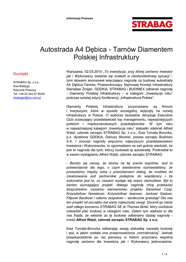 Informacja Prasowa Autostrada A4 Dębica - Tarnów Diamentem Polskiej Infrastruktury Kontakt STRABAG Sp. z o.o. Ewa Bałdyga Rzecznik Prasowy Tel. +48 22 244 57 05/09 [email protected] Warszawa, 02.03.2015 „To inwestycja, przy której zarówno Inwestor jak i Wykonawcy świetnie się znaleźli w niestandardowej sytuacji.”tymi słowami anonsował wręczający nagrodę za budowę autostrady A4 Dębica-Tarnów, Przewodniczący Sejmowej Komisji Infrastruktury Stanisław Żmijan. GDDKiA, STRABAG i BUDIMEX odbierali nagrodę - Diamenty Polskiej Infrastruktury - w kategorii „Inwestycja roku” podczas szóstej edycji Konferencji „Infrastruktura Polska”. Diamenty Polskiej Infrastruktury przyznawane są firmom i instytucjom, które w sposób szczególny wpłynęły na rozwój infrastruktury w Polsce. O wyborze laureatów decyduje Executive Club zrzeszający przedstawicieli top managementu, najważniejszych polskich i międzynarodowych przedsiębiorstw. W tym roku w najważniejszej kategorii „Inwestycja roku” statuetki odebrali Alfred Watzl, członek zarządu STRABAG Sp. z o.o., Ewa Tomala Borucka, p.o. dyrektora GDDKiA, Dariusz Blocher, prezes zarządu Budimex S.A. I chociaż nagrody wręczono najwyższym przedstawicielom Inwestora i Wykonawców, to zgromadzeni na sali goście wiedzieli, że jest to nagroda dla tych, którzy budowali tę autostradę. Podkreślał to w swoim wystąpieniu Alfred Watzl, członek zarządu STRABAG. - Bardzo się cieszę, że stoimy na tej scenie wspólnie. Jest to potwierdzenie dla tego, o czym wielokrotnie rozmawialiśmy, że prowadzimy między sobą z powodzeniem dialog, że możliwe do zrealizowania jest partnerskie podejście do współpracy i że wykonalne jest to, co czasem wydaje się wręcz niemożliwe. Był to bardzo wymagający projekt, dlatego nagrodę chcę przekazać bezpośrednio naszemu kierownictwu projektu Danielowi Czaji, Krzysztofowi Nowakowi, Krzysztofowi Iwanowi, Jackowi Gadowi, Filipowi Bacikowi i całemu zespołowi – serdecznie gratuluję! Dla nas ten projekt od początku był warty najwyższej uwagi. Docenił go także szef całego koncernu STRABAG SE dr Thomas Birtel, który osobiście odwiedził plac budowy w ubiegłym roku. Zatem tym większa to dla nas frajda, że właśnie za tę budowę odbieramy dzisiaj nagrodę mówił Alfred Watzl, członek zarządu STRABAG Sp. z o.o. Ewa Tomala-Borucka odbierając swoją statuetkę nazwała budowę i styl, w jakim została ona przeprowadzona „normalnością”. Jednak prawdopodobnie po raz pierwszy w historii przyznano wspólną nagrodę zarówno dla Inwestora jak i Wykonawcy jednocześnie. 1/4 Zatem jak podkreślał Marek Michałowski, Przewodniczący Rady Executive Club, mieliśmy do czynienia ze swego rodzaju precedensem. - Na rynku budowlanym panuje opinia, że nie ma takiej możliwości by zarówno Inwestor jak i Wykonawca mogli jednocześnie być szczęśliwi odbierając nagrodę w tej samej kategorii. Podczas obrad kapituły okazało się jednak, że są takie inwestycje, w których Inwestor był zadowolony, ponieważ miał w terminie i dobrze pod względem jakości zrobioną inwestycję, a i Wykonawca był zadowolony, bo zarobił na niej parę złotych – mówił podczas gali Marek Michałowski, Przewodniczący Rady Executive Club. Ten wyraz uznania był ważny także dlatego, że w dniu przyznania nagród w warszawskim Sheratonie, odbyła się Konferencja „Infrastruktura Polska”, w której wzięli czynny udział najważniejsi przedstawiciele zarówno rynku budowlanego, najważniejszych inwestorów działających w Polsce oraz administracji państwowej. Dyskutowali wspólnie na temat kondycji polskiej infrastruktury i tego za czyje pieniądze w Polsce budowane będą drogi, gdy skończą się fundusze unijne. Jak zauważył Alfred Watzl, Polska dzisiaj znajduje się w bardzo komfortowej sytuacji, gdyż żaden inny kraj w UE nie ma tak dużych środków na budowę infrastruktury. Dlatego obecnie firmy budowlane mogą zatrudniać ludzi czy angażować podwykonawców. Ale jak zauważył, nie wiemy zupełnie, co będzie po wielkim bumie. Dlatego w ocenie członka zarządu STRABAG już dzisiaj należy o tym myśleć, co powinno się wydarzyć po 2023 roku, skąd brać pieniądze na następne inwestycje i w żadnym wypadku nie czekać z tym do „za piętnaście dwunasta”. Potwierdzili ten punkt widzenia także Federico Tonetti, prezes Lafarge, ale też Jan Styliński, prezes Polskiego Związku Pracodawców Budownictwa. Ich zdaniem w Polsce brakuje perspektywicznego myślenia i brakuje wizji tego, co będziemy robili nawet za 6-7 lat. Wiele krajów już wiele lat temu rozwiązało problemy, jakie stoją wciąż przed nami w Polsce. Systemy prywatnego finansowania inwestycji, koncesje i inne zostały już dawno opracowane na świecie i warto się na tych doświadczeniach oprzeć. Tym bardziej, że jak podkreślał Styliński, światowy rynek budowlany nie należy do najciekawszych. Warto więc w Polsce wykorzystać to i poważnie podejść do nowych zasad finansowania i przyciągania kapitału. Potrzebujemy do tego projektów konkurencyjnych na skalę światową. Ewa Tomala-Borucka odnosząc się do postulatów przedstawicieli branży budowlanej podkreślała, że z perspektywy GDDKiA, głównym zadaniem dla tej instytucji na czas po bumie inwestycyjnym, w który wchodzimy, będzie utrzymanie tego, co w najbliższych latach zostało i zostanie zbudowane. Natomiast Rafał Nowak, reprezentujący departament dróg i autostrad Ministerstwa Infrastruktury i Rozwoju Regionalnego, deklarował, że administracja planuje przyznawać GDDKiA na ten cel coroczną kwotę 5 mld oraz wprowadzić każdego roku waloryzację tej kwoty. To jego zdaniem pozwoli ze spokojem 2/4 myśleć o kolejnych dekadach po erze finansowania unijnego w Polsce. W sumie podczas konferencji „Infrastruktura Polska” odbyły się cztery panele, podczas których dyskutowano także o zmianach w zamówieniach public