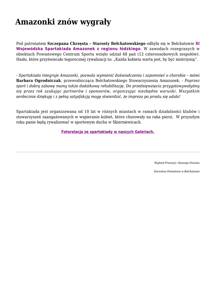 Amazonki znów wygrały Pod patronatem Szczepana Chrzęsta – Starosty Bełchatowskiego odbyła się w Bełchatowie XI Wojewódzka Spartakiada Amazonek z regionu łódzkiego. W zawodach rozegranych w obiektach Powiatowego Centrum Sportu wzięło udział 48 pań (12 czteroosobowych zespołów). Hasło, które przyświecało tegorocznej rywalizacji to: „Każda kobieta warta jest, by być mistrzynią”. - Spartakiada integruje Amazonki, pozwala wymienić doświadczenia i zapomnieć o chorobie – mówi Barbara Ogrodniczak, przewodnicząca Bełchatowskiego Stowarzyszenia Amazonek. - Poprzez sport i dobrą zabawę mamy także dodatkową rehabilitację. Do przedsięwzięcia przygotowywałyśmy się przez rok szukając partnerów i sponsorów, organizując niezbędne warunki. Wszystkim serdecznie dziękuję i z pełną satysfakcją mogę stwierdzić, że impreza po prostu się udała! Spartakiada jest organizowana od 10 lat w różnych miastach w ramach działalności klubów i stowarzyszeń zaangażowanych w wspieranie kobiet, które chorowały na raka piersi. W przyszłym roku panie będą rywalizować w sportowym duchu w Skierniewicach. Fotorelacja ze spartakiady w naszych Galeriach. Wydział Promocji i Rozwoju Powiatu Starostwo Powiatowe w Bełchatowie