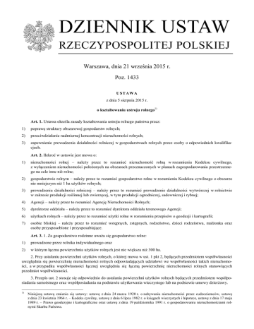 DZIENNIK USTAW RZECZYPOSPOLITEJ POLSKIEJ Warszawa, dnia 21 września 2015 r. Poz. 1433 US T AW A z dnia 5 sierpnia 2015 r. o kształtowaniu ustroju rolnego1) Art. 1. Ustawa określa zasady kształtowania ustroju rolnego państwa przez: 1) poprawę struktury obszarowej gospodarstw rolnych; 2) przeciwdziałanie nadmiernej koncentracji nieruchomości rolnych; 3) zapewnienie prowadzenia działalności rolniczej w gospodarstwach rolnych przez osoby o odpowiednich kwalifikacjach. Art. 2. Ilekroć w ustawie jest mowa o: 1) nieruchomości rolnej – należy przez to rozumieć nieruchomość rolną w rozumieniu Kodeksu cywilnego, z wyłączeniem nieruchomości położonych na obszarach przeznaczonych w planach zagospodarowania przestrzennego na cele inne niż rolne; 2) gospodarstwie rolnym – należy przez to rozumieć gospodarstwo rolne w rozumieniu Kodeksu cywilnego o obszarze nie mniejszym niż 1 ha użytków rolnych; 3) prowadzeniu działalności rolniczej – należy przez to rozumieć prowadzenie działalności wytwórczej w rolnictwie w zakresie produkcji roślinnej lub zwierzęcej, w tym produkcji ogrodniczej, sadowniczej i rybnej; 4) Agencji – należy przez to rozumieć Agencję Nieruchomości Rolnych; 5) dyrektorze oddziału – należy przez to rozumieć dyrektora oddziału terenowego Agencji; 6) użytkach rolnych – należy przez to rozumieć użytki rolne w rozumieniu przepisów o geodezji i kartografii; 7) osobie bliskiej – należy przez to rozumieć wstępnych, zstępnych, rodzeństwo, dzieci rodzeństwa, małżonka oraz osoby przysposobione i przysposabiające. Art. 3. 1. Za gospodarstwo rodzinne uważa się gospodarstwo rolne: 1) prowadzone przez rolnika indywidualnego oraz 2) w którym łączna powierzchnia użytków rolnych jest nie większa niż 300 ha. 2. Przy ustalaniu powierzchni użytków rolnych, o której mowa w ust. 1 pkt 2, będących przedmiotem współwłasności uwzględnia się powierzchnię nieruchomości rolnych odpowiadających udziałowi we współwłasności takich nieruchomości, a w przypadku współwłasności łącznej uwzględnia się łączną powierzchnię nieruchomości rolnych stanowiących przedmiot współwłasności. 3. Przepis ust. 2 stosuje się odpowiednio do ustalania powierzchni użytków rolnych będących przedmiotem współposiadania samoistnego oraz współposiadania na podstawie użytkowania wieczystego lub na podstawie umowy dzierżawy. 1) Niniejszą ustawą zmienia się ustawy: ustawę z dnia 24 marca 1920 r. o nabywaniu nieruchomości przez cudzoziemców, ustawę z dnia 23 kwietnia 1964 r. – Kodeks cywilny, ustawę z dnia 6 lipca 1982 r. o księgach wieczystych i hipotece, ustawę z dnia 17 maja 1989 r. – Prawo geodezyjne i kartograficzne oraz ustawę z dnia 19 października 1991 r. o gospodarowaniu nieruchomościami rolnymi Skarbu Państwa. Dziennik Ustaw –2– Poz. 1433 Art. 4. 1. Za rolnika indywidualnego, o którym mowa w art. 3 ust. 1 pkt 1, uważa się osobę fizyczną będącą właścicielem, użytkownikiem wieczystym, samoistnym posiadaczem lub dzierżawcą nieruchomości rolnych, których łączna powierzchnia użytków rolnych nie przekracza 300 ha, posiadającą kwalifikacje rolnicze oraz co najmniej od 5 lat zamieszkałą w gminie, na obszarze której jest położona jedna z nieruchomości rolnych wchodzących w skład gospodarstwa rolnego, i prowadzącą przez ten okres osobiście to gospodarstwo. 2. Uważa się, że osoba fizyczna: 1) osobiście prowadzi gospodarstwo rolne, jeżeli: a) pracuje w tym gospodarstwie, b) podejmuje wszelkie decyzje dotyczące prowadzenia działalności rolniczej w tym gospodarstwie; 2) posiada kwalifikacje rolnicze, jeżeli uzyskała: a) wykształcenie rolnicze zasadnicze zawodowe, średnie lub wyższe lub b) tytuł kwalifikacyjny lub tytuł zawodowy, lub tytuł zawodowy mistrza w zawodzie przydatnym do prowadzenia działalności rolniczej i posiada co najmniej 3-letni staż pracy w rolnictwie, lub c) wykształcenie wyższe inne niż rolnicze i posiada co najmniej 3-letni staż pracy w rolnictwie albo wykształcenie wyższe inne niż rolnicze i ukończone studia podyplomowe w zakresie związanym z rolnictwem, albo wykształcenie średnie inne niż rolnicze i posiada co najmniej 3-letni staż pracy w rolnictwie, lub d) wykształcenie podstawowe, gimnazjalne lub zasadnicze zawodowe inne niż rolnicze i posiada co najmniej 5-letni staż pracy w rolnictwie. 3. Za staż pracy, o którym mowa w ust. 2, uznaje się okres, w którym osoba fizyczna: 1) podlegała ubezpieczeniu społecznemu rolników lub 2) prowadziła działalność rolniczą w gospodarstwie rolnym o obszarze nie mniejszym niż 1 ha stanowiącym jej własność, przedmiot użytkowania wieczystego, przedmiot samoistnego posiadania lub dzierżawy, lub 3) była zatrudniona w gospodarstwie rolnym na podstawie umowy o pracę lub spółdzielczej umowy o pracę, wykonując pracę związaną z prowadzeniem działalności rolniczej, lub 4) wykonywała pracę związaną z prowadzeniem działalności rolniczej w charakterze członka spółdzielni produkcji rolnej, lub 5) odbyła staż, o którym mowa w art. 53 ust. 1 ustawy z dnia 20 kwietnia 2004 r. o promocji zatrudnienia i instytucjach rynku pracy (Dz. U. z 2015 r. poz. 149, z późn. zm.2)), obejmujący wykonywanie czynności związanych z prowadzeniem działalności rolniczej. 4. Przy ustalaniu powierzchni użytków rolnych, o których mowa w ust. 1, stosuje się odpowiednio przepisy art. 3 ust. 2 i 3. Art. 5. 1. Dowodem potwierdzającym osobiste prowadzenie gospodarstwa rolnego jest pisemne oświadczenie prowadzącego to gospodarstwo. 2. Dowodem potwierdzającym zamieszkanie jest zaświadczenie o zamieszkaniu wydane przez organ właściwy w sprawach ewidencji ludności. 3. Dowodem potwierdzającym powierzchnię posiadanych użytków rolnych są pisemne oświadczenia nabywcy i zbywcy nieruchomości rolnej zawierające informacje dotyczące numeru działki ewidencyjnej, jej poło