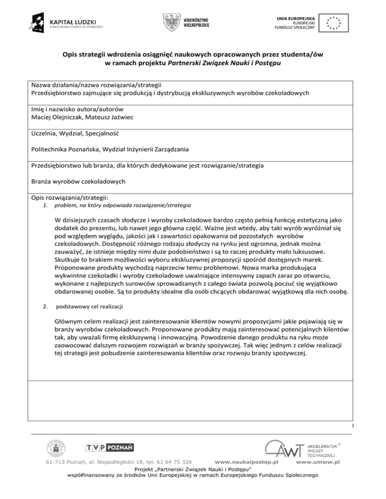 Opis strategii wdrożenia osiągnięć naukowych opracowanych przez studenta/ów w ramach projektu Partnerski Związek Nauki i Postępu Nazwa działania/nazwa rozwiązania/strategii Przedsiębiorstwo zajmujące się produkcją i dystrybucją ekskluzywnych wyrobów czekoladowych Imię i nazwisko autora/autorów Maciej Olejniczak, Mateusz Jaźwiec Uczelnia, Wydział, Specjalnośd Politechnika Poznaoska, Wydział Inżynierii Zarządzania Przedsiębiorstwo lub branża, dla których dedykowane jest rozwiązanie/strategia Branża wyrobów czekoladowych Opis rozwiązania/strategii: 1. problem, na który odpowiada rozwiązanie/strategia W dzisiejszych czasach słodycze i wyroby czekoladowe bardzo często pełnią funkcję estetyczną jako dodatek do prezentu, lub nawet jego główna częśd. Ważne jest wtedy, aby taki wyrób wyróżniał się pod względem wyglądu, jakości jak i zawartości opakowania od pozostałych wyrobów czekoladowych. Dostępnośd różnego rodzaju słodyczy na rynku jest ogromna, jednak można zauważyd, że istnieje między nimi duże podobieostwo i są to raczej produkty mało luksusowe. Skutkuje to brakiem możliwości wyboru ekskluzywnej propozycji spośród dostępnych marek. Proponowane produkty wychodzą naprzeciw temu problemowi. Nowa marka produkująca wykwintne czekoladki i wyroby czekoladowe uwalniające intensywny zapach zaraz po otwarciu, wykonane z najlepszych surowców sprowadzanych z całego świata pozwolą poczud się wyjątkowo obdarowanej osobie. Są to produkty idealne dla osób chcących obdarowad wyjątkową dla nich osobę. 2. podstawowy cel realizacji Głównym celem realizacji jest zainteresowanie klientów nowymi propozycjami jakie pojawiają się w branży wyrobów czekoladowych. Proponowane produkty mają zainteresowad potencjalnych kilentów tak, aby uważali firmę ekskluzywną i innowacyjną. Powodzenie danego produktu na ryku może zaowocowad dalszym rozwojem rozwiązao w branży spożywczej. Tak więc jednym z celów realizacji tej strategii jest pobudzenie zainteresowania klientów oraz rozwoju branży spożywczej. 1 61-713 Poznań, al. Niepodległości 18, tel. 61 64 75 326 www.naukaipostep.pl www.umww.pl Projekt „Partnerski Związek Nauki i Postępu” współfinansowany ze środków Unii Europejskiej w ramach Europejskiego Funduszu Społecznego Elementy innowacyjne rozwiązania/strategii (jeśli istnieją) Proponowane produkty są umiarkowanie innowacyjne, gdyż wyroby czekoladowe są wśród nas od dawna i pozostaną na rynku jeszcze długo. Jednak M&M Chocolate proponuje wyroby czekoladowe doskonałej jakości i dzięki najnowszej technologii i najlepszej jakości produktów jest w stanie podbid rynek. Sekretem są nowoczesne opakowania, które przedłużają cykl życia produktu, oraz w pełni uwalniają aromat najlepszych składników z najdalszych zakątków świata. Spodziewane korzyści dla przedsiębiorstwa wdrażającego rozwiązanie/strategię - uzyskanie przyjaznego wizerunku firmy jako producenta ekskluzywnych wyrobów - rozpowszechnienie marki - uzyskanie rzeszy klientów, którzy docenią nasz produkt Wyrażam zgodę na przetwarzanie danych osobowych zgodnie z ustawą z dnia 29 sierpnia 1997 r. o ochronie danych osobowych z późn. Zmianami. Mateusz Jaźwiec Maciej Olejniczak 2 61-713 Poznań, al. Niepodległości 18, tel. 61 64 75 326 www.naukaipostep.pl www.umww.pl Projekt „Partnerski Związek Nauki i Postępu” współfinansowany ze środków Unii Europejskiej w ramach Europejskiego Funduszu Społecznego