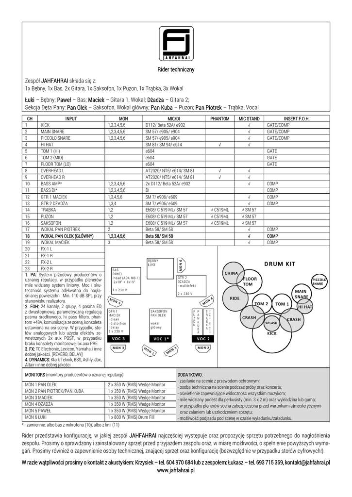 Rider techniczny Zespół JAHFAHRAI składa się z: 1x Bębny, 1x Bas, 2x Gitara, 1x Saksofon, 1x Puzon, 1x Trąbka, 3x Wokal Łuki – Bębny; Paweł – Bas; Maciek – Gitara 1, Wokal; Dżadża – Gitara 2; Sekcja Dęta Pany: Pan Olek – Saksofon, Wokal główny; Pan Kuba – Puzon; Pan Piotrek – Trąbka, Vocal CH INPUT 1 KICK 2 MAIN SNARE 3 PICCOLO SNARE 4 HI HAT 5 TOM 1 (HI) 6 TOM 2 (MID) 7 FLOOR TOM (LO) 8 OVERHEAD L 9 OVERHEAD R 10 BASS AMP* 11 BASS DI* 12 GTR 1 MACIEK 13 GTR 2 DŻADŻA 14 TRĄBKA 15 PUZON 16 SAKSOFON 17 WOKAL PAN PIOTREK 18 WOKAL PAN OLEK (GŁÓWNY) 19 WOKAL MACIEK 20 FX-1 L 21 FX-1 R 22 FX-2 L 23 FX-2 R 1. PA: System przodowy producentów o uznanej reputacji, w przypadku plenerów mile widziany system liniowy. Moc i skuteczność systemu adekwatna do nagłaśnianej powierzchni. Min. 110 dB SPL przy stanowisku realizatora. 2. FOH: 24 kanały, 2 grupy, 4 pasma EQ z dwustopniową, parametryczną regulacją pasma środkowego, hi pass filters, phantom +48V, komunikacja ze sceną, konsoleta ustawiona na osi sceny. W przypadku stołów analogowych lub użycia efektów zewnętrznych 2x aux POST, w przypadku braku konsolety monitorowej 6x aux PRE. 3. FX: TC Electronic, Lexicon, Yamaha, i inne dobrej jakości. [REVERB, DELAY] 4. DYNAMICS: Klark Teknik, BSS, Ashly, dbx, Altair i inne dobrej jakości MON 1,2,3,4,5,6 1,2,3,4,5,6 1,2,3,4,5,6 1,2,3,4,5,6 1,2,3,4,5,6 1,3,4,5,6 1,3,4 1,2 1,2 1,2 2 1,2,3,4,5,6 3 MIC/DI D112/ Beta 52A/ e902 SM 57/ e905/ e904 SM 57/ e905/ e904 SM 81/ SM 94/ e614 e604 e604 e604 AT2020/ NT5/ e614/ SM 81 AT2020/ NT5/ e614/ SM 81 2x D112/ Beta 52A/ e902 DI SM 7/ e906/ e609 SM 7/ e906/ e609 E608/ C 519 ML/ SM 57 E608/ C 519 ML/ SM 57 E608/ C 519 ML/ SM 57 Beta 58/ SM 58 Beta 58/ SM 58 Beta 58/ SM 58 MONITORS (monitory producentów o uznanej reputacji) MON 1 PAN OLEK MON 2 PAN PIOTREK/PAN KUBA MON 3 MACIEK MON 4 DŻADŻA MON 5 PAWEŁ MON 6 ŁUKI 2 x 350 W (RMS) Wedge Monitor 1 x 350 W (RMS) Wedge Monitor 1 x 350 W (RMS) Wedge Monitor 1 x 350 W (RMS) Wedge Monitor 1 x 350 W (RMS) Wedge Monitor 1 x 800 W (RMS) Drum Fill PHANTOM √ MIC STAND √ √ √ √ INSERT F.O.H. GATE/COMP GATE/COMP GATE/COMP GATE GATE GATE √ √ √ C519ML √ C519ML √ C519ML √ √ √ √ √ √ SM 57 √ SM 57 √ SM 57 √ √ √ COMP COMP COMP COMP COMP COMP COMP DODATKOWO: - zasilanie na scenie z przewodem ochronnym; - osoba techniczna na scenie podczas próby oraz koncertu; - oświetlenie zapewniające widoczność wszystkim muzykom; - mile widziany podest dla perkusisty (min. 3 x 2 m) oraz wykładzina lub guma; - w przypadku plenerów scena zabezpieczona przed warunkami atmosferycznymi oraz zalaniem lub uszkodzeniem sprzętu; - możliwość podjazdu pod scenę w czasie wyładunku/załadunku. * - zamiennie: albo bas z mikrofonu (10), albo z linii (11) Rider przedstawia konfigurację, w jakiej zespół JAHFAHRAI najczęściej występuje oraz propozycję sprzętu potrzebnego do nagłośnienia zespołu. Prosimy o sprawdzony i zainstalowany sprzęt przed przyjazdem zespołu oraz, w miarę możliwości, o spełnienie powyższych wymagań. Prosimy również o zapewnienie osoby technicznej, znającej sprzęt oraz konfigurację (bezwzględnie w przypadku stołów cyfrowych!). W razie wątpliwości prosimy o kontakt z akustykiem: Krzysiek – tel. 604 970 684 lub z zespołem: Łukasz – tel. 693 715 369, [email protected] www.jahfahrai.pl
