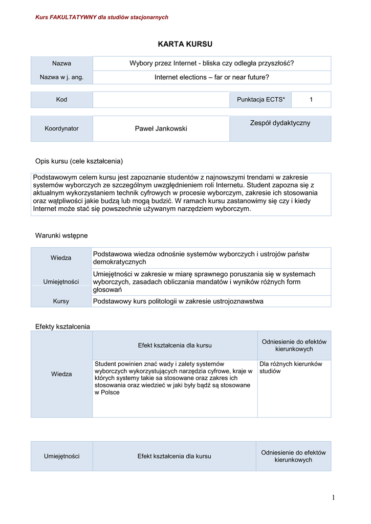 Kurs FAKULTATYWNY dla studiów stacjonarnych KARTA KURSU Nazwa Wybory przez Internet - bliska czy odległa przyszłość? Nazwa w j. ang. Internet elections – far or near future? Kod Punktacja ECTS* Paweł Jankowski Koordynator 1 Zespół dydaktyczny Opis kursu (cele kształcenia) Podstawowym celem kursu jest zapoznanie studentów z najnowszymi trendami w zakresie systemów wyborczych ze szczególnym uwzględnieniem roli Internetu. Student zapozna się z aktualnym wykorzystaniem technik cyfrowych w procesie wyborczym, zakresie ich stosowania oraz wątpliwości jakie budzą lub mogą budzić. W ramach kursu zastanowimy się czy i kiedy Internet może stać się powszechnie używanym narzędziem wyborczym. Warunki wstępne Wiedza Umiejętności Kursy Podstawowa wiedza odnośnie systemów wyborczych i ustrojów państw demokratycznych Umiejętności w zakresie w miarę sprawnego poruszania się w systemach wyborczych, zasadach obliczania mandatów i wyników różnych form głosowań Podstawowy kurs politologii w zakresie ustrojoznawstwa Efekty kształcenia Efekt kształcenia dla kursu Wiedza Student powinien znać wady i zalety systemów wyborczych wykorzystujących narzędzia cyfrowe, kraje w których systemy takie sa stosowane oraz zakres ich stosowania oraz wiedzieć w jaki były bądź są stosowane w Polsce Umiejętności Efekt kształcenia dla kursu Odniesienie do efektów kierunkowych Dla różnych kierunków studiów Odniesienie do efektów kierunkowych 1 Kurs FAKULTATYWNY dla studiów stacjonarnych Powinien umieć wskazać kraje w których wykorzystuje Dla różnych kierunków się Internet w procesie wyborczym, wskazać korzyści studiów płynące z takiego wykorzystania jak i potencjalne zagrożenia. Powinien także umieć odnieść doświadczenia innych krajów w wykorzystaniu narzędzi cyfrowych w wyborach do polskiego systemu wyborczego Odniesienie do efektów kierunkowych Efekt kształcenia dla kursu Kompetencje społeczne Umieć wykorzystać wiedze zdobytą podczas kursu w trakcie swojej pracy naukowej a także podczas wyborów spotykając się na gruncie praktycznym z cyfrowymi narzędziami wyborczymi i wspomagającymi wybory. Dla różnych kierunków studiów Organizacja Forma zajęć Ćwiczenia w grupach Wykład (W) A Liczba godzin K - L S P E 15 2 Kurs FAKULTATYWNY dla studiów stacjonarnych Opis metod prowadzenia zajęć Podstawową metodą będzie wykład konwersatoryjny ze względu na specyfikę tematu. W ramach dyskusji z wykładowcą wypracowana powinna zostać wizja użycia technik cyfrowych w procesie wyborczym oraz omówione szansę na ich szersze wprowadzenie. Inne Egzamin pisemny Egzamin ustny Praca pisemna (esej) Referat Udział w dyskusji Projekt grupowy Projekt indywidualny X W01 W02 W03 W04 U01 U02 U03 K01 K02 Kryteria oceny Praca laboratoryjna Zajęcia terenowe Ćwiczenia w szkole Gry dydaktyczne E – learning Formy sprawdzania efektów kształcenia X X Obecność na zajęciach oraz stopień zaangażowania w dyskusję Uwagi Treści merytoryczne (wykaz tematów) - głosowanie elektroniczne a głosowanie internetowe - formy głosowania cyfrowego - elektroniczne systemy wspierania wyborów - kraje wykorzystujące Internet w procesie wyborczym - podstawowe korzyści płynące z głosowania elektronicznego - główne zagrożenia wynikające z głosowania elektronicznego - potencjalne zmiany ustrojowe mogące wyniknąć z nowych form głosownia - możliwości przeniesienia doświadczeń z użycia Internetu w procesie wyborczym na grunt Polski Wykaz literatury podstawowej E. Gdulewicz, W.Skrzydło „Ustroje Państw Współczesnych”, Wydawnictwo UMCS Kancelaria Senatu, Biuro Analiz i Dokumentacji, „Koncepcje Systemów Wyborczych”, 2010 Kancelaria Senatu Wykaz literatury uzupełniającej 3 Kurs FAKULTATYWNY dla studiów stacjonarnych Barbara Simons “Internet Voting: An Idea whose Time has NOT Come” The Internet, Policy & Politics Conference 2010 R. Michael Alvareza, Thad E. Halla and Alexander H. Trechsel, “Internet Voting in Comparative Perspective: The Case of Estonia”, Political Science & Politics,Volume 42, Issue 03, July 2009, pp 497-505 AH Trechsel, U Gasser “Casting Votes on the Internet: Switzerland and the Future of Elections” Harvard International Review, Spring 2013 Bryan Mercurio (2003) “Democracy in Decline: Can Internet Voting Save the Electoral Process” http://tinyurl.com/hrqzm7w Bilans godzinowy zgodny z CNPS (Całkowity Nakład Pracy Studenta) Wykład Ilość godzin w kontakcie z prowadzącymi Konwersatorium (ćwiczenia, laboratorium itd.) 15 Pozostałe godziny kontaktu studenta z prowadzącym Lektura w ramach przygotowania do zajęć Ilość godzin pracy studenta bez kontaktu z prowadzącymi Przygotowanie krótkiej pracy pisemnej lub referatu po zapoznaniu się z niezbędną literaturą przedmiotu Przygotowanie projektu lub prezentacji na podany temat (praca w grupie) Przygotowanie do egzaminu Ogółem bilans czasu pracy 15 Ilość punktów ECTS w zależności od przyjętego przelicznika 1 4