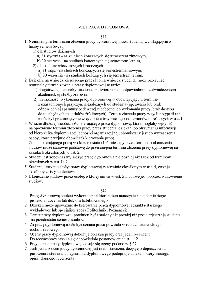 VII. PRACA DYPLOMOWA §41 1. Nominalnymi terminami złożenia pracy dyplomowej przez studenta, wynikającymi z liczby semestrów, są: 1) dla studiów dziennych a) 31 stycznia - na studiach kończących się semestrem zimowym, b) 30 czerwca - na studiach kończących się semestrem letnim, 2) dla studiów wieczorowych i zaocznych a) 31 maja - na studiach kończących się semestrem zimowym, b) 30 września - na studiach kończących się semestrem letnim. 2. Dziekan, na wniosek kierującego pracą lub na wniosek studenta, może przesunąć nominalny termin złożenia pracy dyplomowej w razie: 1) długotrwałej choroby studenta, potwierdzonej odpowiednim zaświadczeniem akademickiej służby zdrowia, 2) niemożności wykonania pracy dyplomowej w obowiązującym terminie z uzasadnionych przyczyn, niezależnych od studenta (np. awaria lub brak odpowiedniej aparatury badawczej niezbędnej do wykonania pracy, brak dostępu do niezbędnych materiałów źródłowych). Termin złożenia pracy w tych przypadkach może być przesunięty nie więcej niż o trzy miesiące od terminów określonych w ust. l 3. W razie dłuższej nieobecności kierującego pracą dyplomową, która mogłaby wpłynąć na opóźnienie terminu złożenia pracy przez studenta, dziekan, po otrzymaniu informacji od kierownika dyplomującej jednostki organizacyjnej, obowiązany jest do wyznaczenia osoby, która przyjmie obowiązek kierowania pracą. Zmiana kierującego pracą w okresie ostatnich 6 miesięcy przed terminem ukończenia studiów może stanowić podstawę do przesunięcia terminu złożenia pracy dyplomowej na zasadach określonych w ust. 2. 4. Student jest zobowiązany złożyć pracę dyplomową nie później niż l rok od terminów określonych w ust. l i 2. 5. Student, który nie złożył pracy dyplomowej w terminie określonym w ust. 4, zostaje skreślony z listy studentów. 6. Ukończenie studiów przez osobę, o której mowa w ust. 5 możliwe jest poprzez wznowienie studiów. l 2. 3. 4. 5. 6. 7. §42 Pracę dyplomową student wykonuje pod kierunkiem nauczyciela akademickiego: profesora, docenia lub doktora habilitowanego Dziekan może upoważnić do kierowania pracą dyplomową: adiunkta-starszego wykładowcę lub specjalistę spoza Politechniki Poznańskiej Temat pracy dyplomowej powinien być ustalony nie później niż przed rejestracją studenta na przedostatni semestr studiów Za pracę dyplomową może być uznana praca powstała w ramach studenckiego ruchu naukowego. Oceny pracy dyplomowej dokonuje opiekun pracy oraz jeden recenzent Do recenzentów stosuje się odpowiednio postanowienia ust. l i 2. Przy ocenie pracy dyplomowej stosuje się oceny podane w § 27. Jeśli jedna z ocen pracy dyplomowej jest niedostateczna, decyzję o dopuszczeniu puszczeniu studenta do egzaminu dyplomowego podejmuje dziekan, który zasięga opinii drugiego recenzenta.