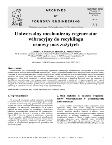 ARCHIVES of FOUNDRY ENGINEERING Published quarterly as the organ of the Foundry Commission of the Polish Academy of Sciences ISSN (1897-3310) Volume 12 Special Issue 1/2012 15 – 20 3/1 Uniwersalny mechaniczny regenerator wibracyjny do recyklingu osnowy mas zużytych J. Dańko*, R. Dańko*, M. Holtzer*, K. Matuszewski** AGH Akademia Górniczo-Hutnicza w Krakowie Wydział Odlewnictwa, 30-059 Kraków, ul. Reymonta 23 ** Ofama VIBRA Opole sp. z o. o., 45-864 Opole, ul. Niemodlińska 87 Kontakt korespondencyjny: e-mail [email protected] Otrzymano 16.04.2012; zaakceptowano do druku 02.07.2012 Streszczenie Przedstawiono opis uniwersalnego mechanicznego regeneratora wibracyjnego zintegrowanego funkcjonalnie z klasyfikatorem pneumatycznym służącego do suchej obróbki regeneracyjnej i odzysku głównego składnika zużytej mas formierskiej, którym jest osnowa kwarcowa. W obrębie urządzenia zostały zintegrowane dwie grupy operacji regeneracyjnych (wstępna i właściwa) oraz operacja odpylenia regeneratu na drodze klasyfikacji pneumatycznej. Wskazano na elementy innowacyjne w stosunku do istniejących rozwiązań regeneratorów wibracyjnych szczególnie w zakresie automatycznego sterowania wydajnością dozowania masy po regeneracji do klasyfikatora pneumatycznego oraz programowania intensywności regeneracji w zależności od regenerowalności masy zużytej. Opracowany regenerator może być wykorzystywany w gniazdach regeneracji jako autonomiczne urządzenie do kruszenia i regeneracji zużytych mas chemoutwardzalnych pozbawionych zanieczyszczeń metalowych lub jako element bardziej rozbudowanego systemu regeneracji, w którym do wybijania pakietów masy stosuje się odrębną kratę. Słowa kluczowe: regenerator masy zużytej, regeneracja, masa formierska; odpady 1. Wprowadzenie W procesach regeneracji suchej mechanizm uwalniania powierzchni ziaren od warstw (otoczek) zużytego spoiwa polega na poddaniu rozdrobnionej masy, pozbawionej zanieczyszczeń metalowych i innych, oddziaływaniom najczęściej o charakterze atrycyjnym i/lub abrazyjnym, odbywającym się w wyniku działania na ziarna osnowy sił zewnętrznych wywołanych działaniem urządzenia (udar mechaniczny lub pneumatyczny, drgania wibracyjne, ścieranie i ocieranie w złożu fluidyzacyjnym) [1–4]. Procesy związane z usunięciem z regeneratu pyłowych produktów obróbki i nieużytecznych technologicznie - bardzo drobnych z frakcji osnowy kwarcowej noszące nazwę klasyfikacji, są najczęściej realizowane sposobem pneumatycznym w klasyfikatorach przepływowych poziomych lub fluidyzacyjnych [3]. 2. Stan techniki w zakresie regeneratorów wibracyjnych o przeznaczeniu uniwersalnym Spośród urządzeń uniwersalnych produkowanych przez znane, zagraniczne firmy warto zwrócić uwagę na rozwiązania wibracyjnych urządzeń do regeneracji mechanicznej osnowy z mas zużytych, mających charakter urządzeń w pewnym sensie autonomicznych, nadających się do wyposażenia gniazd regeneracji mas zużytych ze spoiwami organicznymi i nieorganicznymi utwardzanymi chemicznie. Można tu między innymi wymienić kruszarkę wibracyjną typu Vibra-Mill firmy GENERAL KINEMATICS (USA) (rys. 1) oraz kruszarkę wibracyjna typu Vibrader firmy RICHARDS ENGINEERING Inc. (Anglia) (rys. 2). ARCHIVES of FOUNDRY ENGINEERING Volume 1 2, Special Issue 1/2012 15 a) Rys. 2. Schemat kruszarki wibracyjnej typu Vibrader HD: 1 – zbiornik ścierający, 2-zespół sprężyn, 3 – napęd wibracyjny, 4 –wymienna krata, 5 – przegroda rusztowa do zgrubnego rozdrabniania, 6 – sito szczelinowe, 7 – otwory rewizyjne , 8 – przegroda do regulacji grubości warstwy materiału, 9 – sito, 10 – otwór wylotowy 3. Charakterystyka uniwersalnego mechanicznego regeneratora wibracyjnego opracowanego w ramach projektu REGMAS b) Rys. 1. Widok (a) i schemat (b) kruszarki wibracyjnej typu Vibra-Mill model VMC: 1- podstawa konstrukcji, 2- napęd wibracyjny rotodynamiczny dwumasowy, 3 – sprężyny spiralne, 4 – obudowa kruszarki, 5 – przegroda wstępnego przesiewania, 6 – sita przesiewacza gotowego produktu, 7 – odciąg zapylonego powietrza, 8 – odchylna klapa do usuwania odpadów nie podlegających rozdrobnieniu, 9 – odbiór regeneratu, 10 –napęd klapy, 11 – zbrylenia masy zużytej. 16 Uniwersalny regenerator wibracyjny REGMAS, zintegrowany funkcjonalnie z przepływowym klasyfikatorem kaskadowym jest przeznaczony do regeneracji mechanicznej suchej praktycznie każdej masy zużytej, instalowanej w gniazdach regeneracji małych i średnich odlewni. Schemat konstrukcyjny prototypowego regeneratora REGMAS przedstawiono na rysunku 3, a widok urządzenia bez klasyfikatora kaskadowego i osłony zewnętrznej na rysunku 4. Opisane urządzenie składa się z kwadratowej ramy podstawy (1), do której przymocowane są 4 pionowe podpory (3) wsporników oscylacyjnych (4), podtrzymujących płytę konstrukcji nośnej urządzenia (5), składającego się z kolumny wewnętrznej regeneratora (6), cylindrycznej obudowy (7) z nałożoną spiralnie na jej powierzchni zewnętrzną rynną transportową (8) i osłoną rynny (9) oraz pneumatycznego klasyfikatora kaskadowego (10) zamocowanego poprzez wspornik (11) na występie (2) ramy podstawy i dozownika ślimakowego (12), posadowionego na pionowym wsporniku dozownika (13). Kolumna wewnętrzna (6) składa się z trzech segmentów (członów) z kołnierzami, połączonych w ten sposób, że tworzą cylindryczną całość. Zbiornik masy zużytej (15) jest umieszczony na segmencie górnym kolumny (14). Dno zbiornika masy stanowi krata rozkruszająca pakiety form (16). Dwa pozostałe sita płaskie o malejącym prześwicie oczek są w rejonie połączenia segmentu górnego z segmentem środkowym kolumny (17) oraz segmentu środkowego z segmentem dolnym (18). Na wysokości sita środkowego w ścianie bocznej segmentu środkowego znajduje się otwór rewizyjny (21) o wymiarach pozwalających na boczny dostęp do górnej płas