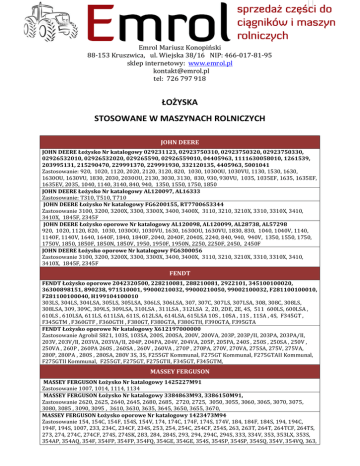 Emrol Mariusz Konopiński 88-153 Kruszwica, ul. Wiejska 38/16 NIP: 466-017-81-95 sklep internetowy: www.emrol.pl [email protected] tel: 726 797 918 ŁOŻYSKA STOSOWANE W MASZYNACH ROLNICZYCH JOHN DEERE JOHN DEERE Łożysko Nr katalogowy 029231123, 02923750310, 02923750320, 02923750330, 02926532010, 02926532020, 029265590, 02926559010, 04405963, 1111630058010, 1261539, 203995131, 215290470, 229991370, 229991930, 332120135, 4405963, 5001041 Zastosowanie: 920, 1020, 1120, 2020, 2120, 3120, 820, 1030, 1030OU, 1030VU, 1130, 1530, 1630, 1630OU, 1630VU, 1830, 2030, 2030OU, 2130, 3030, 3130, 830, 930, 930VU, 1035, 1035EF, 1635, 1635EF, 1635EV, 2035, 1040, 1140, 3140, 840, 940, 1350, 1550, 1750, 1850 JOHN DEERE Łożysko Nr katalogowy AL120097, AL16333 Zastosowanie: T310, T510, T710 JOHN DEERE Łożysko Nr katalogowy FG6200155, RT7700653344 Zastosowanie 3100, 3200, 3200X, 3300, 3300X, 3400, 3400X, 3110, 3210, 3210X, 3310, 3310X, 3410, 3410X, 1845F, 2345F JOHN DEERE Łożysko oporowe Nr katalogowy AL120098, AL120099, AL28738, AL57298 920, 1020, 1120, 820, 1030, 1030OU, 1030VU, 1630, 1630OU, 1630VU, 1830, 830, 1040, 1040V, 1140, 1140F, 1140V, 1640, 1640F, 1840, 1840F, 2040, 2040F, 2040S, 2240, 840, 940, 940V, 1350, 1550, 1750, 1750V, 1850, 1850F, 1850N, 1850V, 1950, 1950F, 1950N, 2250, 2250F, 2450, 2450F JOHN DEERE Łożysko oporowe Nr katalogowy FG6300056 Zastosowanie 3100, 3200, 3200X, 3300, 3300X, 3400, 3400X, 3110, 3210, 3210X, 3310, 3310X, 3410, 3410X, 1845F, 2345F FENDT FENDT Łożysko oporowe 2042320500, 228210081, 288210081, 2922101, 345100100020, 36300898151, 890238, 971510001, 99000210032, 99000210050, 99002100032, F281100100010, F281100100040, H199104100010 303LS, 304LS, 304LSA, 305LS, 305LSA, 306LS, 306LSA, 307, 307C, 307LS, 307LSA, 308, 308C, 308LS, 308LSA, 309, 309C, 309LS, 309LSA, 310LSA , 311LSA , 312LSA 2, 2D, 2DE, 2E, 4S, 511 600LS, 600LSA , 610LS , 610LSA, 611LS, 611LSA, 611S, 612LSA, 614LSA, 615LSA 10S , 10SA , 11S , 11SA , 4S, F345GT , F345GTM , F360GTF , F360GTH , F380GT, F380GTA, F380GTH, F390GTA, F395GTA FENDT Łożysko oporowe Nr katalogowy X612197000000 Zastosowanie Agrobil S821, 103S, 103SA, 200S, 200SA, 200V, 200VA, 203P, 203P/II, 203PA, 203PA/II, 203V, 203V/II, 203VA, 203VA/II, 204P, 204PA, 204V, 204VA, 205P, 205PA, 240S , 250S , 250SA , 250V , 250VA , 260P , 260PA 260S , 260SA , 260V , 260VA , 270P , 270PA, 270V, 270VA, 275SA, 275V, 275VA, 280P, 280PA , 280S , 280SA, 280V 3S, 3S, F255GT Kommunal, F275GT Kommunal, F275GTAII Kommunal, F275GTII Kommunal, F255GT, F275GT, F275GTII, F345GT, F345GTM, MASSEY FERGUSON MASSEY FERGUSON Łożysko Nr katalogowy 1425227M91 Zastosowanie 1007, 1014, 1114, 1134 MASSEY FERGUSON Łożysko Nr katalogowy 3384863M93, 3386150M91, Zastosowanie 2620, 2625, 2640, 2645, 2680, 2685, 2720, 2725, 3050, 3055, 3060, 3065, 3070, 3075, 3080, 3085 , 3090, 3095 , 3610, 3630, 3635, 3645, 3650, 3655, 3670, MASSEY FERGUSON Łożysko oporowe Nr katalogowy 1423473M94 Zastosowanie 154, 154C, 154F, 154S, 154V, 174, 174C, 174F, 174S, 174V, 184, 184F, 184S, 194, 194C, 194F, 194S, 1007, 233, 234C, 234CF, 234S, 253, 254, 254C, 254CF, 254S, 263, 263T, 264T, 264TCF, 264TS, 273, 274, 274C, 274CF, 274S, 274SK, 283, 284, 284S, 293, 294, 294C, 294S, 333, 334V, 353, 353LX, 353S, 354AP, 354AQ, 354F, 354FP, 354FP, 354FQ, 354GE, 354GE, 354S, 354SP, 354SP, 354SQ, 354V, 354VQ, 363, 364AP, 364AQ, 364CF, 364F, 364FP, 364FQ, 364GE, 364S, 364SP, 364SQ, 364V, 364VQ, 367CF, 373, 373LX, 373S, 374AP, 374AP, 374AQ, 374F, 374FP, 374FP, 374FQ, 374GE, 374GE, 374H, 374S, 374SP, 374SP, 374SQ, 374V, 374VQ, 376C, 376CF, 376XCF, 377, 383, 383LX, 383S, 384AP, 384AP, 384AQ, 384F, 384FP, 384FP, 384FQ, 384GE, 384GE, 384S, 384SP, 384SP, 384SQ, 384V, 384VQ, 393, 393LX, 393S, 393TLX, 394AP, 394AP, 394AQ, 394C, 394F, 394FP, 394FP, 394FQ, 394GE, 394GE, 394S, 394SP, 394SP, 394SQ, 394TAQ, 396 MASSEY FERGUSON Łożysko oporowe Nr katalogowy 1861240M1, 1868225M1, 195508M1, 833084M1, 892862M3 Zastosowanie 130, 133, 135, 135V, 140, 145, 145S, 145V, 148, 152, 152F, 152S, 152V, 155, 158, 158F, 158MKIII, 158S, 158V, 165, 168, 168F, 168MKIII, 168S, 175, 175S, 178, 185, 188, 1004, 1004T, 1080, 1085, 230, 231, 235, 240, 245, 250, 253, 255, 260, 265, 275, 285, 285S, 290, 298, 265, 265 Advanced, 275, 275 Advanced, 340, 342, 350, 352, 355, 360, 362, 365, 375, 390, 390T, 396, 398, 399, 25, 30, 35, 65, FE35, 4215, 4220, 4225, 4225HV, 4235, 4235HV, 4240, 4245, 4245HV, 4255, 4255HV, 4260, 4265, 4270, 550, 560, 565, 575, 590, 592, 595, 675, 690, 698, 698T, 699, 765, 825, 835, 865, 30, Kombajn zbożowy: 240, 560, 565, 825, 835 MASSEY FERGUSON Łożysko oporowe Nr katalogowy 3302143M91 Zastosowanie 1014 MASSEY FERGUSON łożysko oporowe Nr katalogowy 3583491M1 Zastosowanie 3050, 3055, 3060, 3065, 3065S, 3070, 3075, 3080, 3085, 3090, 3095, 3610, 3630, 3635, 3650, 3655, 3660, 3670, 3680, 3690, MASSEY FERGUSON Łożysko oporowe Nr katalogowy 392191X1 Zastosowanie 1007, 1014, 1114, 1134 CASE CASE IH Łożysko Nr katalogowy 3147877R91 Zastosowanie: 644, 744, 844, 844S, 745, 845, 1046, 1246, 946, 1055, 1255 (Hydro Power ), 1455 (Hydro Power ), 955, 1056, 856, 956, 523, 553, 554, 624, 654, 724, 734, 743, 824, 834 CASE IH Łożysko oporowe Nr katalogowy 133700210066 33700210066 Zastosowanie D322, D323, D326, C42, C48, C55, C64, C70, CS48, CS52, CS58, CS63, CS68, CS75, CS78, CS86, CS94 CASE IH Łożysko oporowe Nr katalogowy 85104C91, 85104C92 Zastosowanie 3210, 3220, 3230, 4210, 4220, 4230, 4240, 1246, 1255, 1455, 484, 584, 684, 784, 884, 385, 485, 585, 685, 785, 885, 985, 395, 495, 595, 695, 795, 895, 995, C50, C60, C70, C80, C90, 454, 474, 475, 574, 674, CX100, CX50, CX60, CX70, CX80, CX90 CASE Łożysko Nr katalogowy 1966618C1, 24905350 Zastosowanie 2120, 2130, 2140, 2150, PJ55, PJ65, PJ75, PJN55, PJN65, PJN75, PJV55, PJV65, PJV75 CASE Łożysko Nr katalogowy 786532R91, CTJ6256 Zastosowanie 433, 533, 633, 733, 833, 933, 440, 540, 640, 740, 840, 940, D323, 353, 383, 423, 453 CASE Łożysko oporowe Nr katalogowy 1966557C1, 5122028