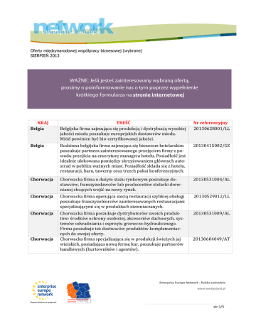 Oferty międzynarodowej współpracy biznesowej (wybrane) SIERPIEŃ 2013 KRAJ Belgia TREŚĆ Belgijska firma zajmująca się produkcją i dystrybucją wysokiej jakości miodu poszukuje europejskich dostawców miodu. Miód powinien być bio-certyfikowanej jakości. Nr referencyjny 20130628001/LL Belgia Rodzinna belgijska firma zajmująca się biznesem hotelarskim poszukuje partnera zainteresowanego przejęciem firmy z powodu przejścia na emeryturę managera hotelu. Posiadłość jest idealnie ulokowana pomiędzy skrzyżowaniem głównych autostrad w pobliżu ważnych miast. Posiadłość składa się z hotelu, restauracji, baru, tawerny oraz trzech pokoi konferencyjnych. 20130415002/GZ Chorwacja Chorwacka firma o dużym stażu rynkowym poszukuje dostawców, franszyzodawców lub producentów stolarki drewnianej chcących wejść na nowy rynek. 20130531004/AL Chorwacja Chorwacka firma operująca siecią restauracji szybkiej obsługi poszukuje franczyzobiorców zainteresowanych restauracjami specjalizującymi się w produktach ziemniaczanych. 20130529012/LL Chorwacja Chorwacka firma poszukuje dystrybutorów swoich produktów: środków ochrony osobistej, akcesoriów dachowych, systemów odwadniania i osprzętu grzewczo-hydraulicznego. Firma poszukuje też dostwaców produktów komplementarnych do swojej oferty. Chorwacka firma specjalizająca się w produkcji świeżych jaj wiejskich, posiadająca nową fermę kur, poszukuje partnerów handlowych (hurtowników i agentów). 20130531009/AL Chorwacja 20130604049/AT Enterprise Europe Network - Polska zachodnia www.westpoland.pl str.1/5 KRAJ Chorwacja Cypr TREŚĆ Chorwacka firma, największy producent technicznych wyrobów z gumy, produkowanych na prasach wtryskowych, oferuje usługi transportowe/logistuczne, joint venture i podwykonawstwo. Możliwa jest również sprzedaż udziałów lub całej firmy. Cypryjska firma zajmująca się eksportem produktów spożywczych (mrożone mięso, ryby) i innych produktów poszukuje producentów/dostawców, rzeźnie wołowiny, wieprzowiny, drobiu w Europie, Nr referencyjny 20130529022/AT 20130606017/MH Cypr Cypryjska firma zajmująca się przetwórstwem i produkcją szkła, która instaluje i sprzedaje artykuły szklane i szkło artystyczne szuka współpracy z firmami z branży, które mogłyby reprezentować i rozprowadzać produkty firmy. 20130603021/AL Dania Duńska firma produkuje na miejscu, szeroką gamę generatorów dezynfekujących, wykorzystujących technologię elektrolizy roztworu solanki. Opatentowany projekt komórek elektrolizy i system kontroli sprawia, że rozwiązanie nadaje się do szerokiej gamy zastosowań w nowoczesnej rzeczywistości 20130605020/JR Irlandia Irlandzka firma, projektująca i sprzedająca w Internecie unikalne opatentowanie produkty do ogrodu, wytworzyła nowy produkt, który chce wprowadzić na rynek. Firma poszukuje partnera, który pomógłby jej wprowadzić ten produkt na rynek. Izraelska firma oferuje tworzenie i optymalizację usług dla sformułowań i procesów rolniczych i związanych z naukami biologicznymi. Firma ta szerokie know-how w projektowaniu sformułowań odpowiednich do celów. Firma działa w sektorze farmaceutycznym, urządzeń medycznych, nutraceutyków, zdrowia zwierząt i rolniczym i wspiera je w wysiłkach R&D. Firma poszukuje współpracy z firmami nad projektami joint venture, a także dostarczeniem usług wytwarzania i produkcji we wspomnianej specjalizacji jako podwykonawca. Izraelska firma specjalizująca się w zapewnianiu wsparcia analitycznego i usług dla szerokiego zakresu usług rozwoju i programów wytwórczych. Firma działa w sektorze biotechnologii, farmacji i urządzeń medycznych i wspiera je w ich próbach R&D. Firma ta poszukuje joint venture z firmami i współpracy w projektach, a także zapewnia usługi rozwoju i wytwarzania we wspomnianych specjalizacjach jako podwykonawca. Wiodąca izraelska firma specjalizująca się w projektowaniu i wytwarzaniu matryc, obróbce plastycznej metalu na zimno cięciu drutów metodą EDM (maszyny do rozładowań elektrycznych), wierceniu EDM, wyginaniu metodą CNC, mikroobróbce laserowej, obróbce powierzchni, obróbce cieplnej, montowaniu produktów i podzespołów, oferuje usługi podwykonawstwa / outsourcingu dla firm z sektora obrony, lotnictwa i kosmonautyki, elektroniki, urządzeń medycznych, elektronicznego pakowania i komunikacji, produktów konsumenckich i obróbki metalu. 20130605019/AT Izrael Izrael Izrael 20130605006/GZ 20130521028/AL 20130610019/LL str.2/5 KRAJ Rumunia TREŚĆ Rumuńska firma specjalizująca się w produkcji kutego żelaza, ulicznych i ogrodowych mebli, kasetonów termicznych, termicznych obiektów przemysłowych zainteresowany jest podwykonawstwem oraz poszukuje partnerów z UE. Nr referencyjny 20130610030/LL Rumunia Rumuńska firma specjalizująca się w usługach reklam zewnętrznych poszukuje dostawców bilbordów reklamowych. Rumuński organizator podróży w delcie Dunaju poszukuje dystrybutorów swoich usług. Turecka firma specjalizująca się w tworzeniu światowej klasy międzyplatformowych zastosowań dla platform internetowych i telefonicznych, usługach konsultacyjnych dla klientów biznesowych i planująca wytwarzać gry i wiodąca jeżeli chodzi o doświadczenia użytkowników, poszukuje pośredników na rynku głównie wydawców sieciowych, którzy mogą prowadzić ją na ich lokalnych rynkach. Firma ta oferuje także czynności podwykonawstwa/outsourcingu. Turecka firma specjalizująca się w wytwarzaniu przełączników z krzywką oraz przełączników kołyskowych na rynek krajowy i międzynarodowy poszukuje partnerów, którzy chcieliby dystrybuować podobne produkty. Turecka firma, zaangażowana w handel produktami dla przemysłu spożywczego, tekstylnego, detergentów i przemysłowych produktów czyszczących, farmaceutycznego, rolnego, kosmetycznego i budowlanego poszukuje i oferuje usługi pośrednictwa na rynku i dystrybucji. Możliw